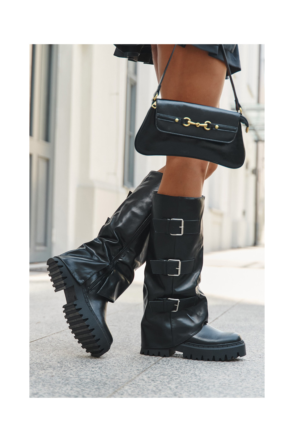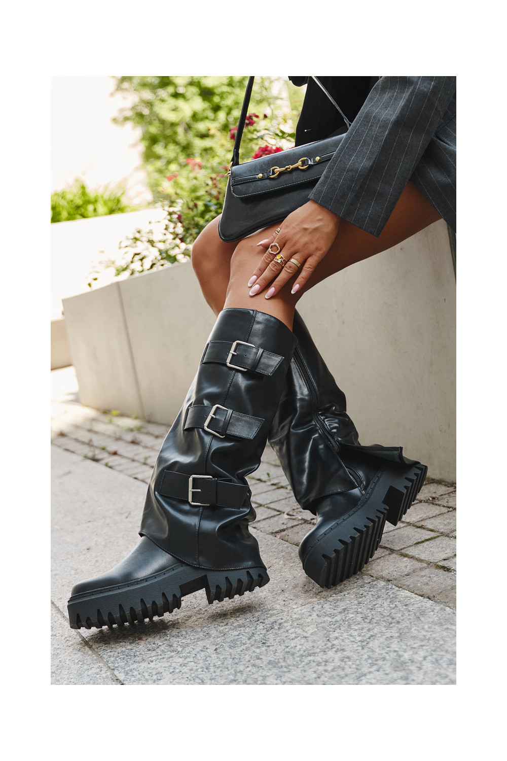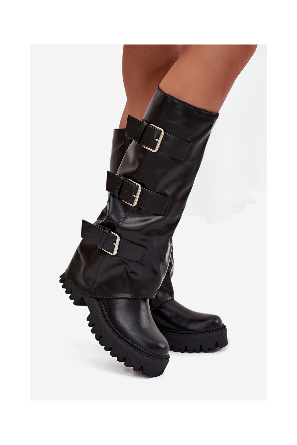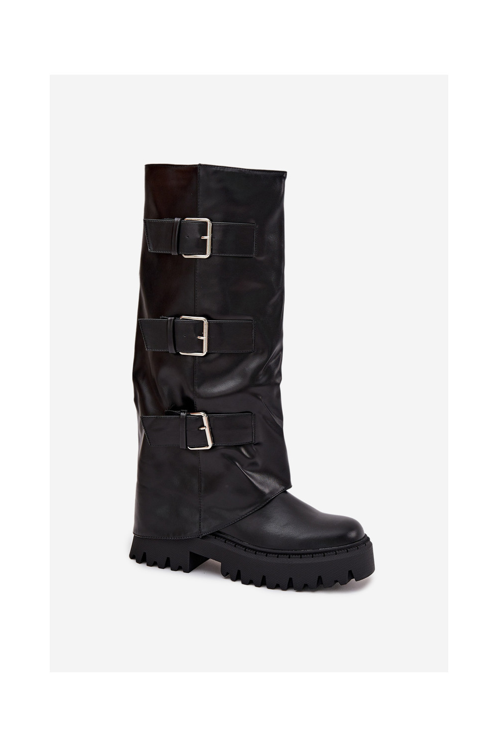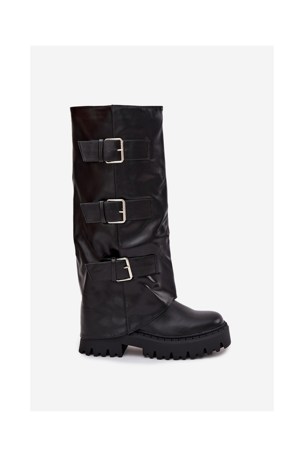 Pašiltinti moteriški ilgaauliai batai su sidabro spalvos sagtimis juodos spalvos "Isavine"
