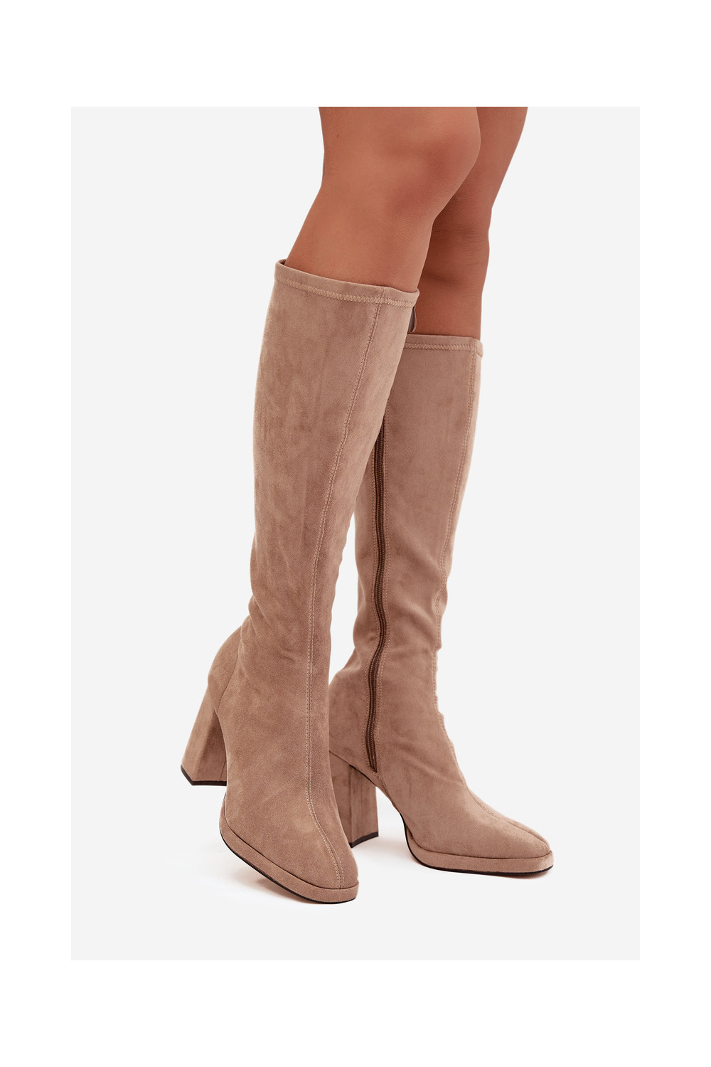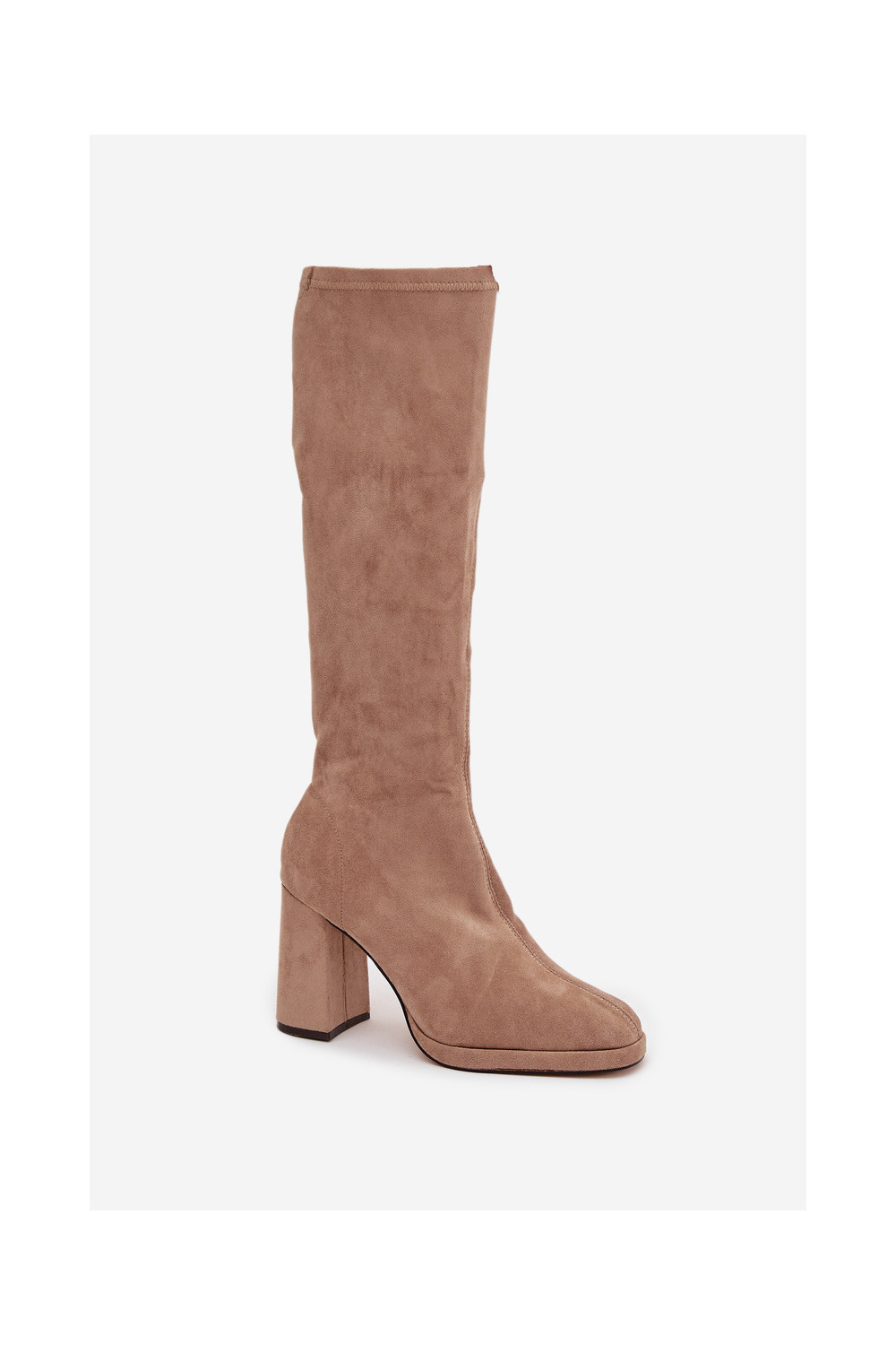 Moteriški ilgaauliai batai su siūlėmis ant stulpelio kulno smėlio spalvos "Brivana"