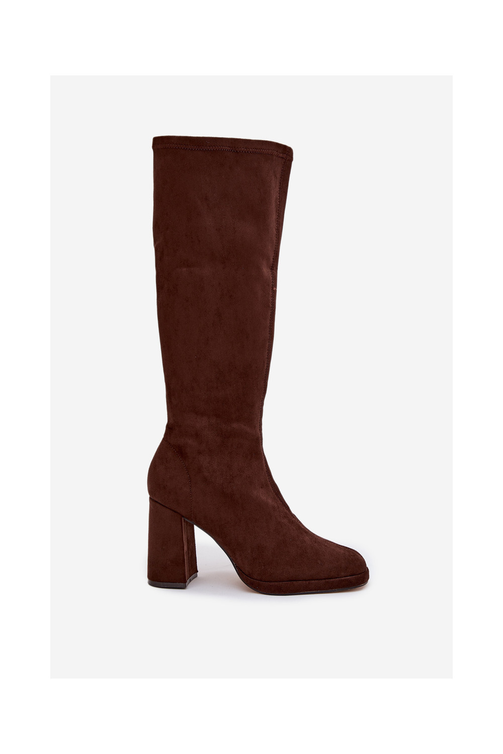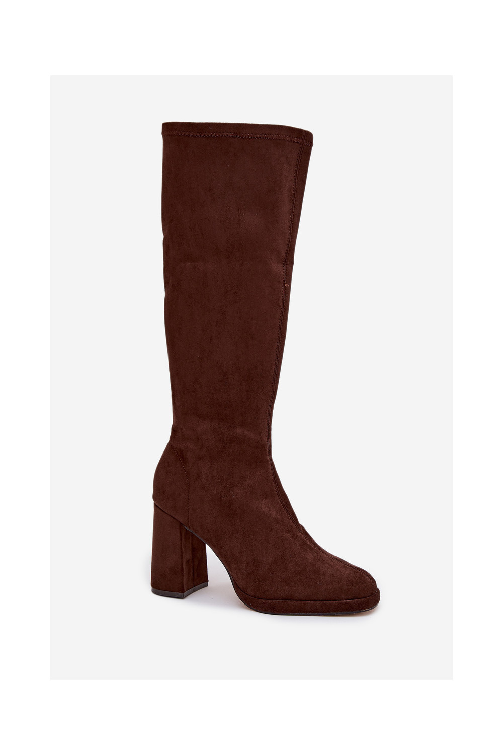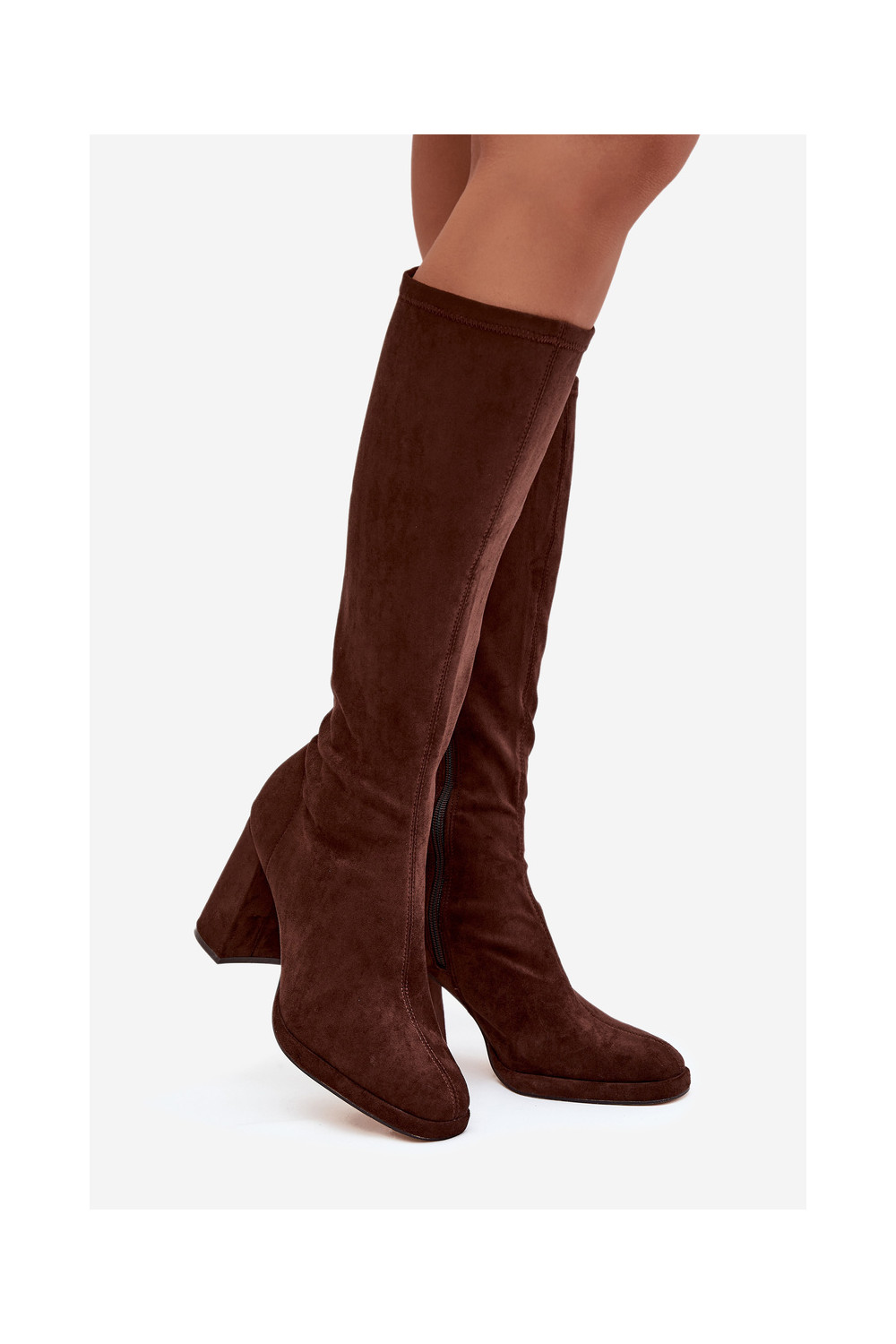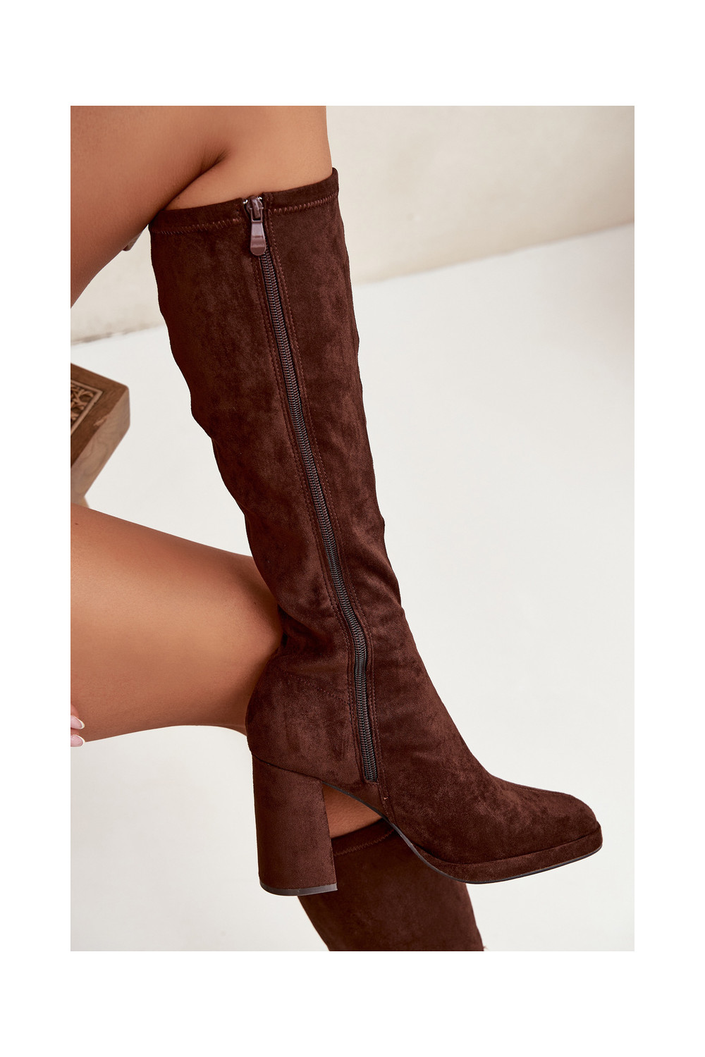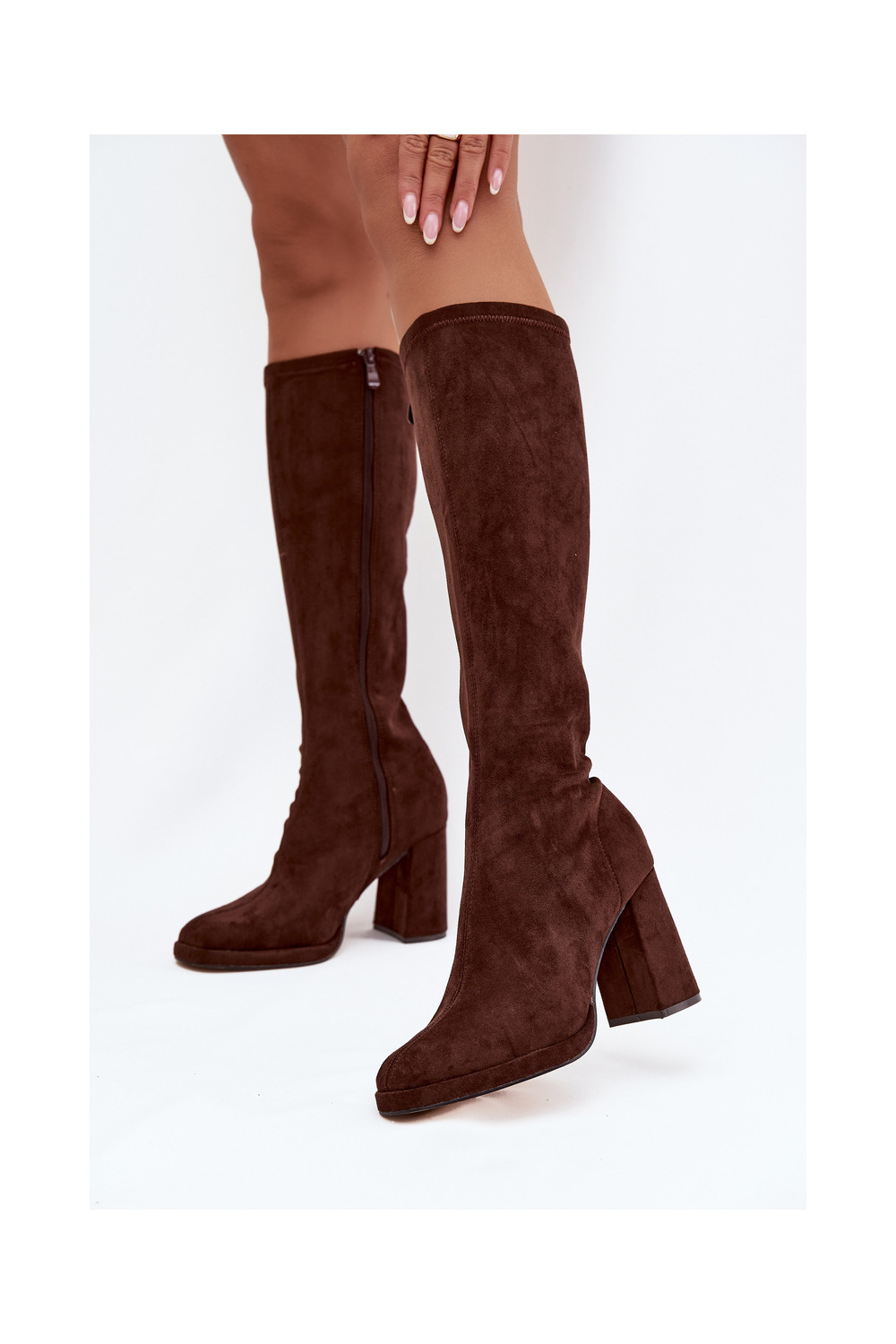 Moteriški ilgaauliai batai su siūlėmis ant stulpelio kulno rudos spalvos "Brivana"