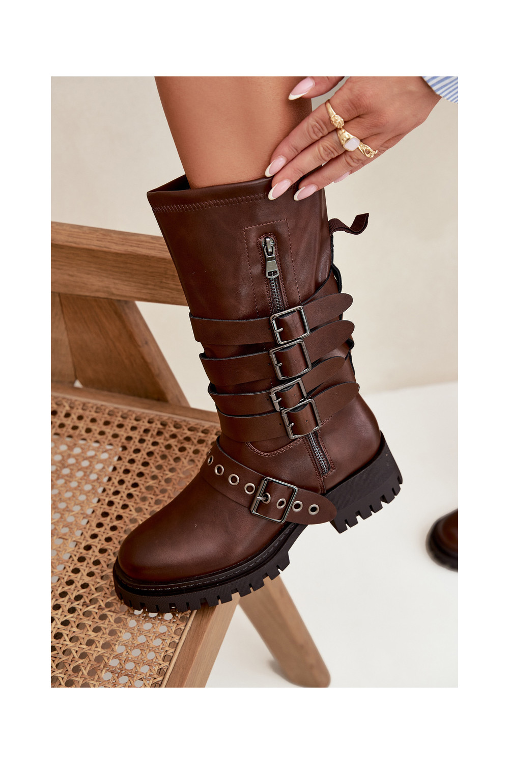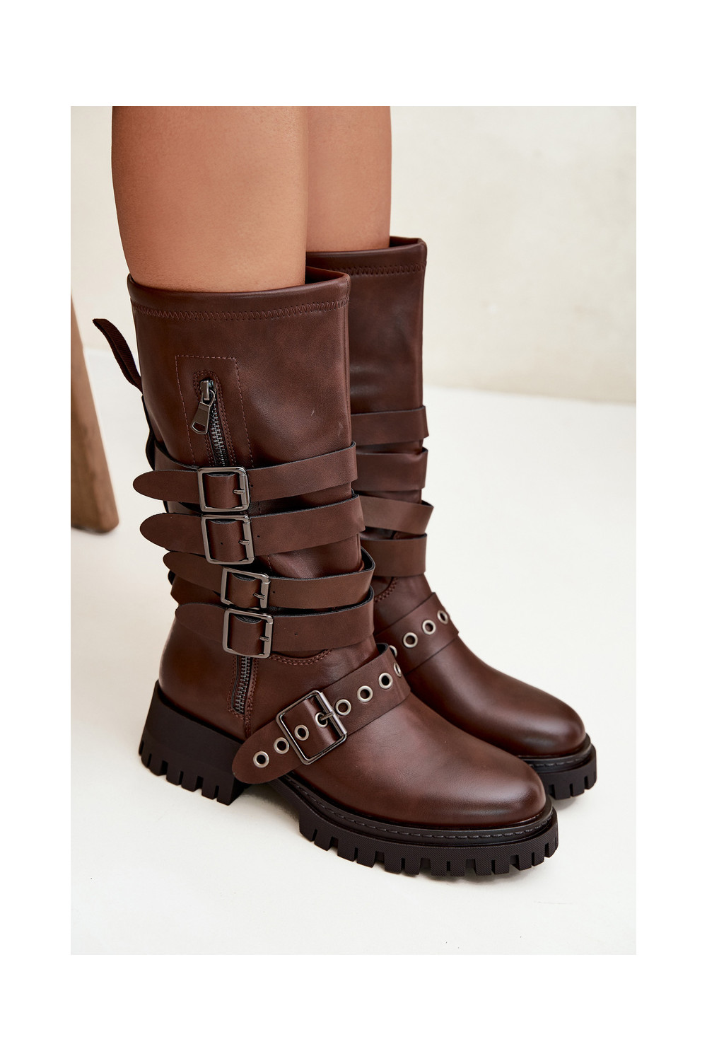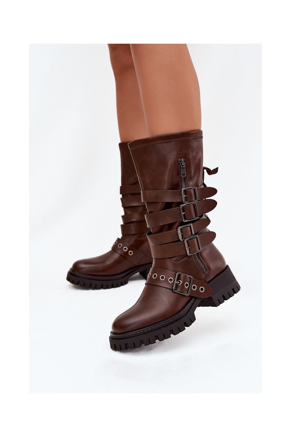 Rudos spalvos pašiltinti moteriški ilgaauliai batai su juostelėmis ir sagtimis „Ivaline"