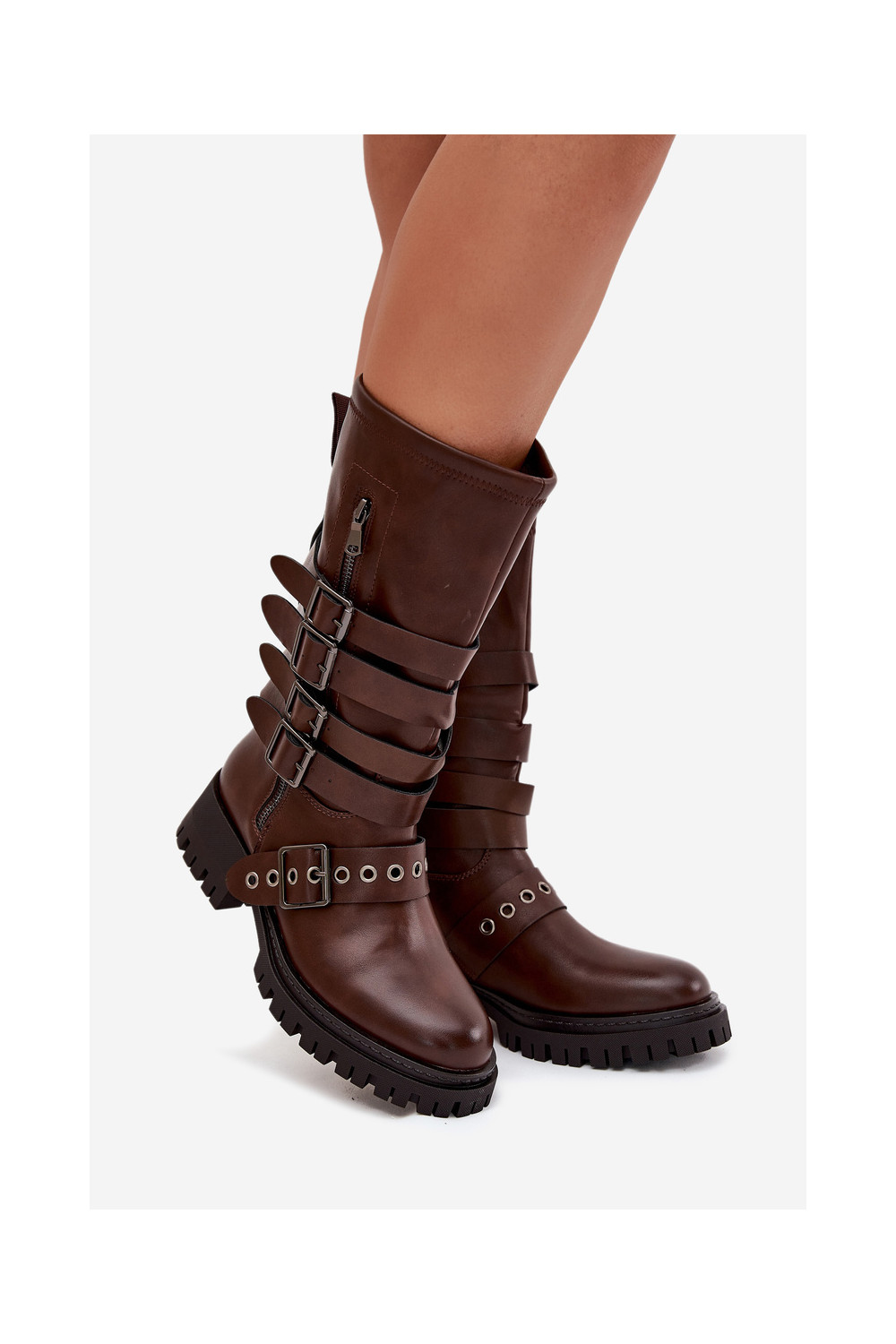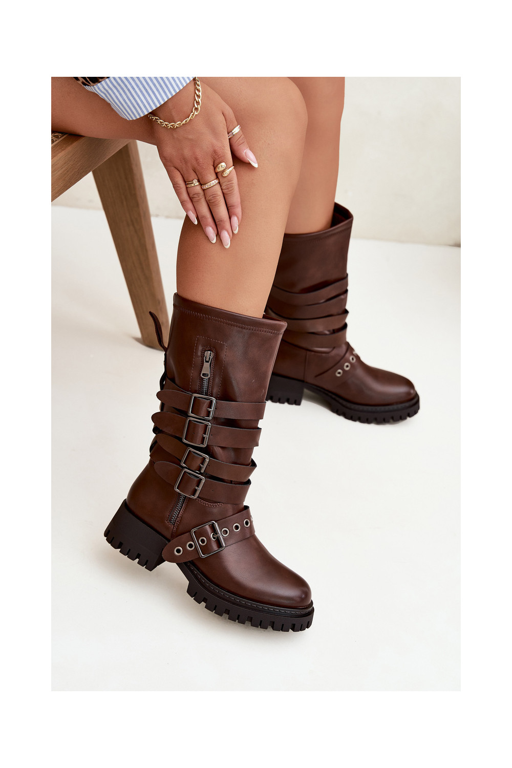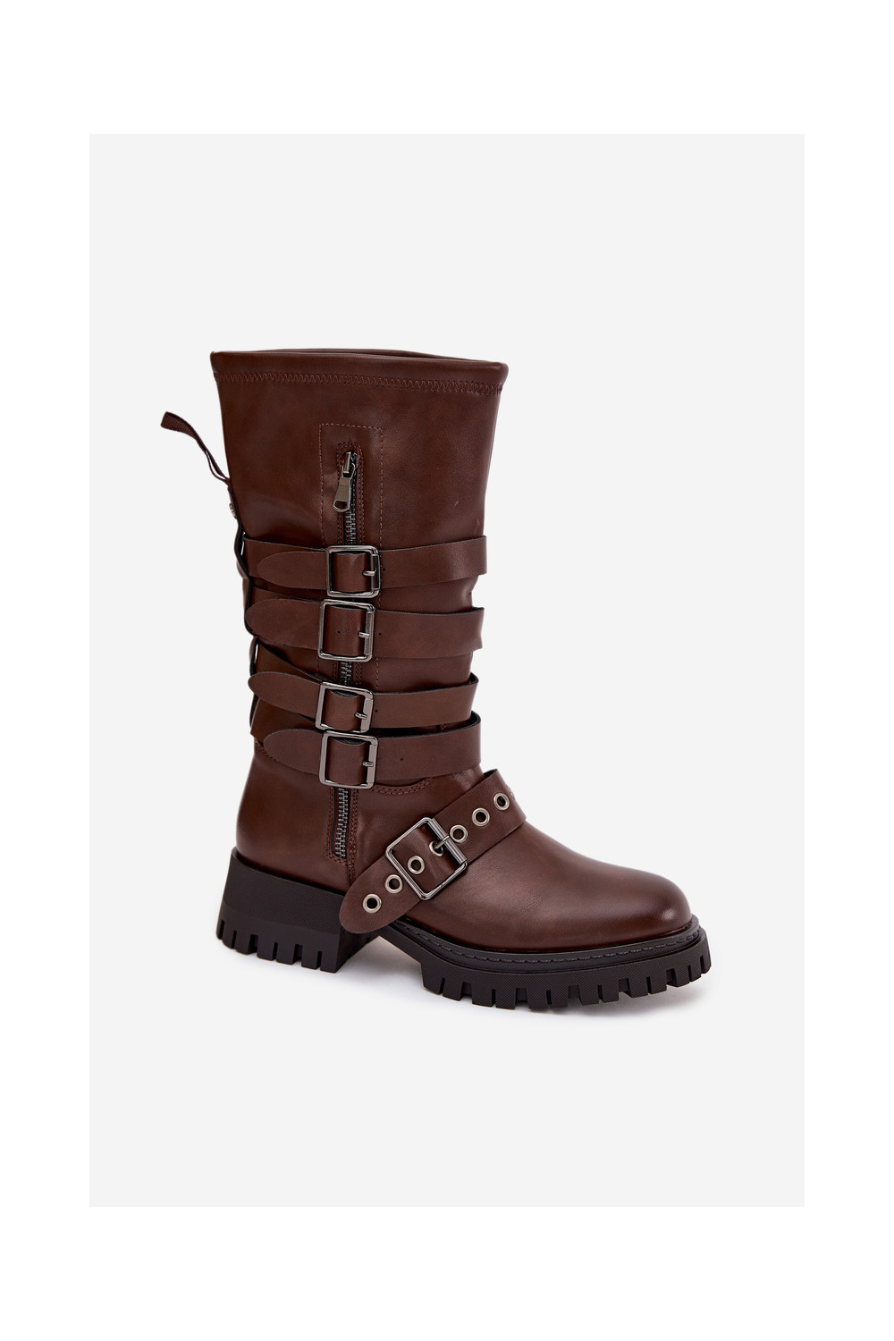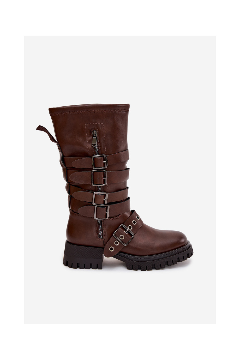 Rudos spalvos pašiltinti moteriški ilgaauliai batai su juostelėmis ir sagtimis „Ivaline"