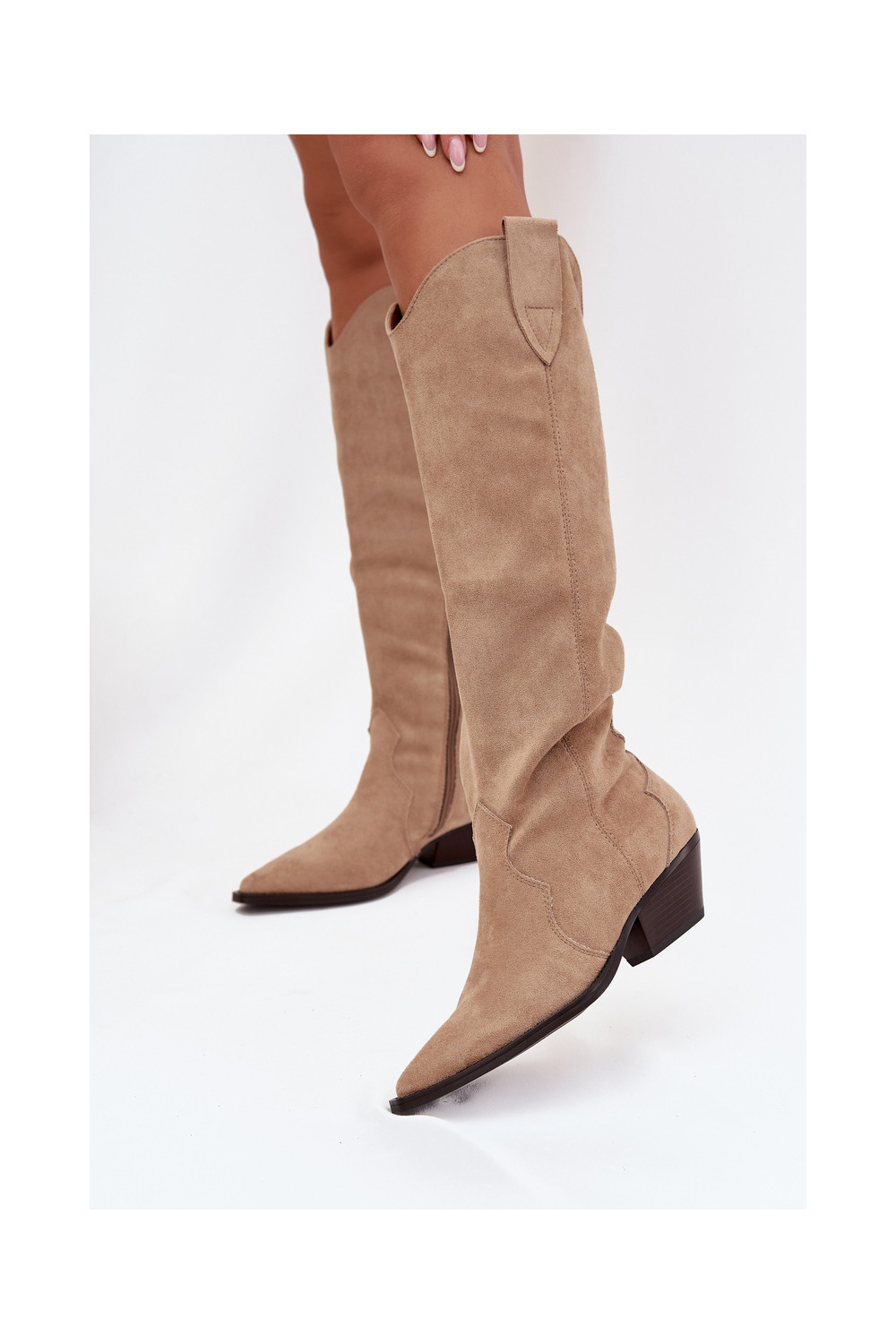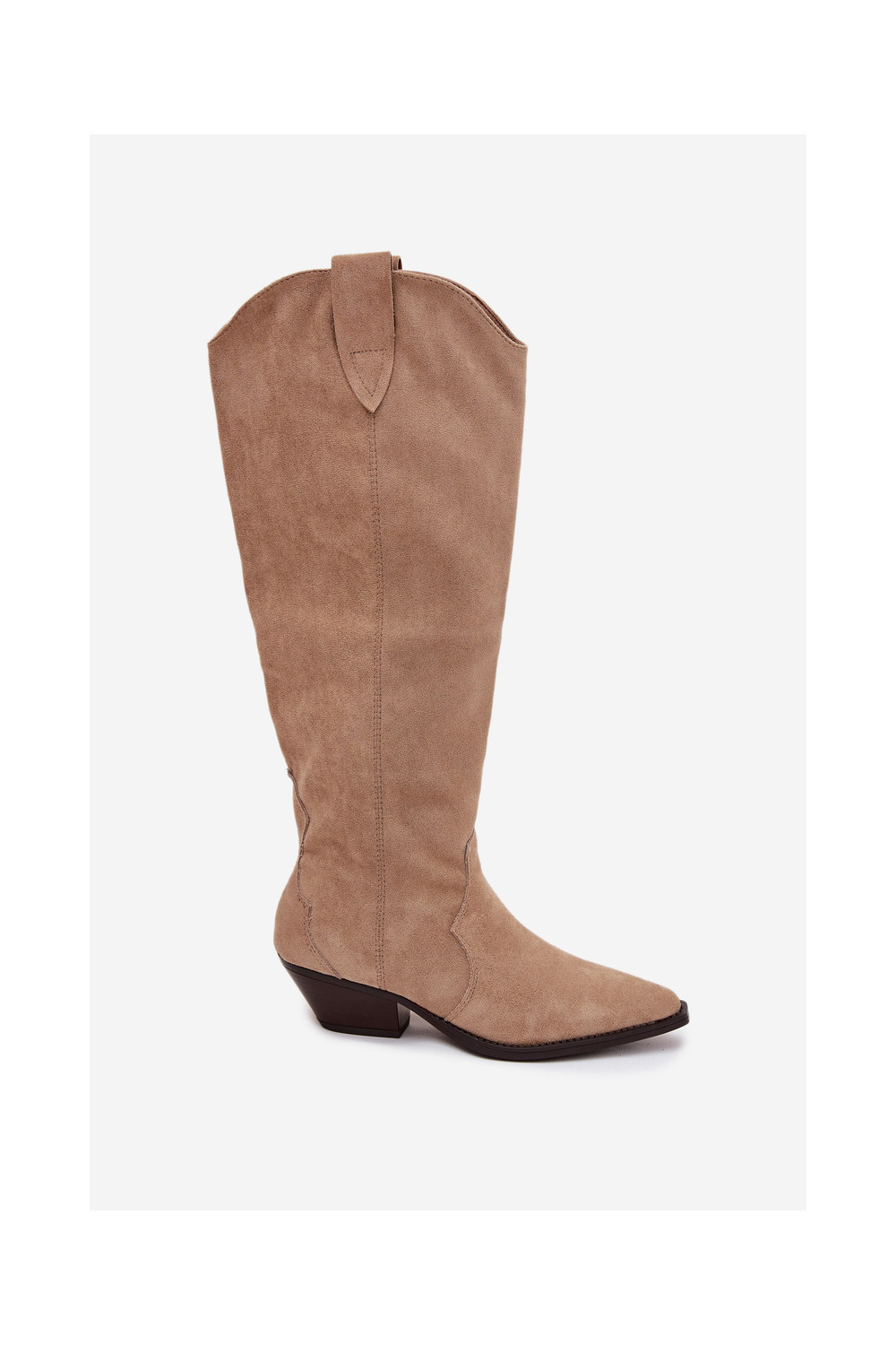 Pašiltinti ilgaauliai kaubojiško stiliaus batai su kulniukais iš dirbtinio zomšo smėlio spalvos Jovianne