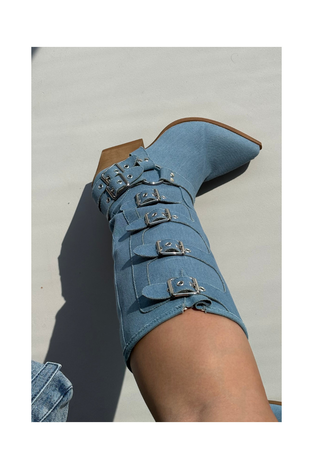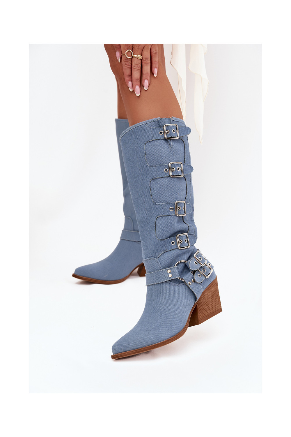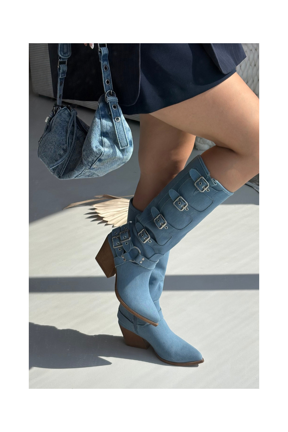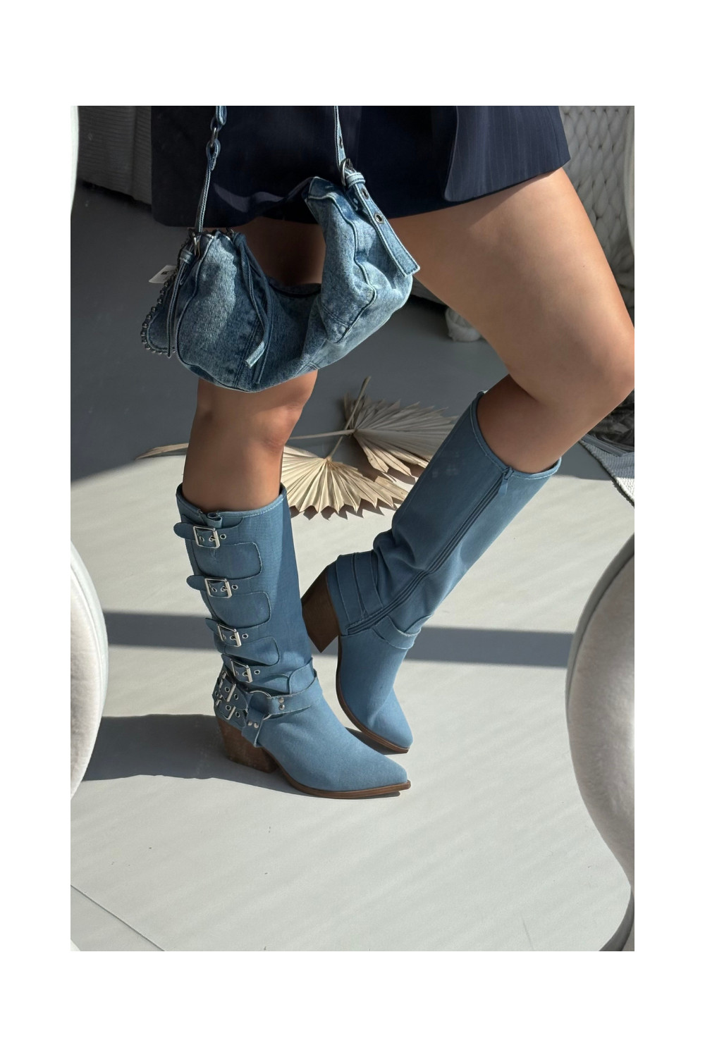 Kaubojiško stiliaus ilgaauliai batai su kulniukais ir sagtimis iš džinso medžiagos, Fivelle