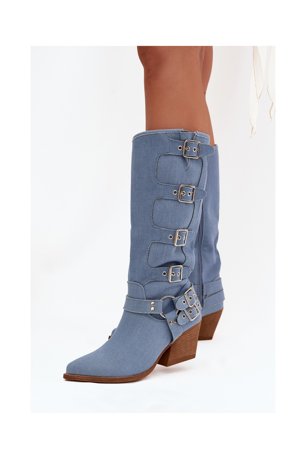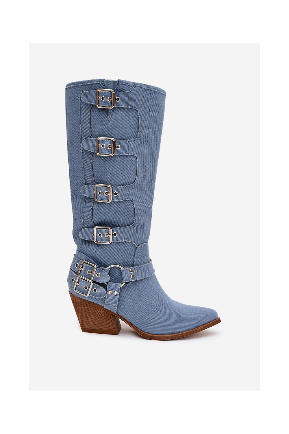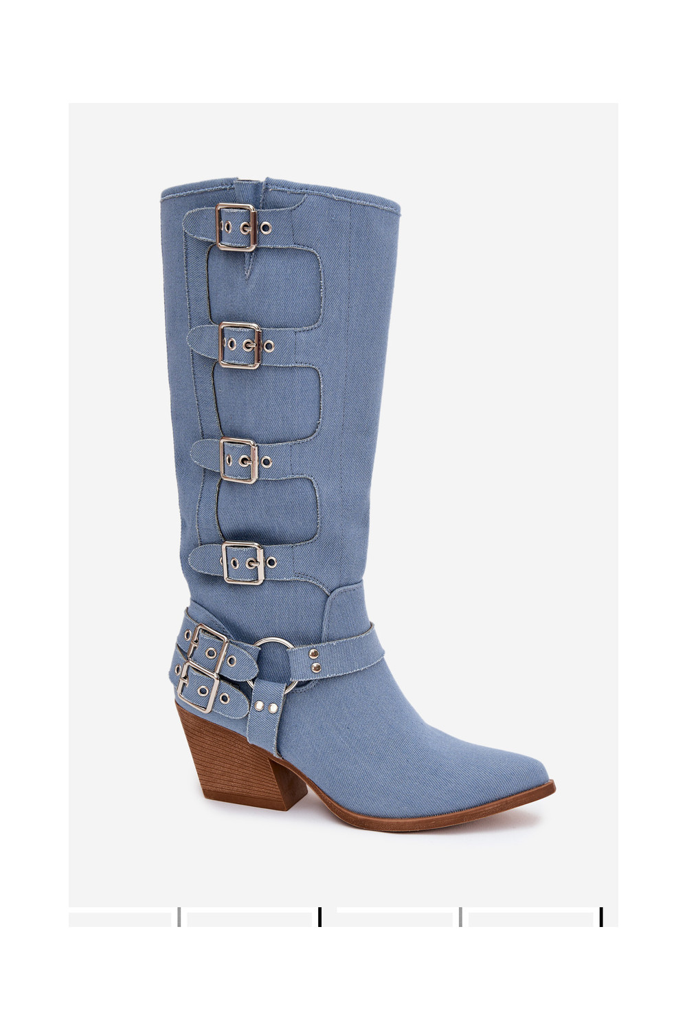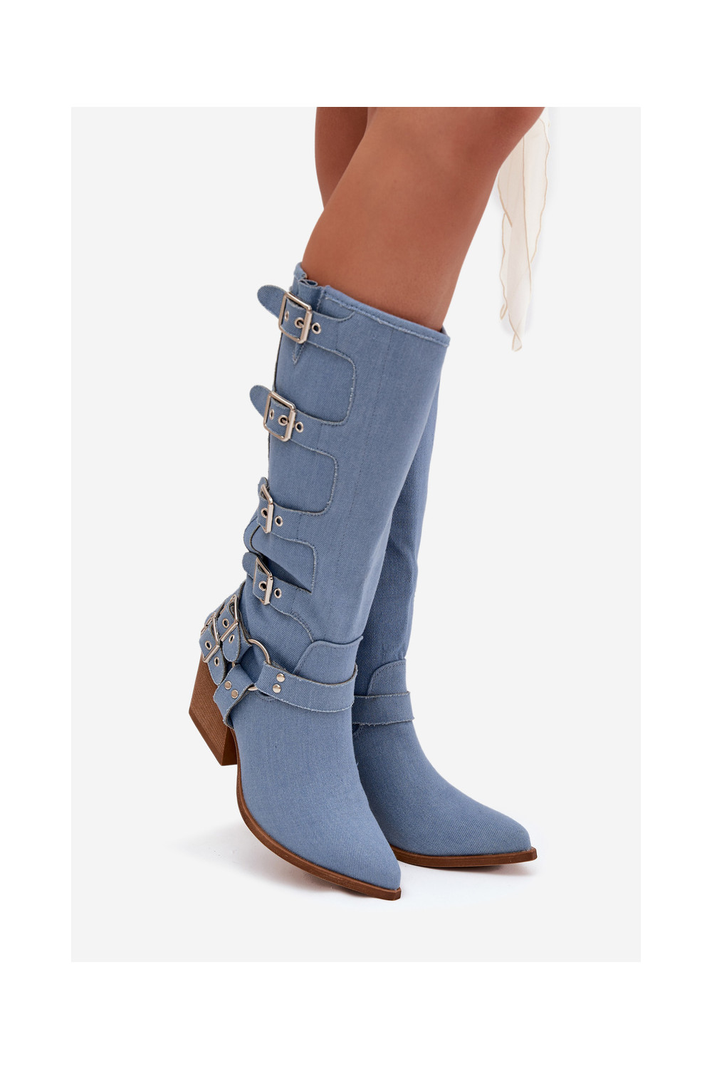 Kaubojiško stiliaus ilgaauliai batai su kulniukais ir sagtimis iš džinso medžiagos, Fivelle