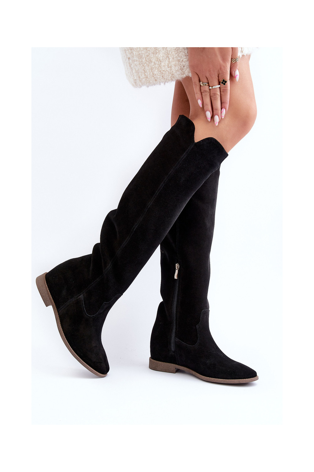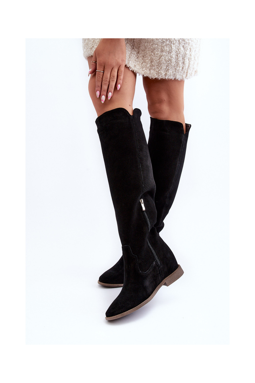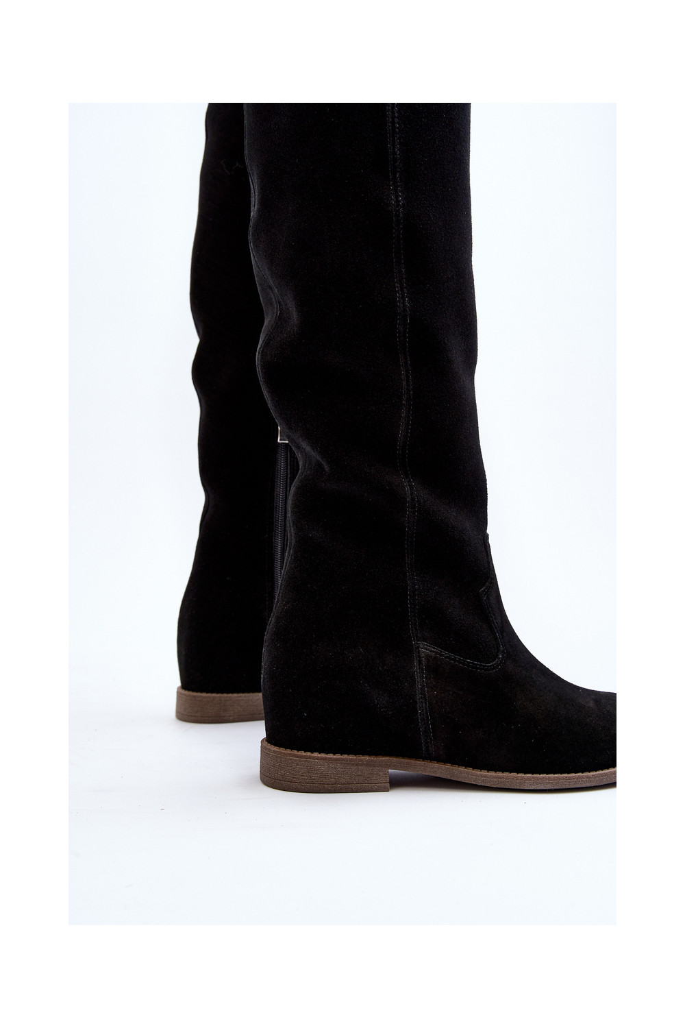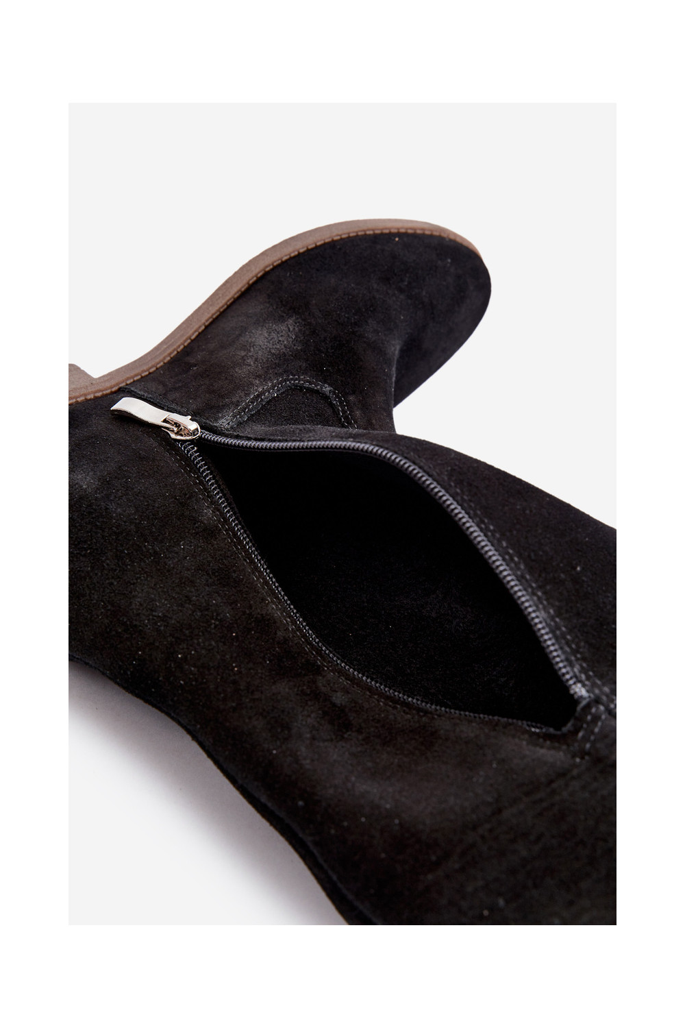 Juodos spalvos zomšiniai ilgaauliai batai iki kelių su plačiais kulniukais „Zazoo 3407"