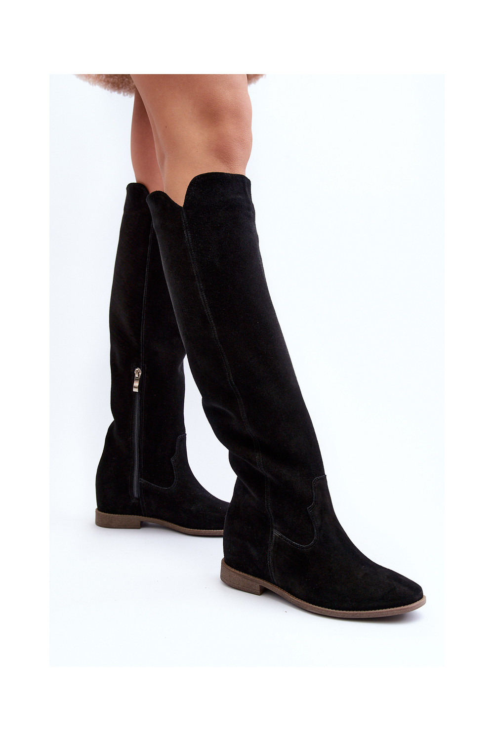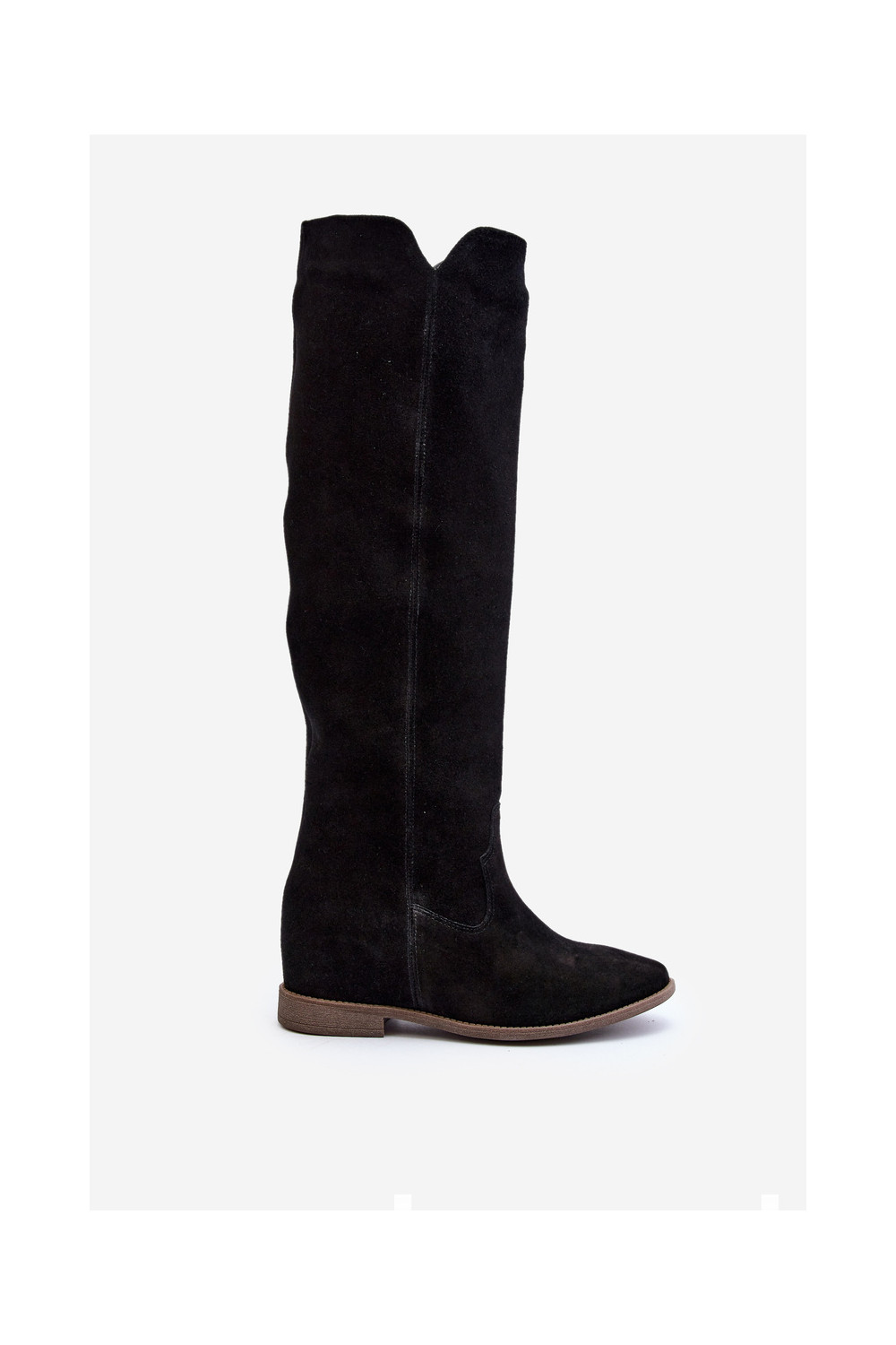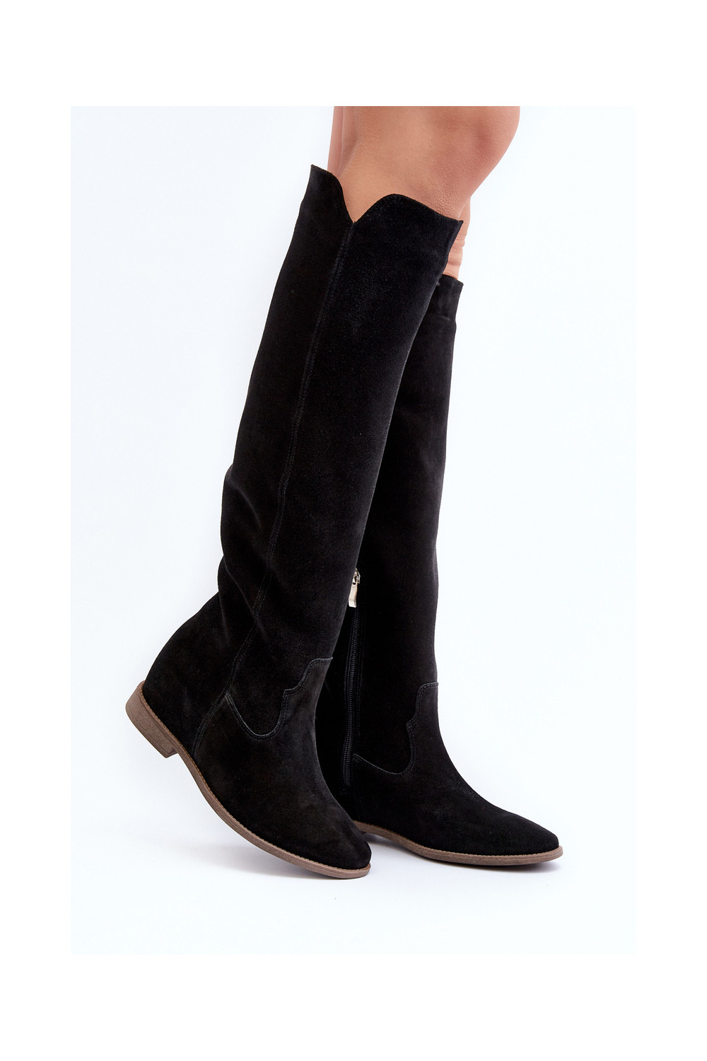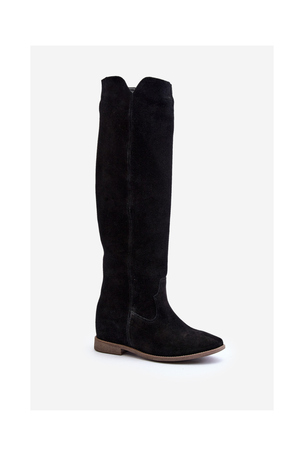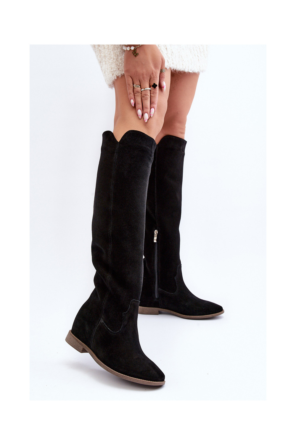 Juodos spalvos zomšiniai ilgaauliai batai iki kelių su plačiais kulniukais „Zazoo 3407"