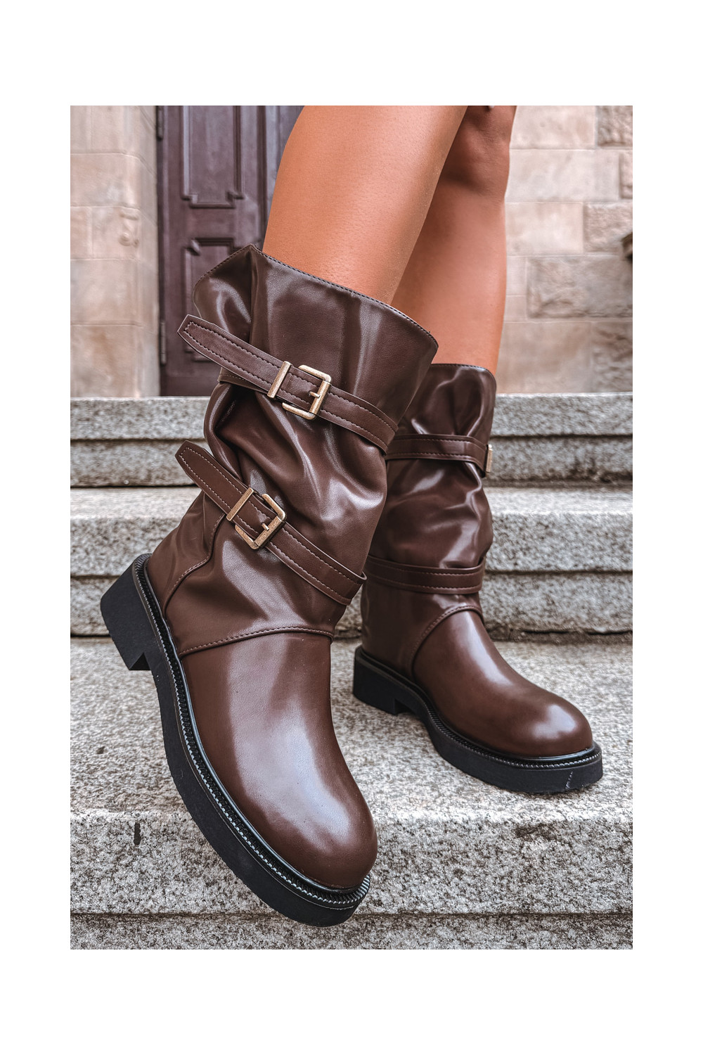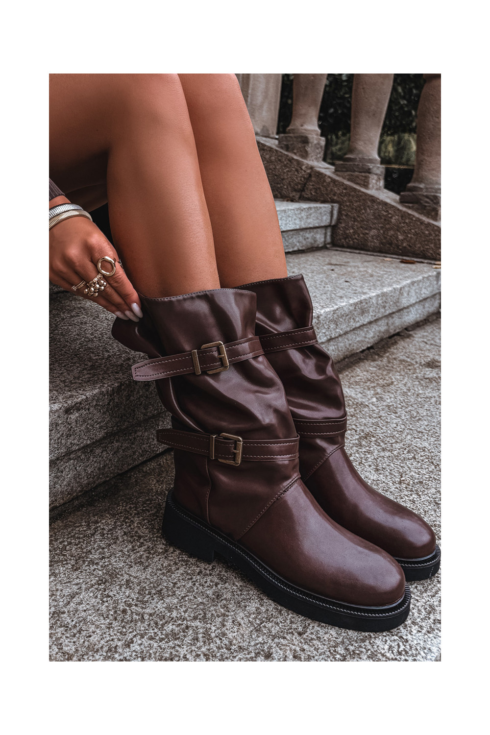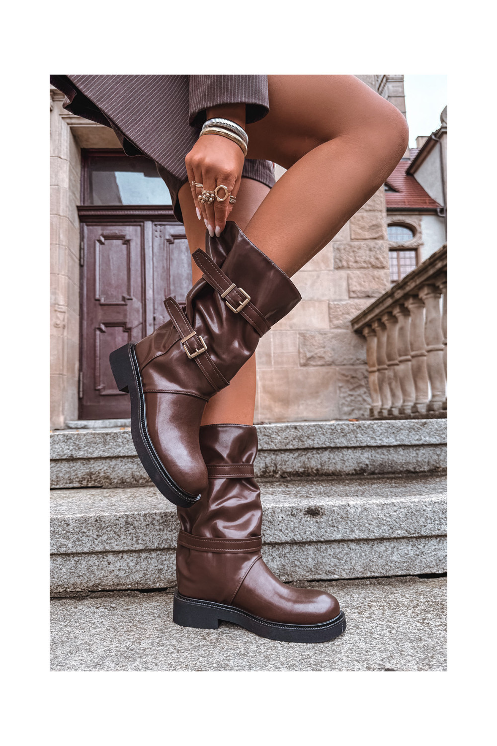 Susiraukšlėję moteriški rudos spalvos ilgaauliai batai iki blauzdos vidurio su juostelėmis ir sagtimis Halvessa