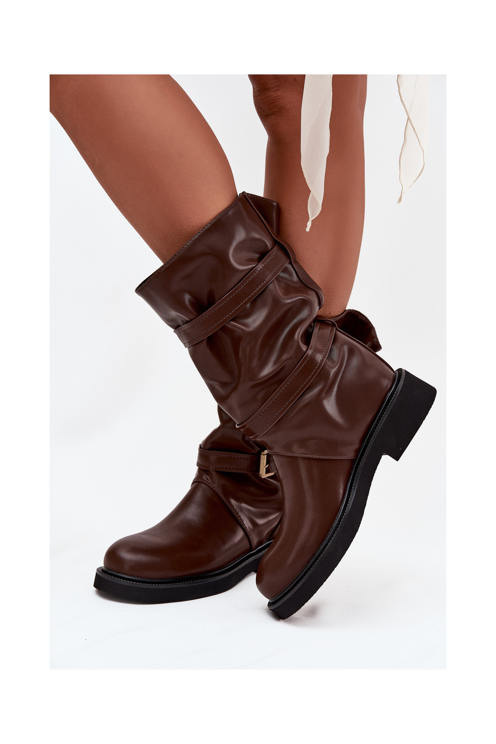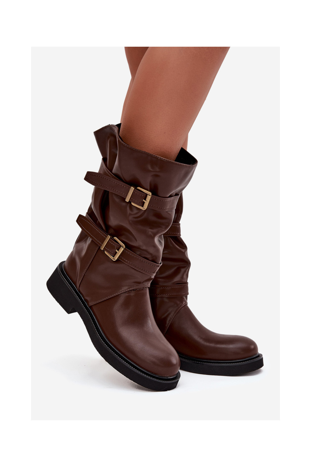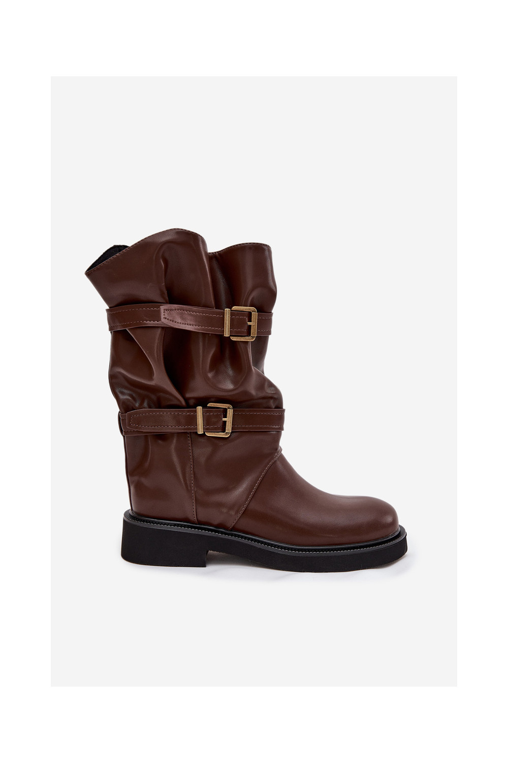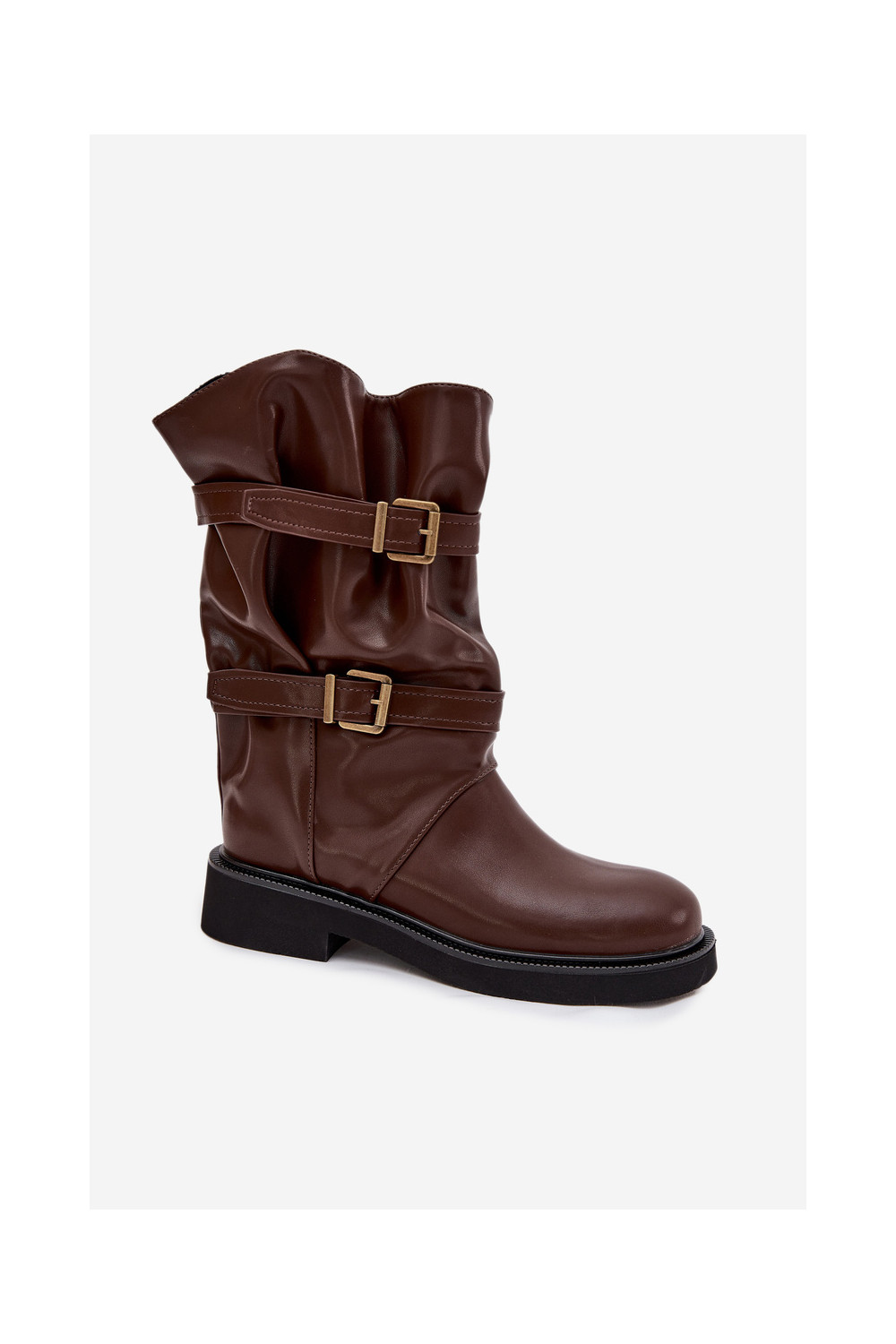 Susiraukšlėję moteriški rudos spalvos ilgaauliai batai iki blauzdos vidurio su juostelėmis ir sagtimis Halvessa