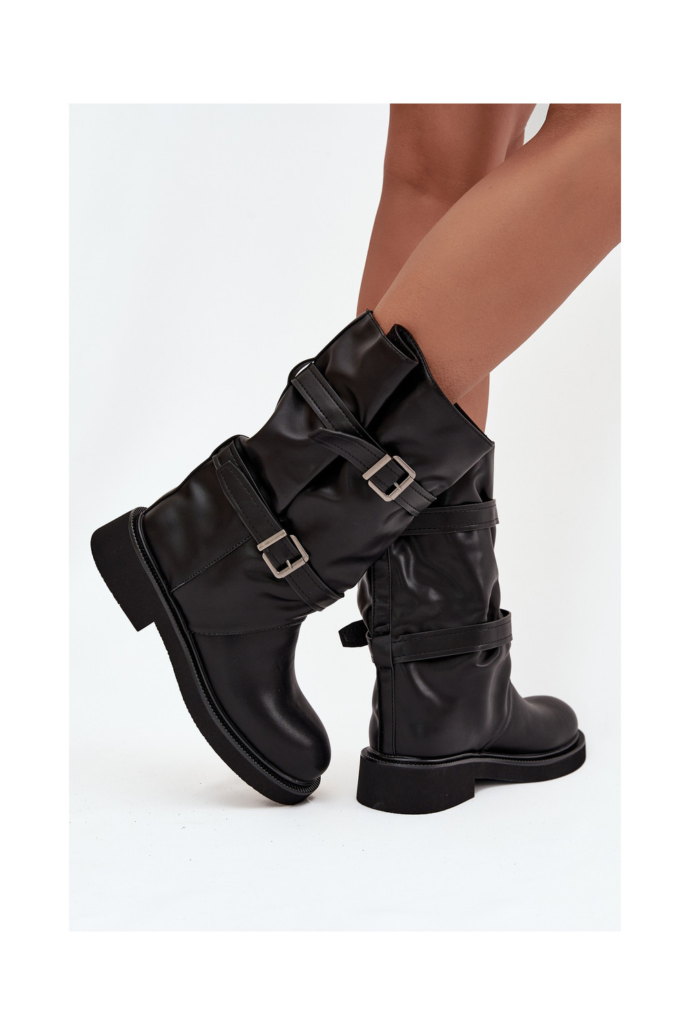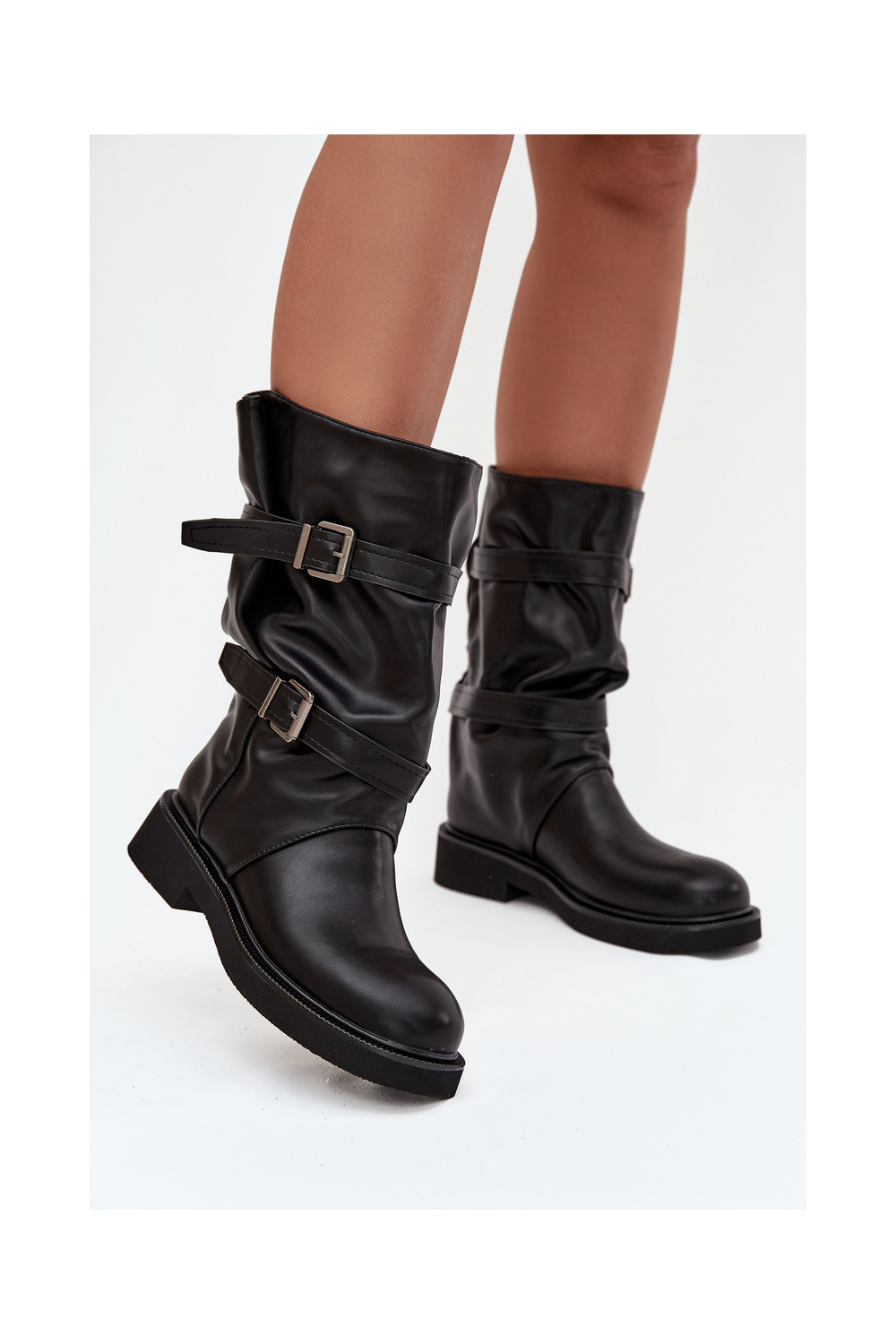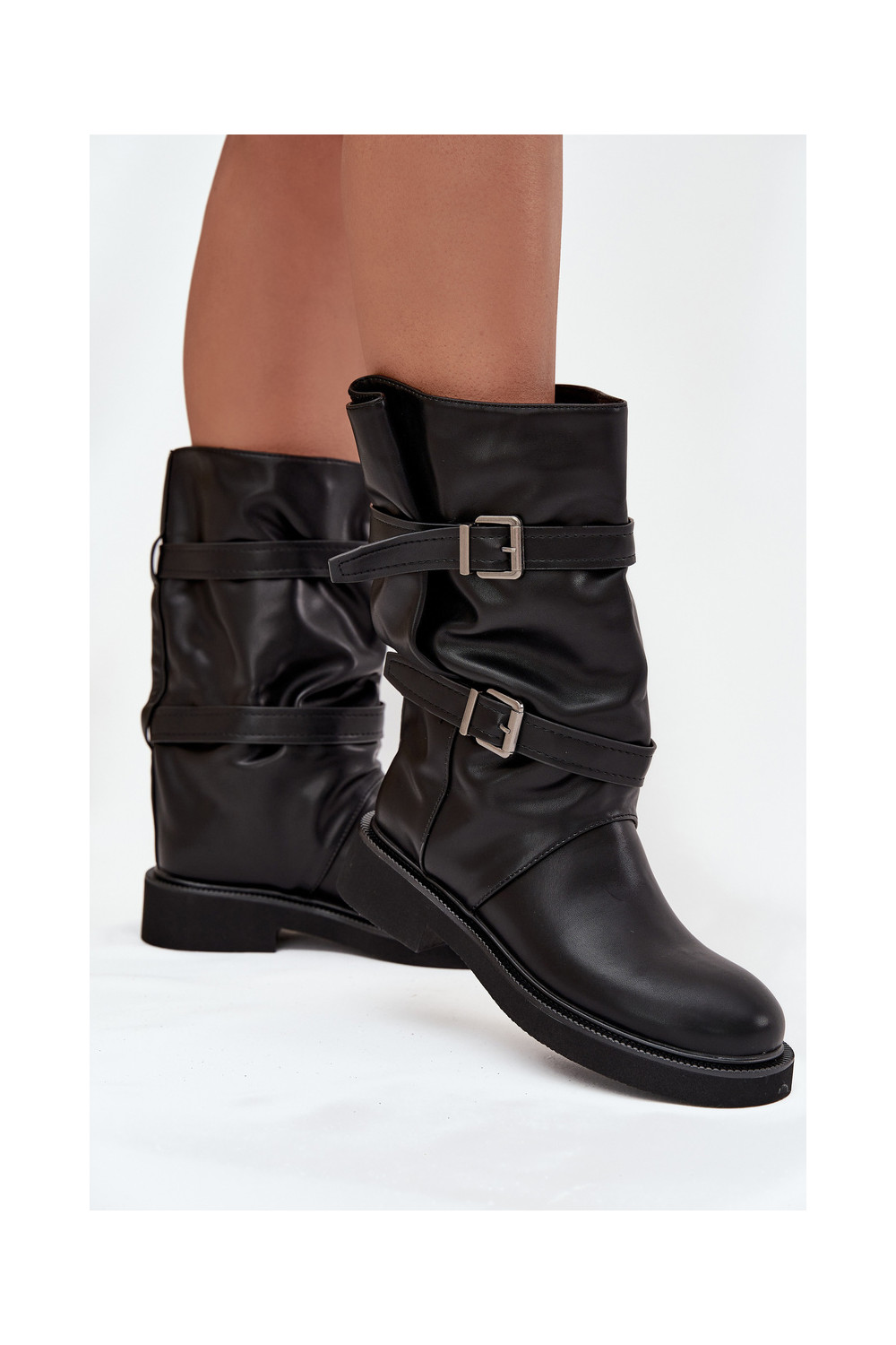 Raukšlėti moteriški ilgaauliai batai iki pusės blauzdos su juostelėmis ir sagtimis juodos spalvos Halvessa