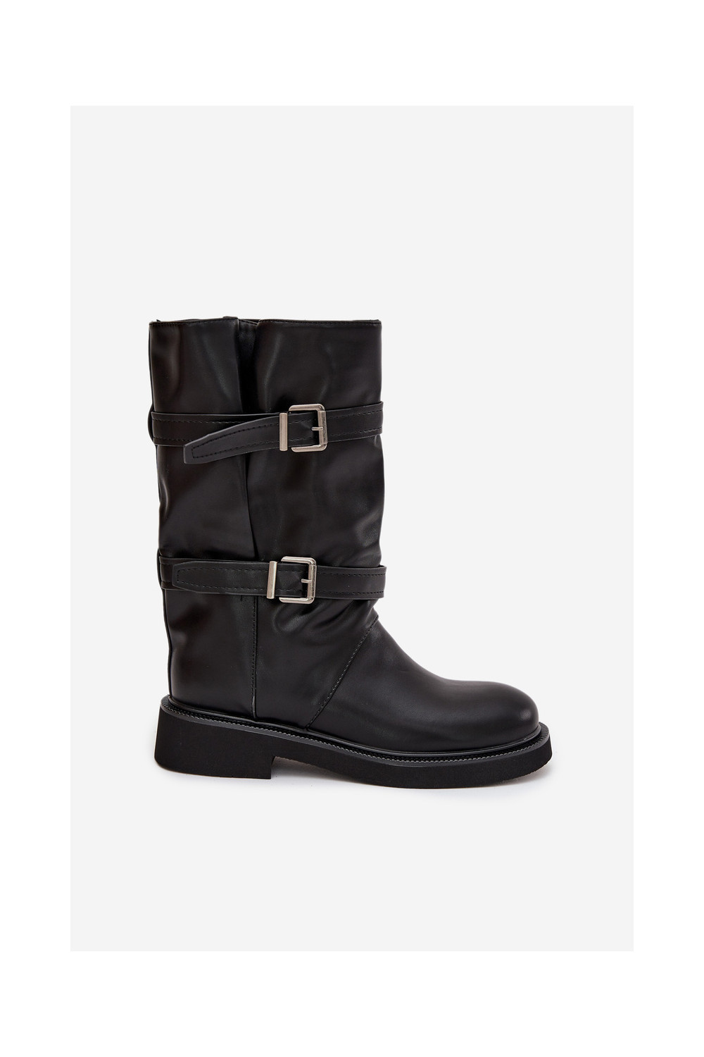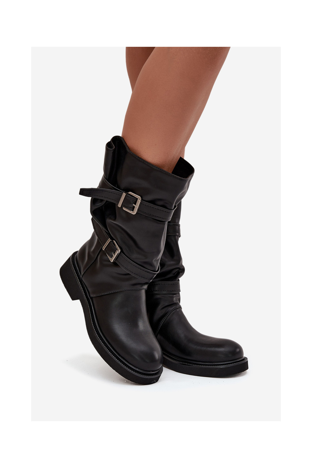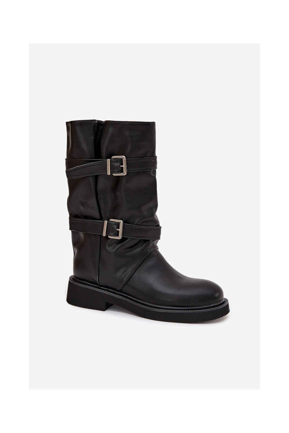 Raukšlėti moteriški ilgaauliai batai iki pusės blauzdos su juostelėmis ir sagtimis juodos spalvos Halvessa