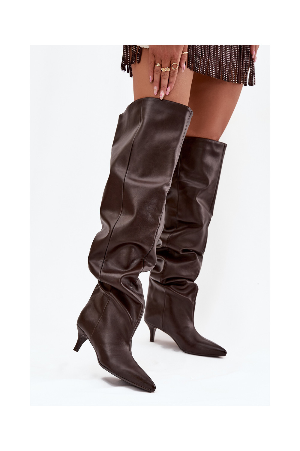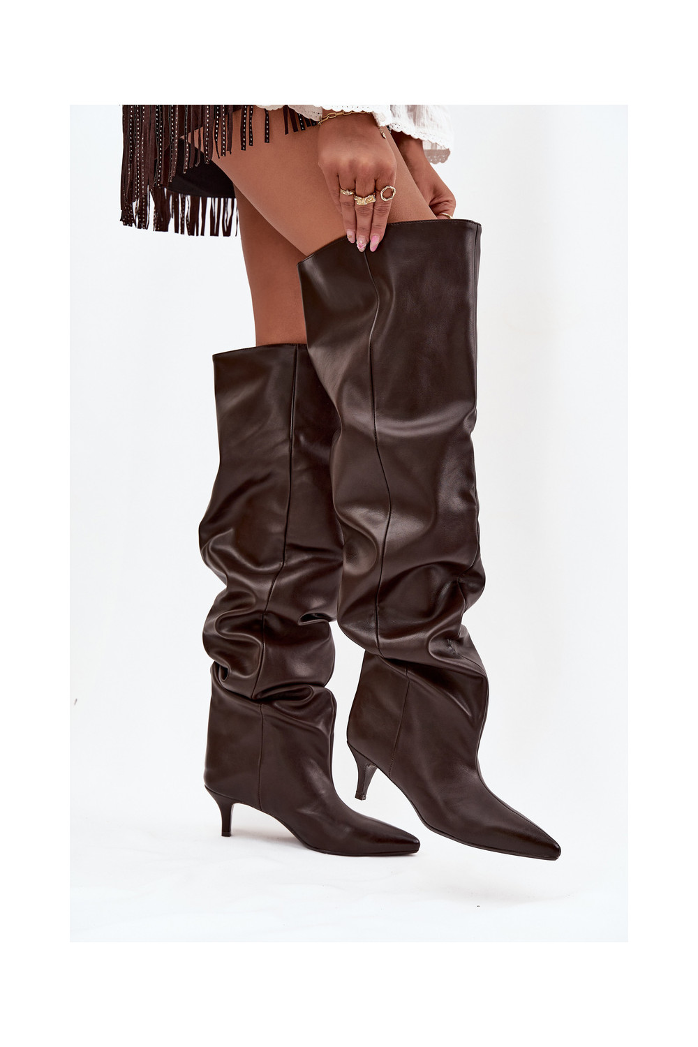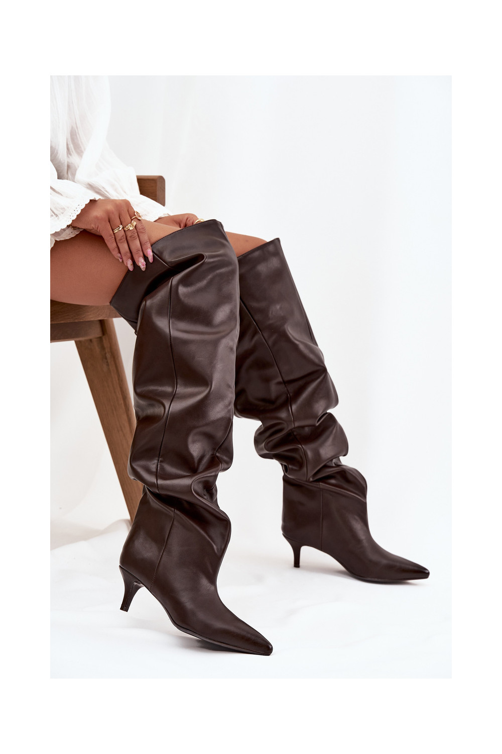 Įsispiriami moteriški ilgaauliai batai su plonais kulniukais šokolado spalvos Ysolienne
