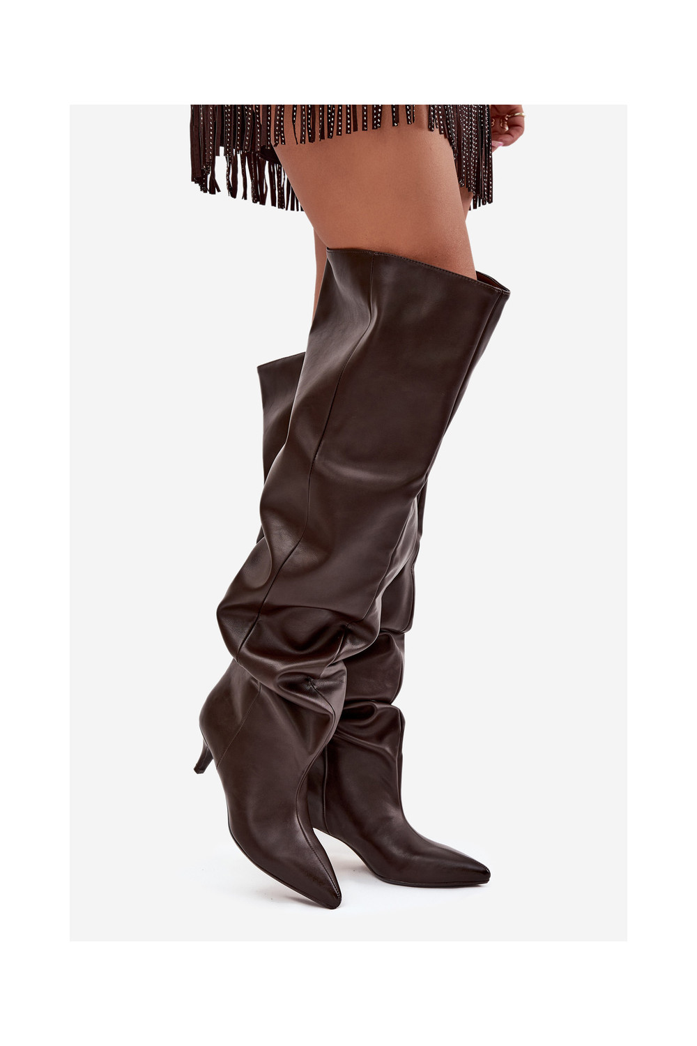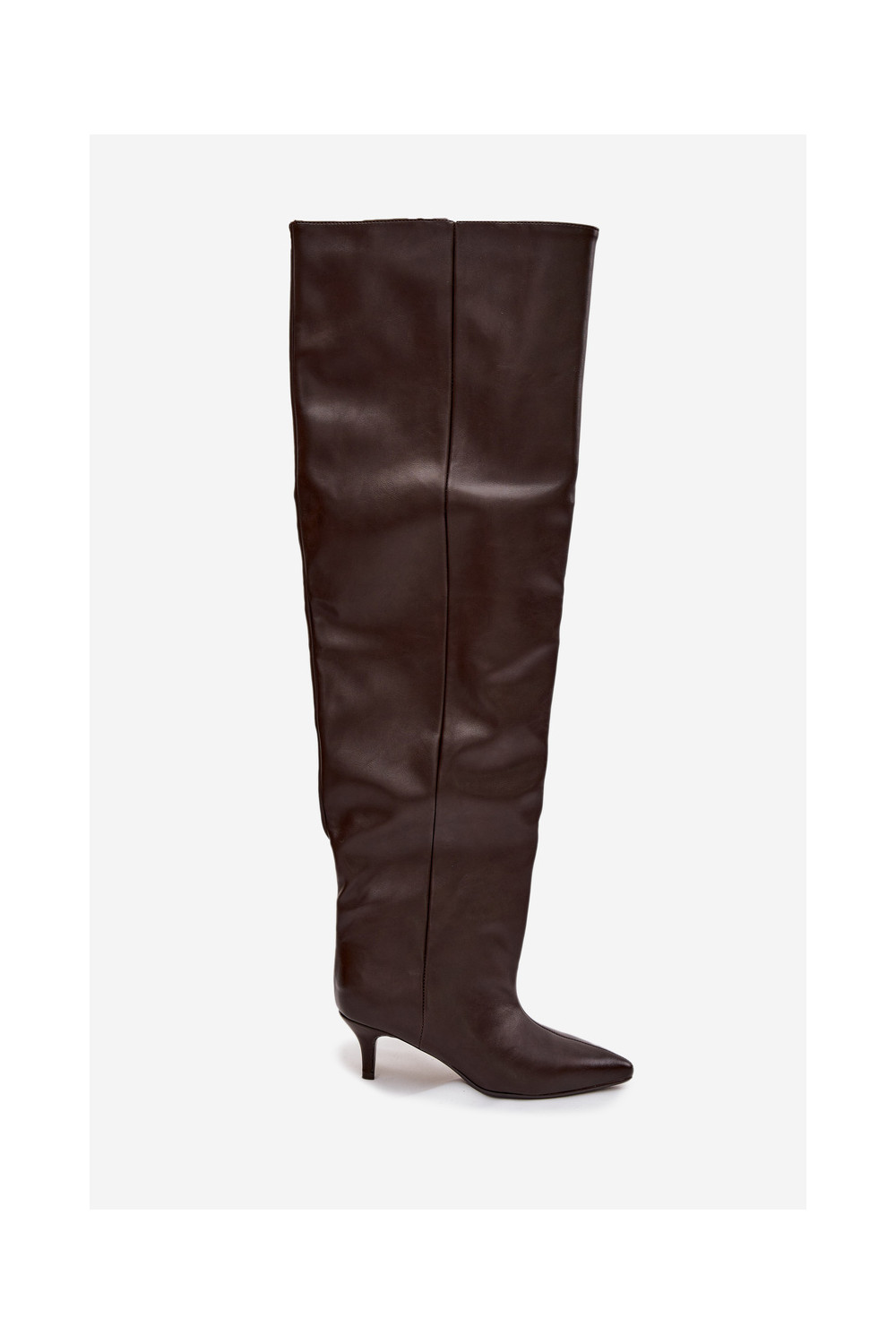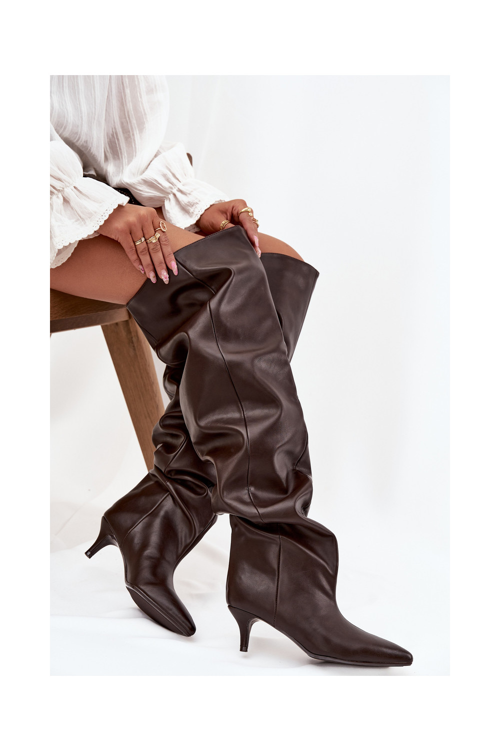 Įsispiriami moteriški ilgaauliai batai su plonais kulniukais šokolado spalvos Ysolienne