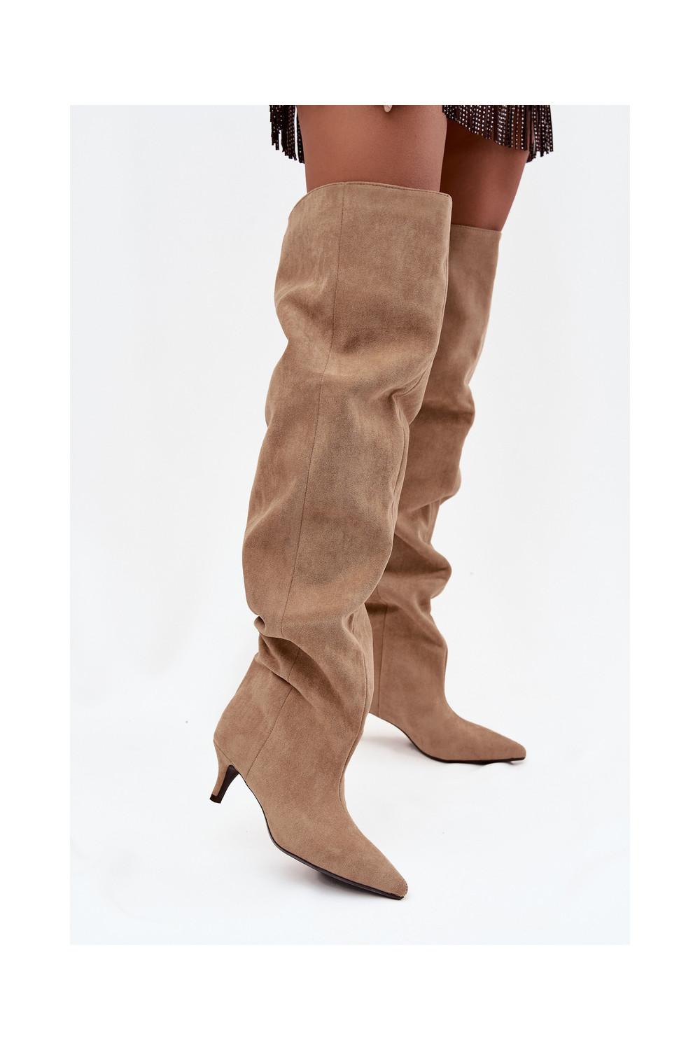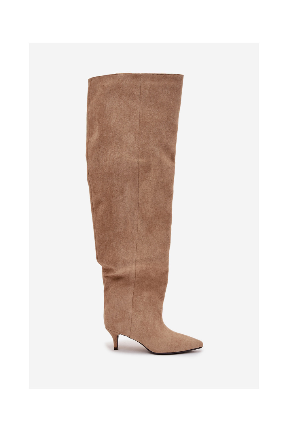 Įsispiriamo modelio moteriški ilgaauliai batai su plonais kulniukais smėlio spalvos Ysolienne