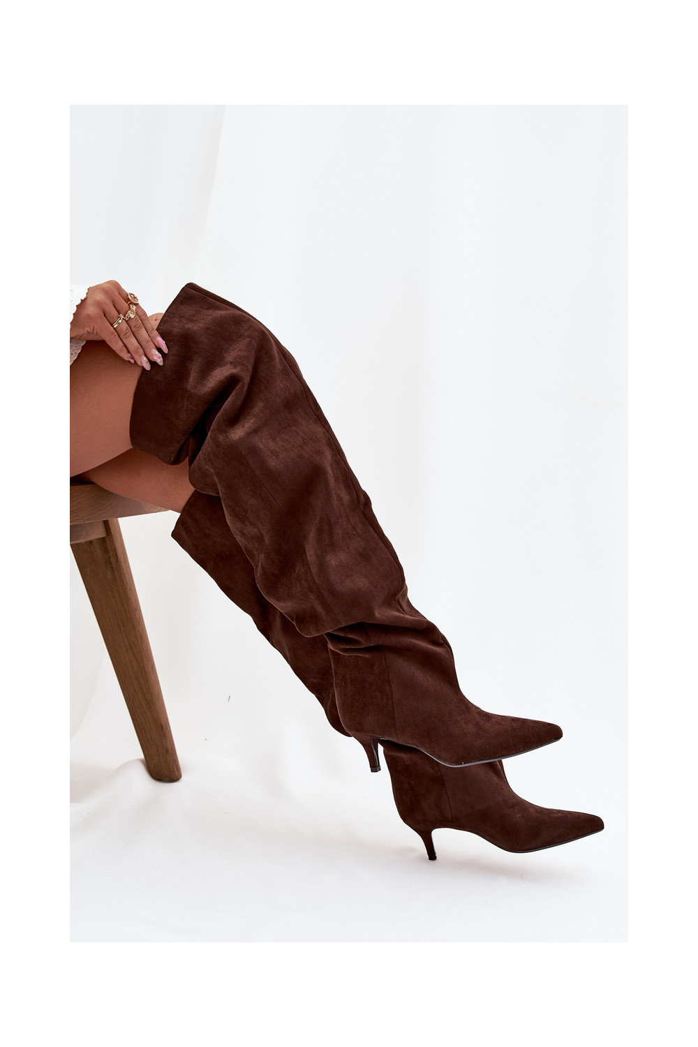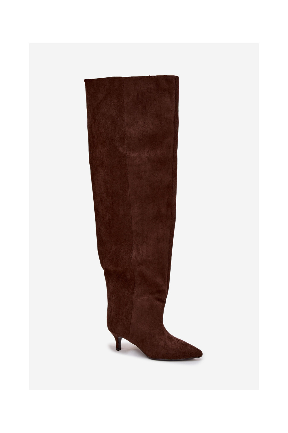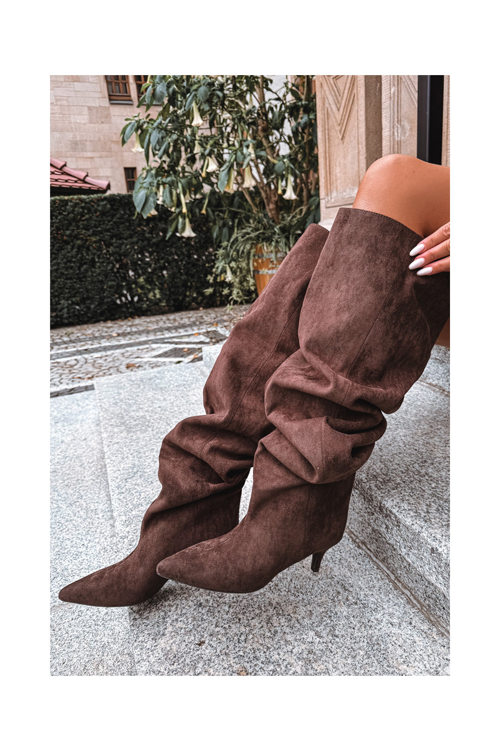 Įsispiriami moteriški ilgaauliai batai su plonais kulniukais šokolado spalvos Ysolienne