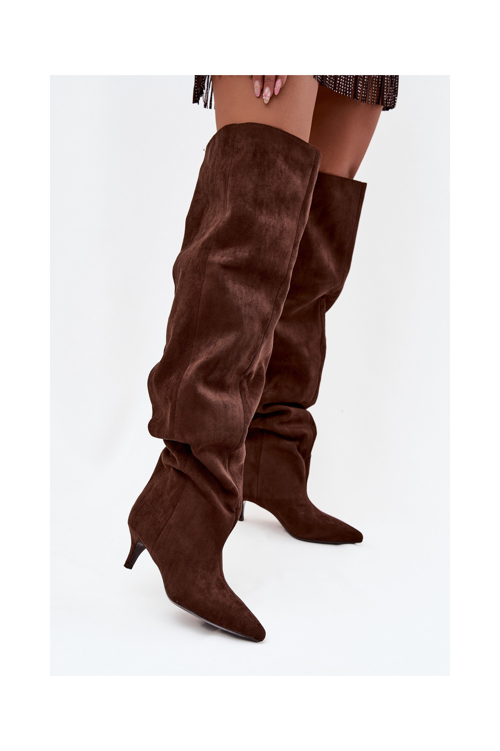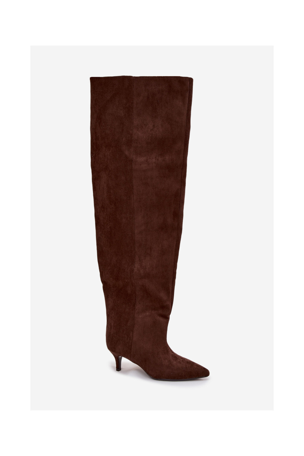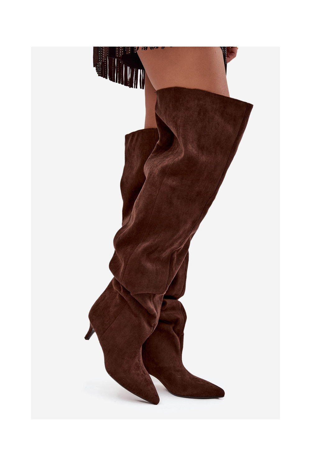 Įsispiriami moteriški ilgaauliai batai su plonais kulniukais šokolado spalvos Ysolienne
