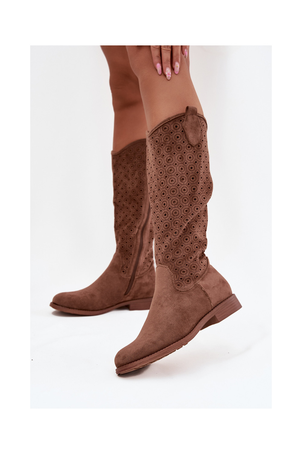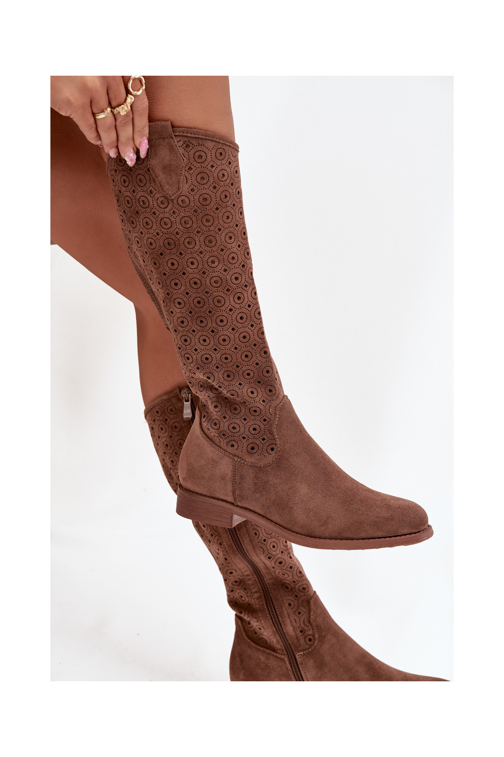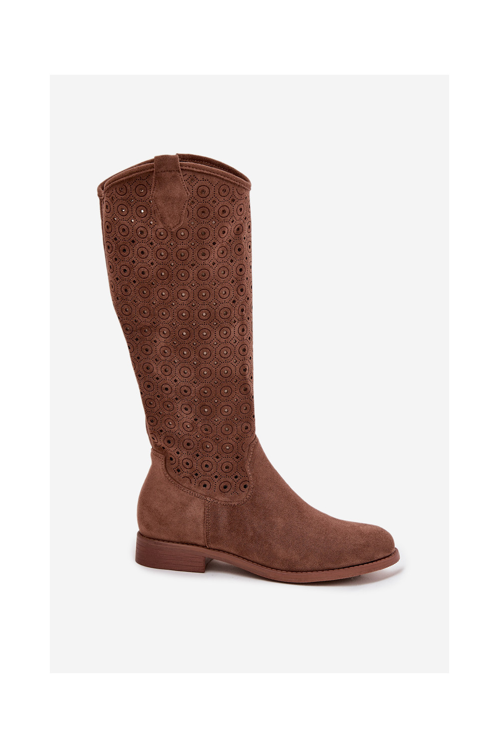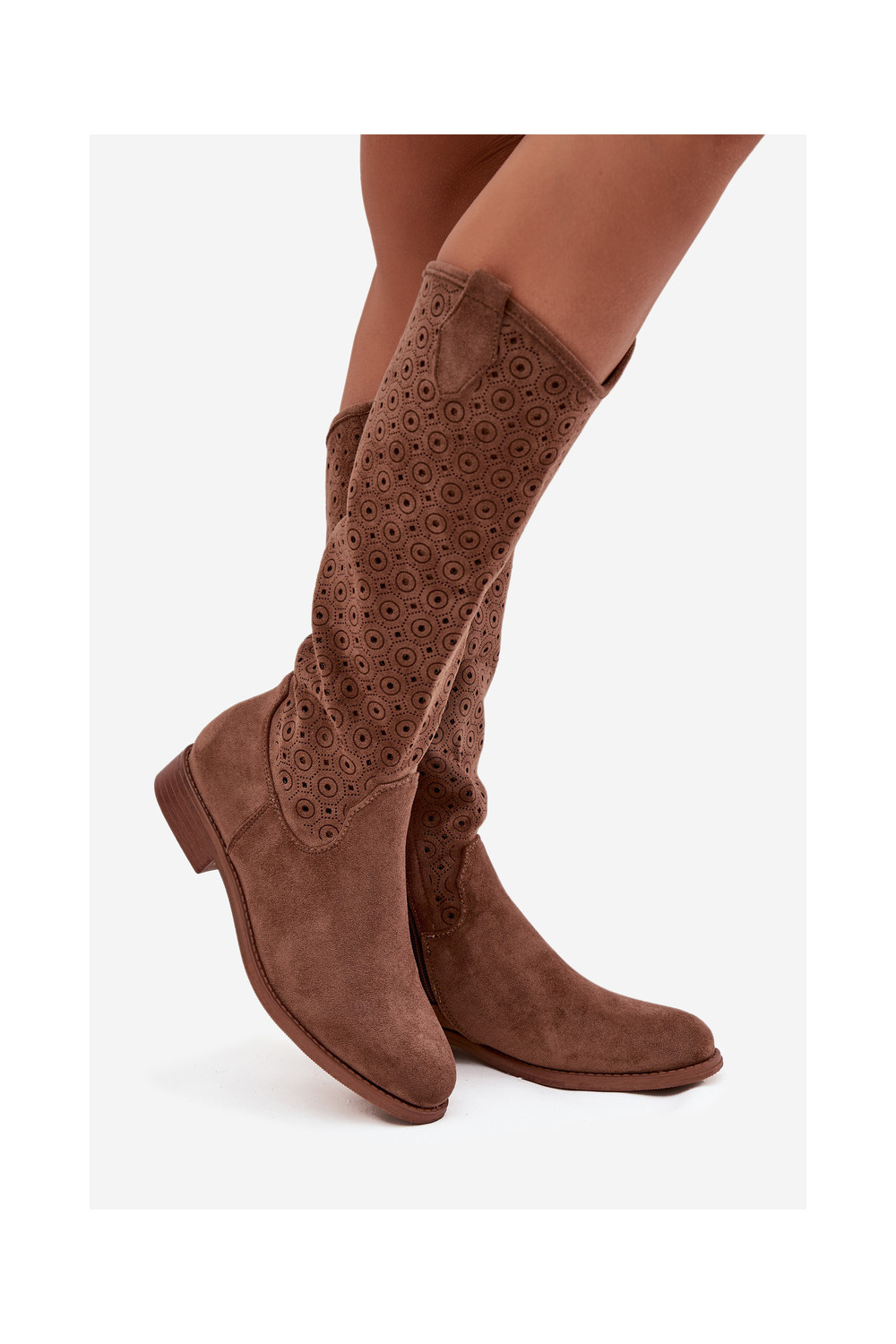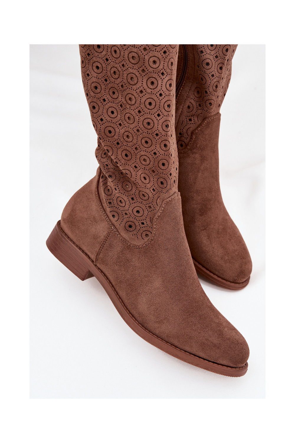 Moteriški ilgaauliai batai su plačiais kulniukais ir ažūro elementais S.Barski HY52-531 rudos spalvos