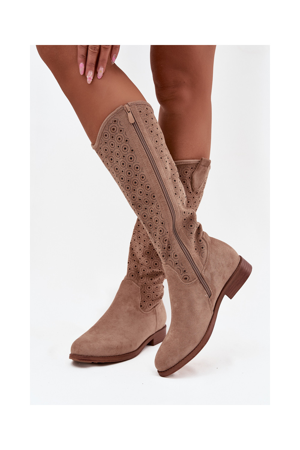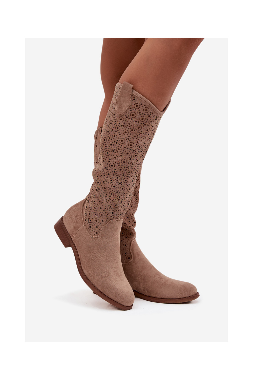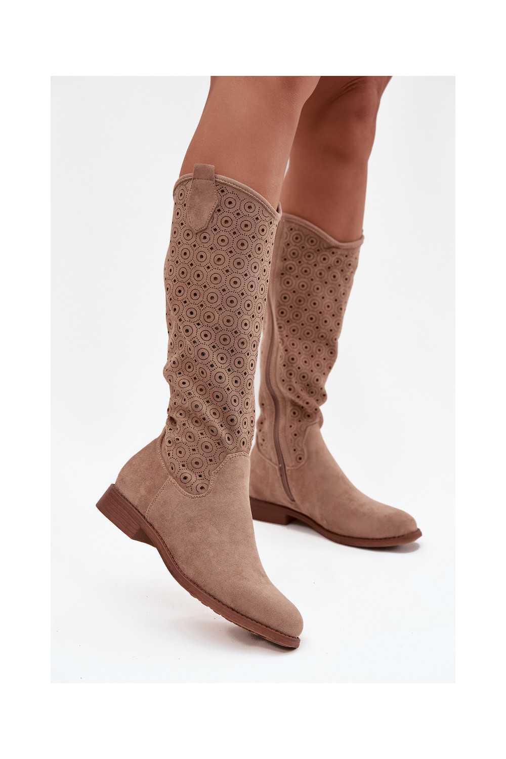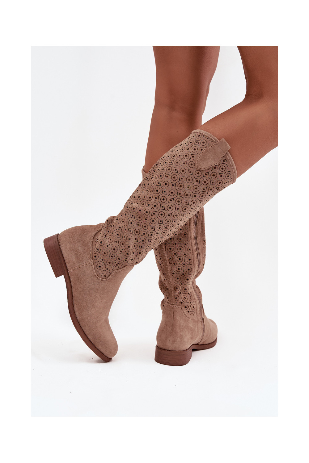 Moteriški ilgaauliai batai su plačiais kulniukais ir ažūro elementais S.Barski HY52-531 smėlio spalvos