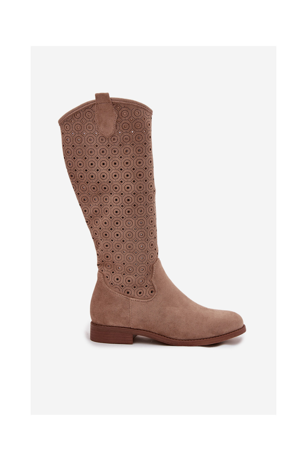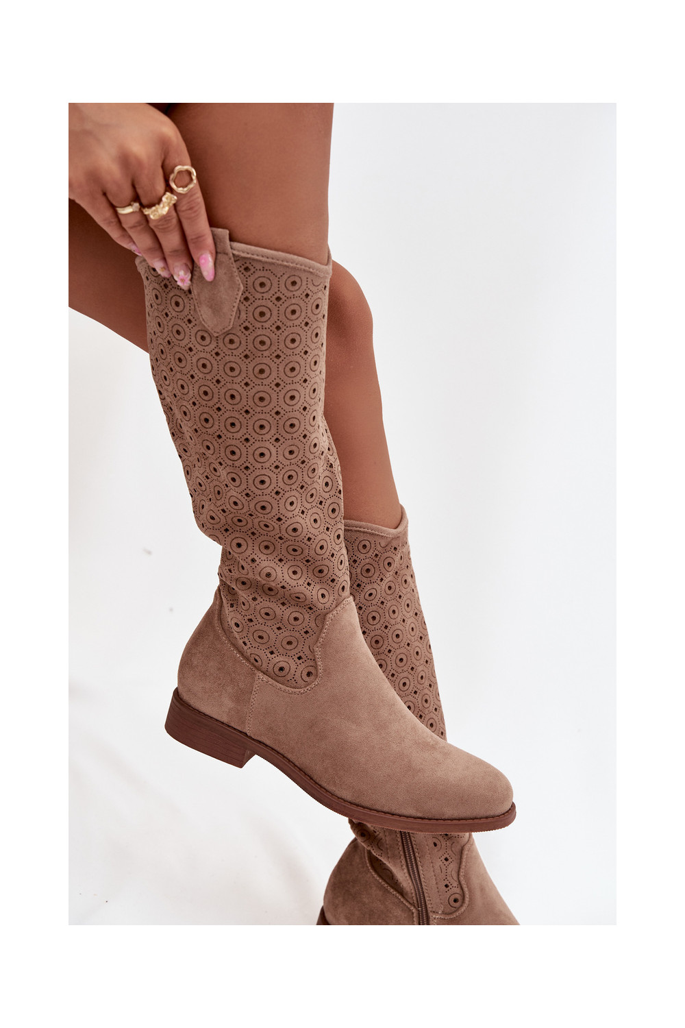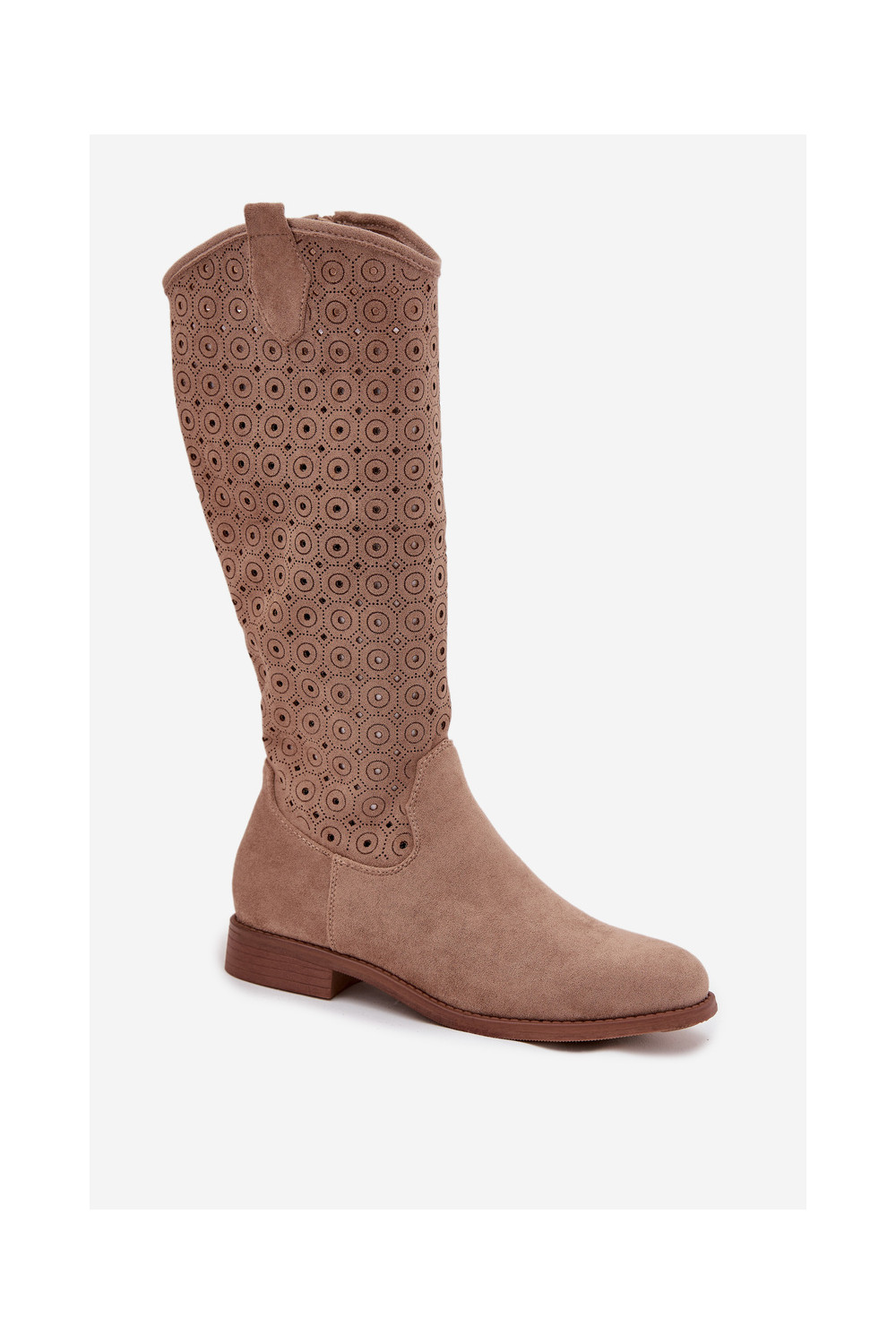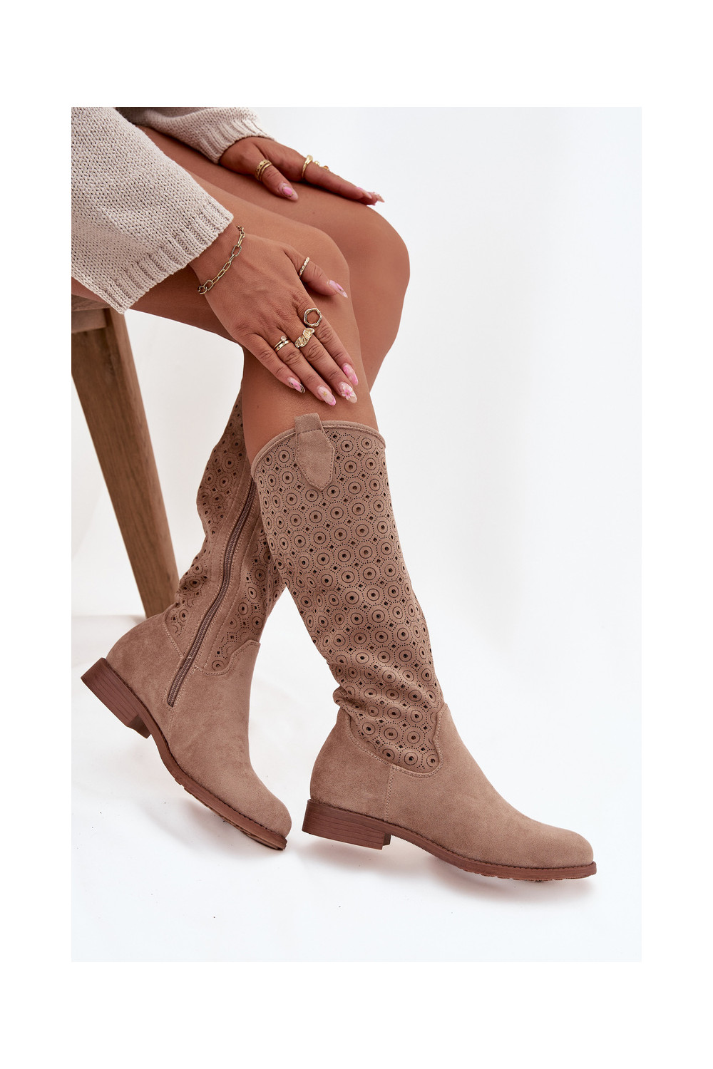 Moteriški ilgaauliai batai su plačiais kulniukais ir ažūro elementais S.Barski HY52-531 smėlio spalvos