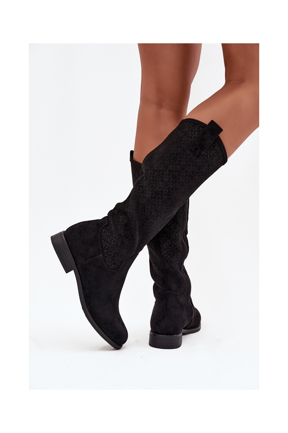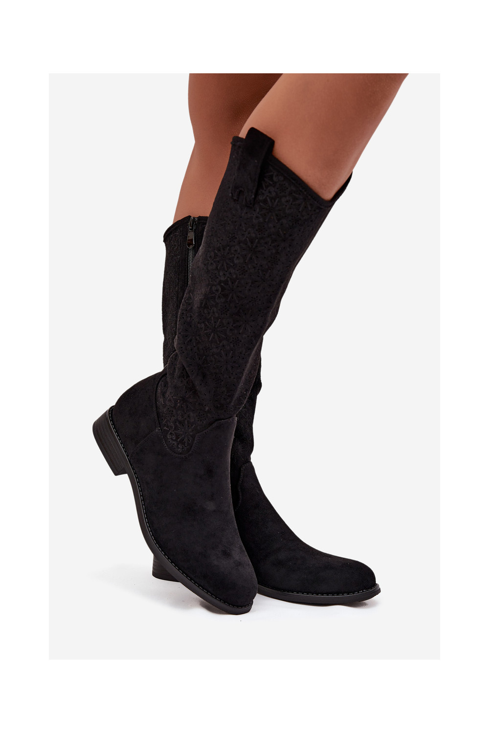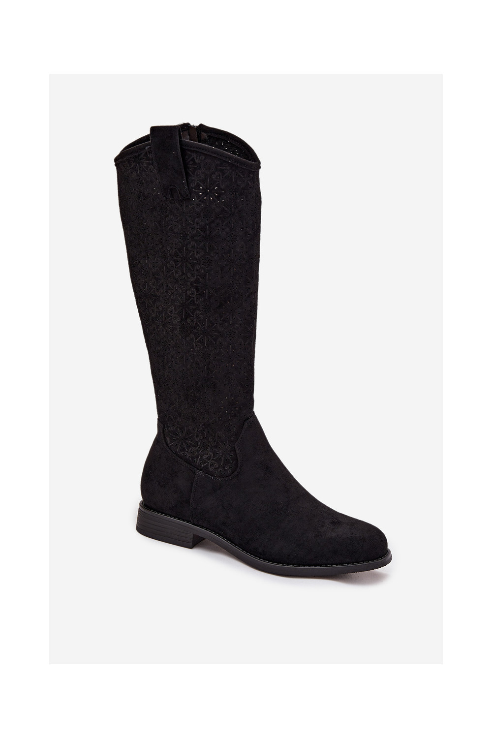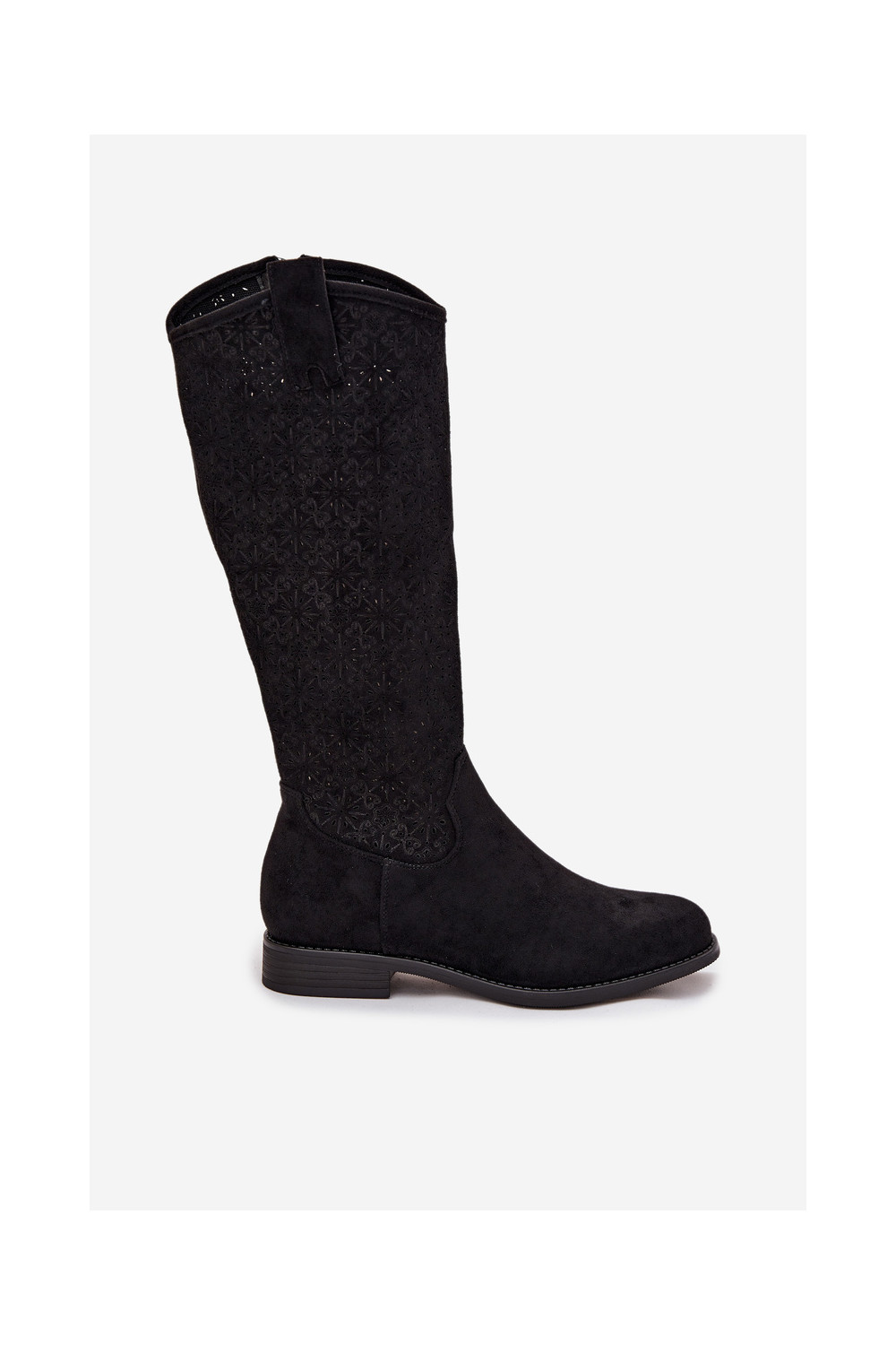 Moteriški ilgaauliai batai su ažūro elementais ir plačiais kulniukais S.Barski HY52-534 juodos spalvos