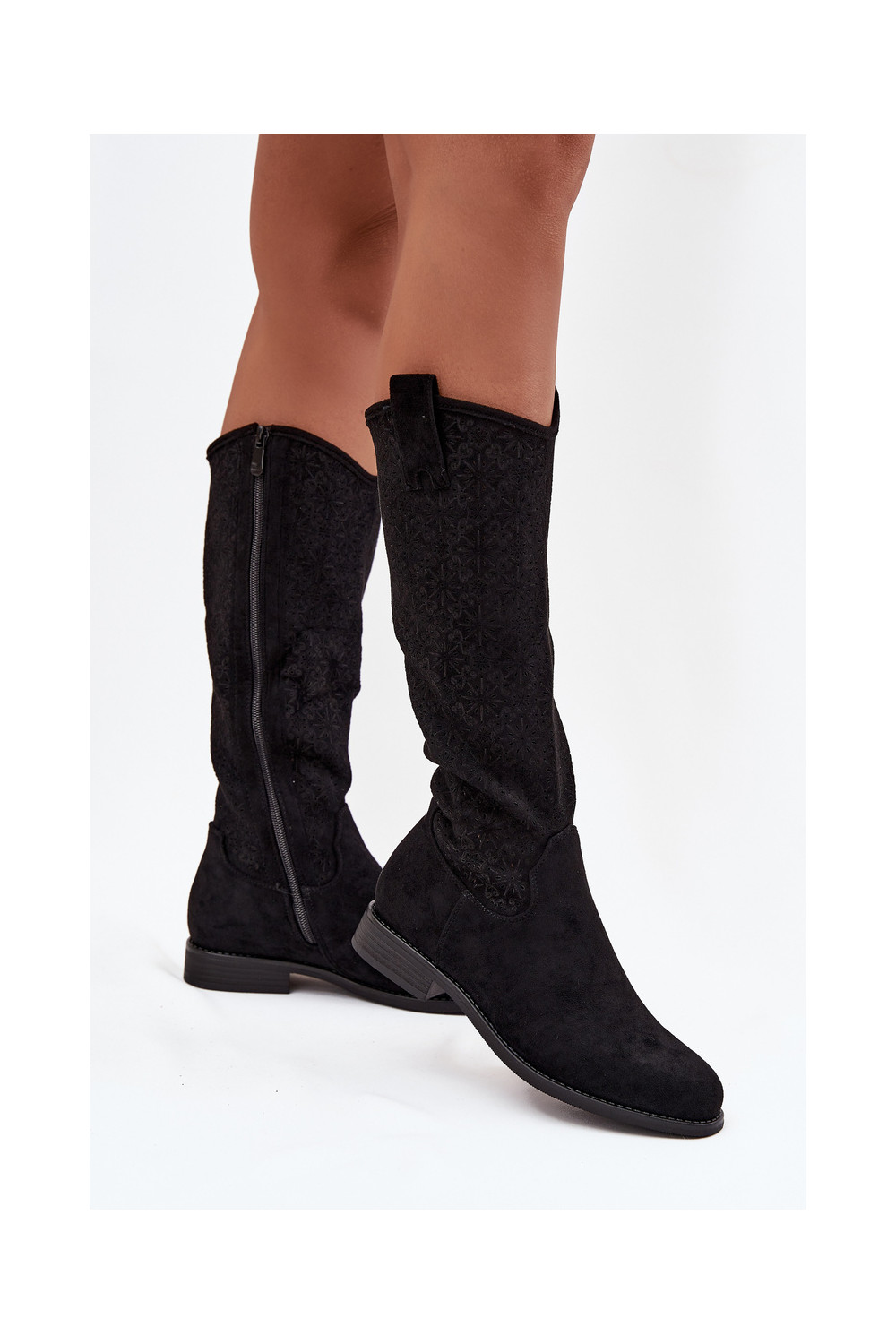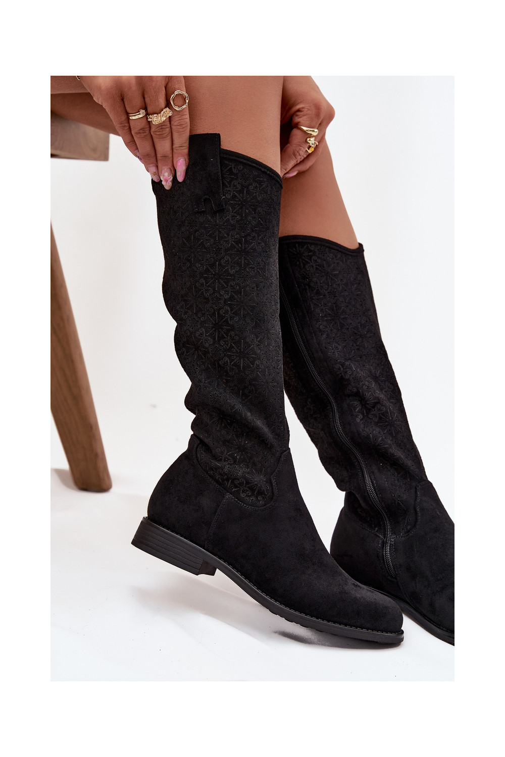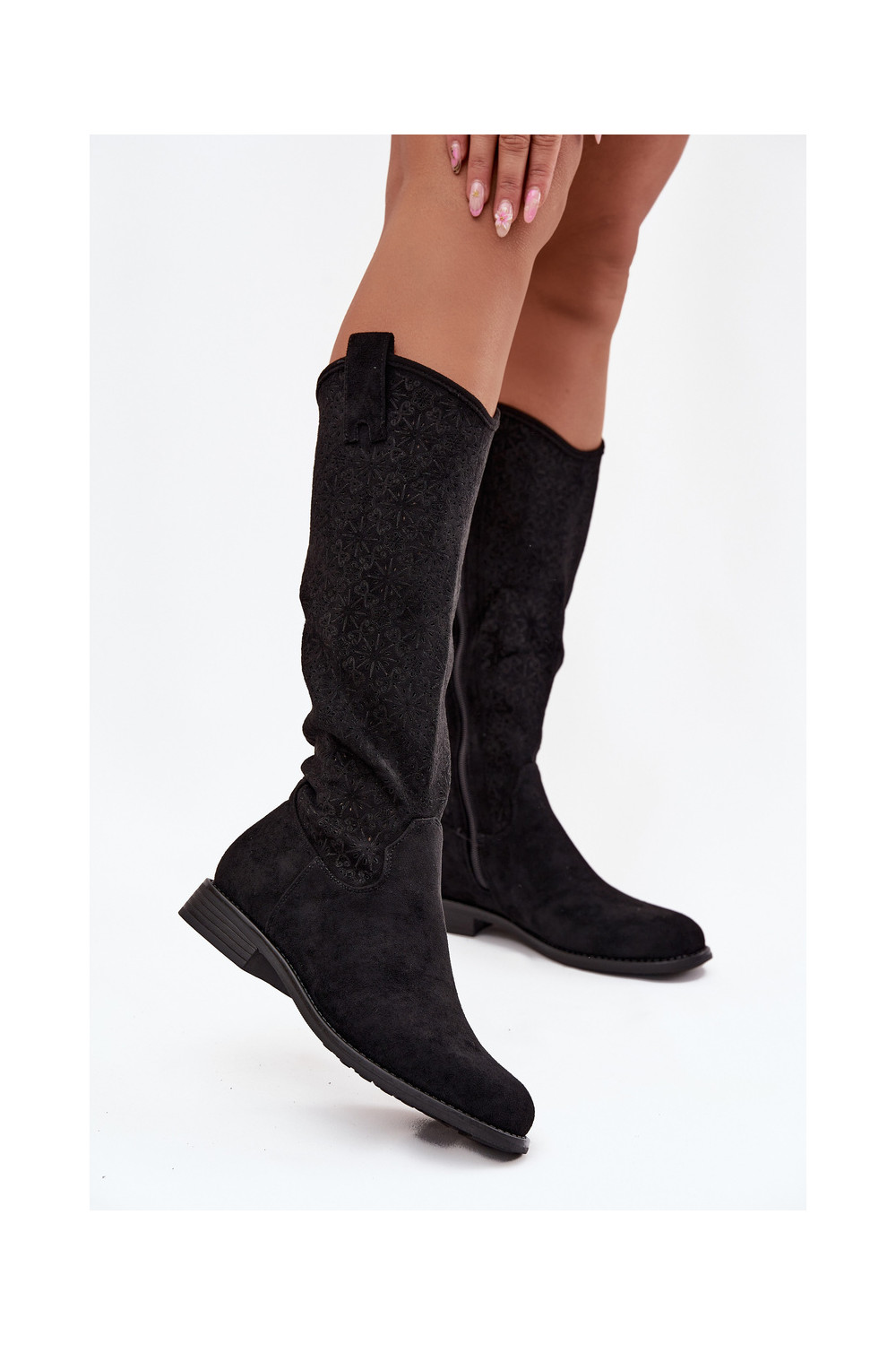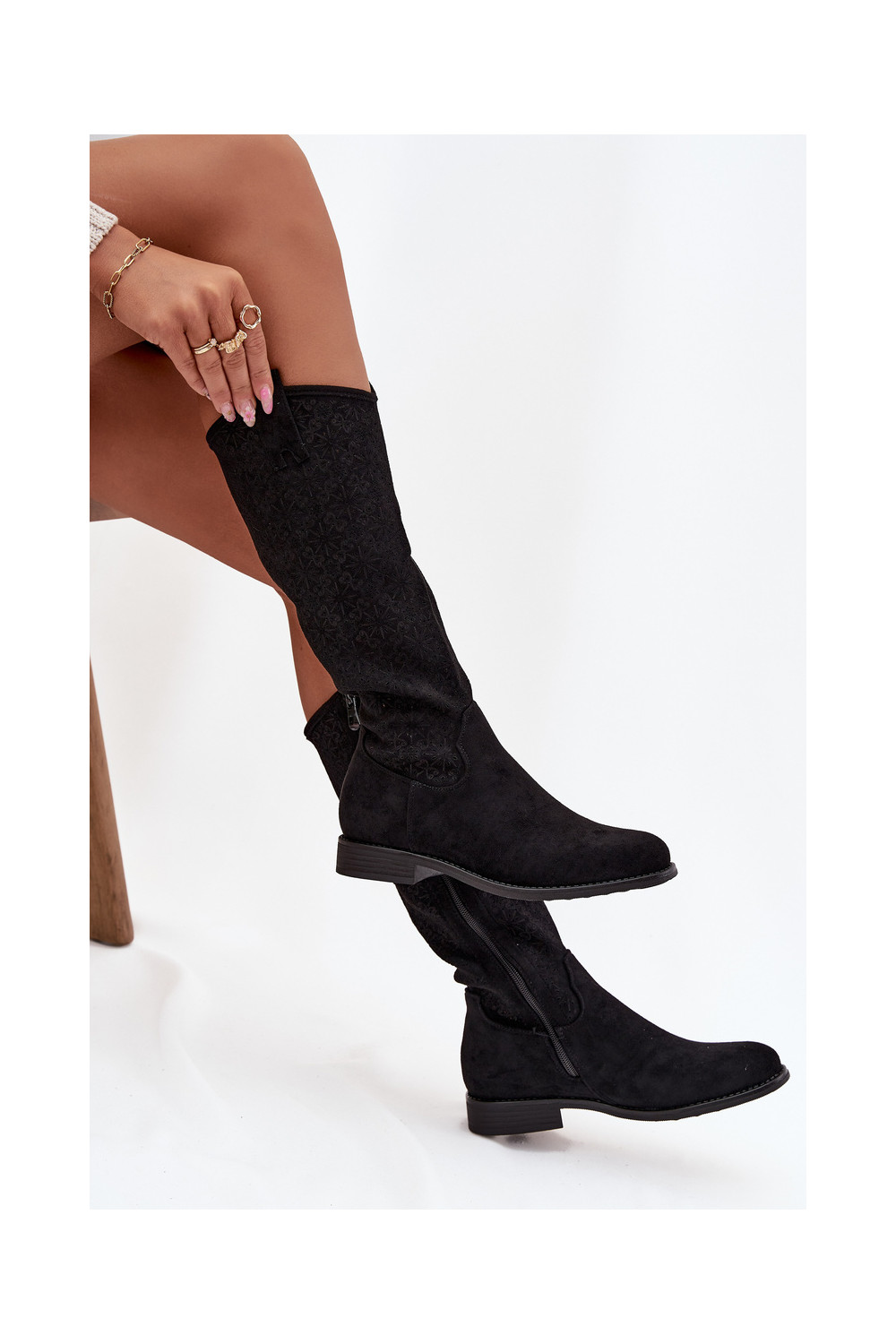 Moteriški ilgaauliai batai su ažūro elementais ir plačiais kulniukais S.Barski HY52-534 juodos spalvos