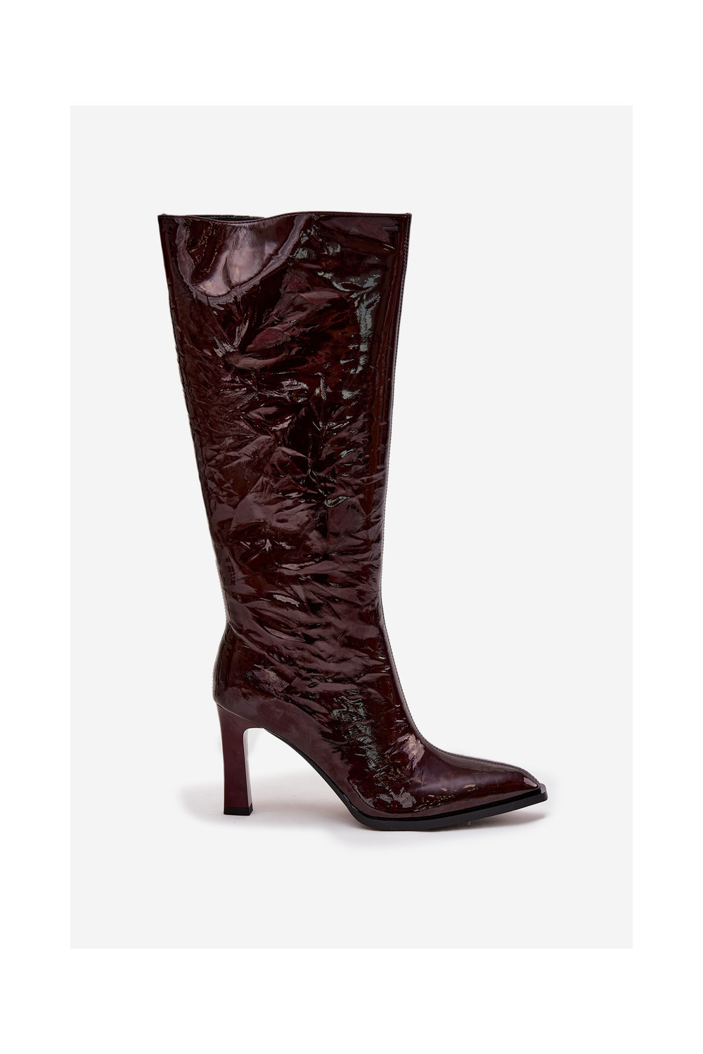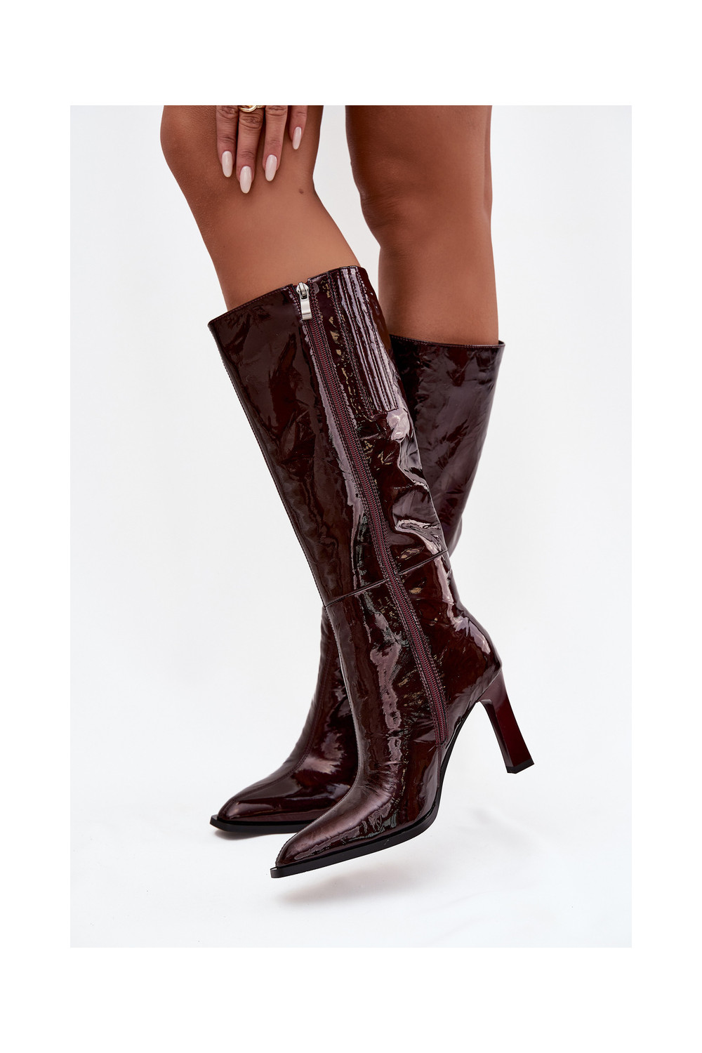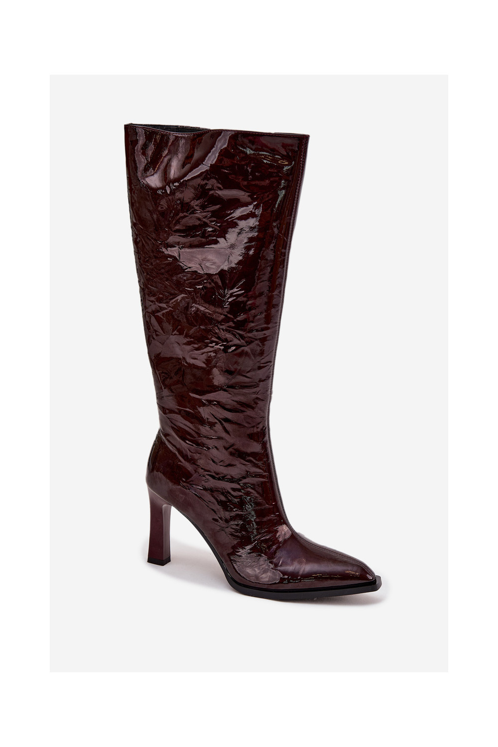 Lakiniai odiniai moteriški ilgaauliai batai su kulniukais pašiltinti D&A CR52-716 bordo spalvos
