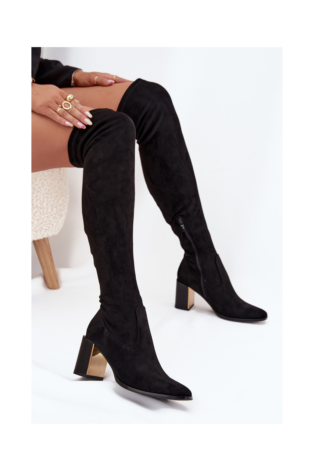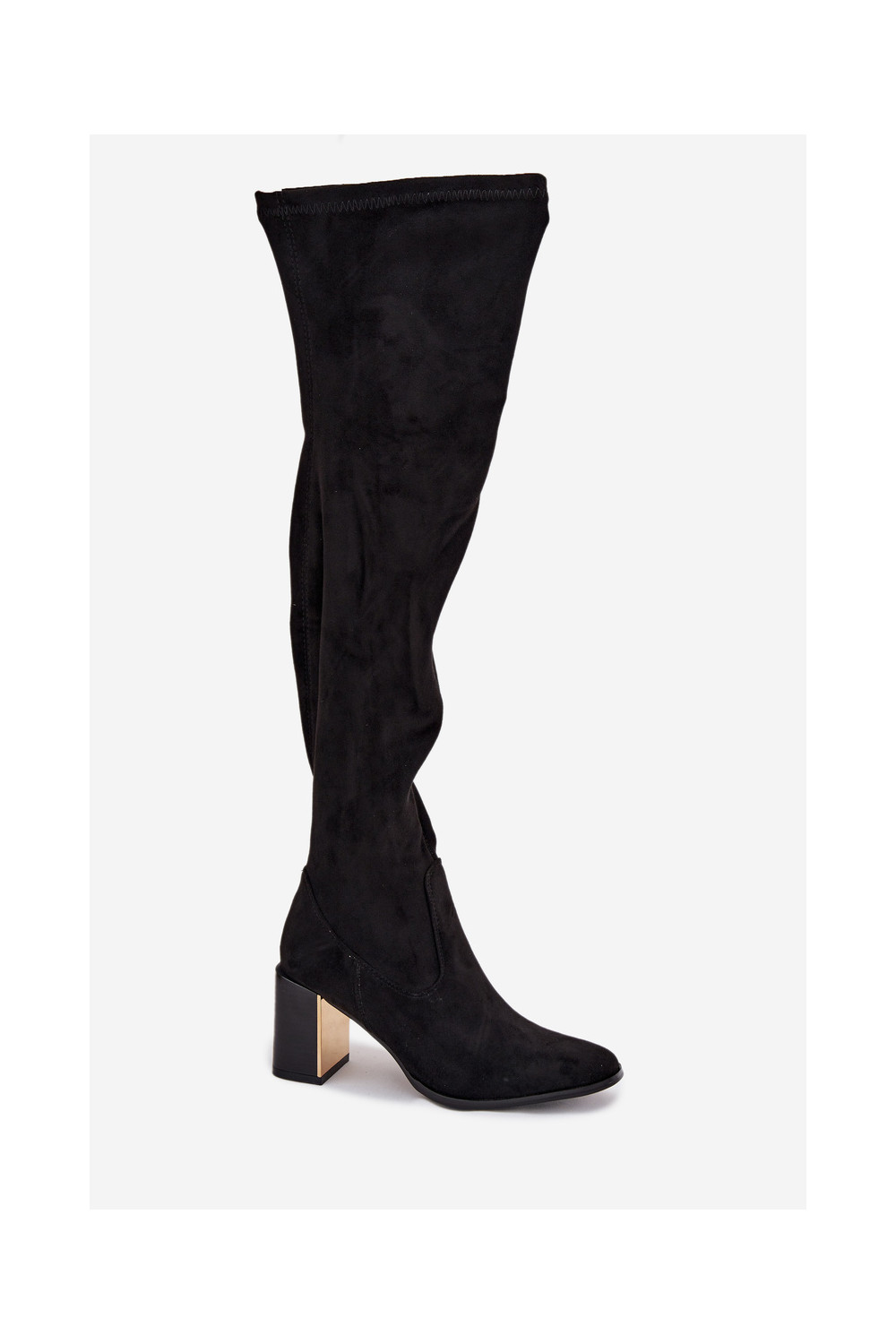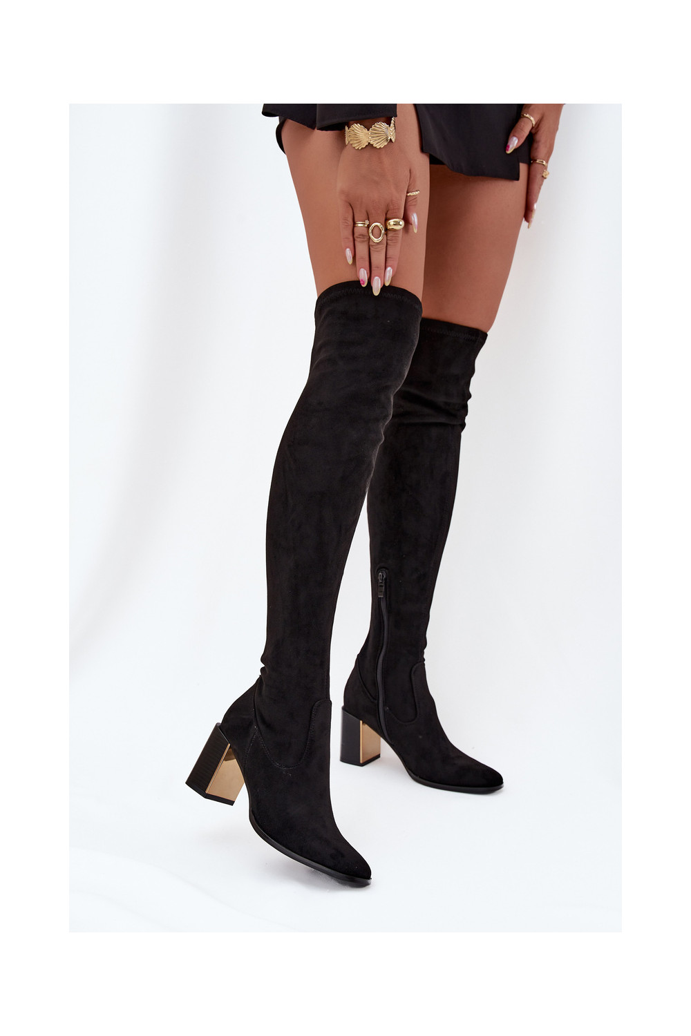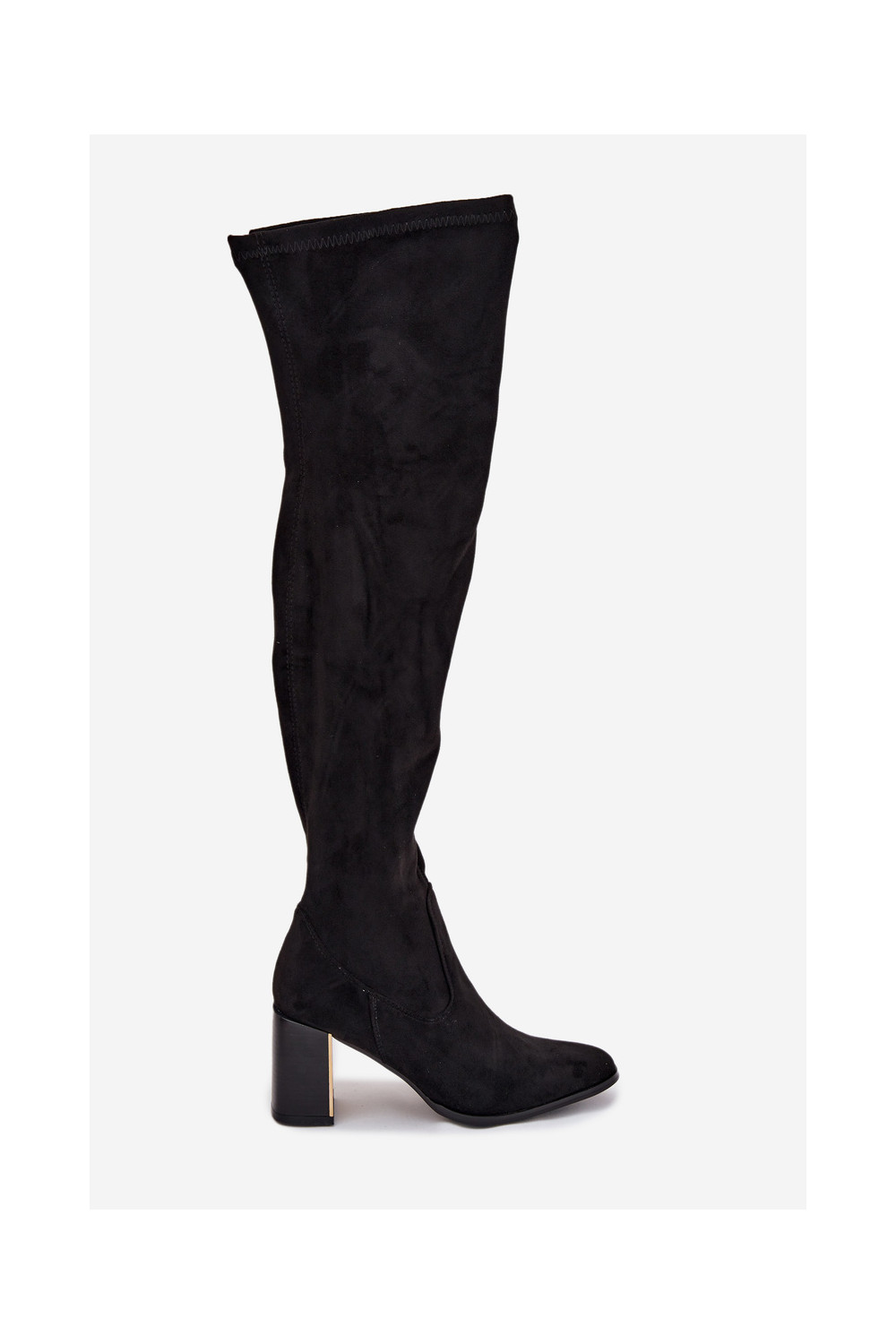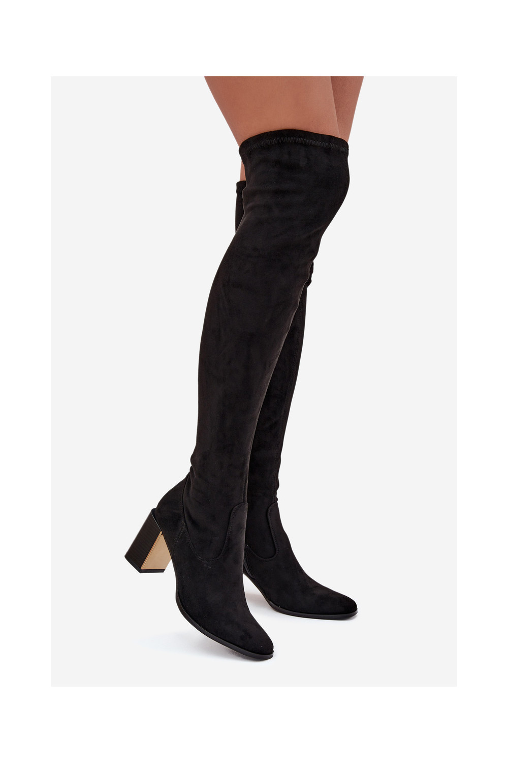 Moteriški ilgaauliai batai virš kelių su kulniukais iš dirbtinio zomšo juodos spalvos Jelina