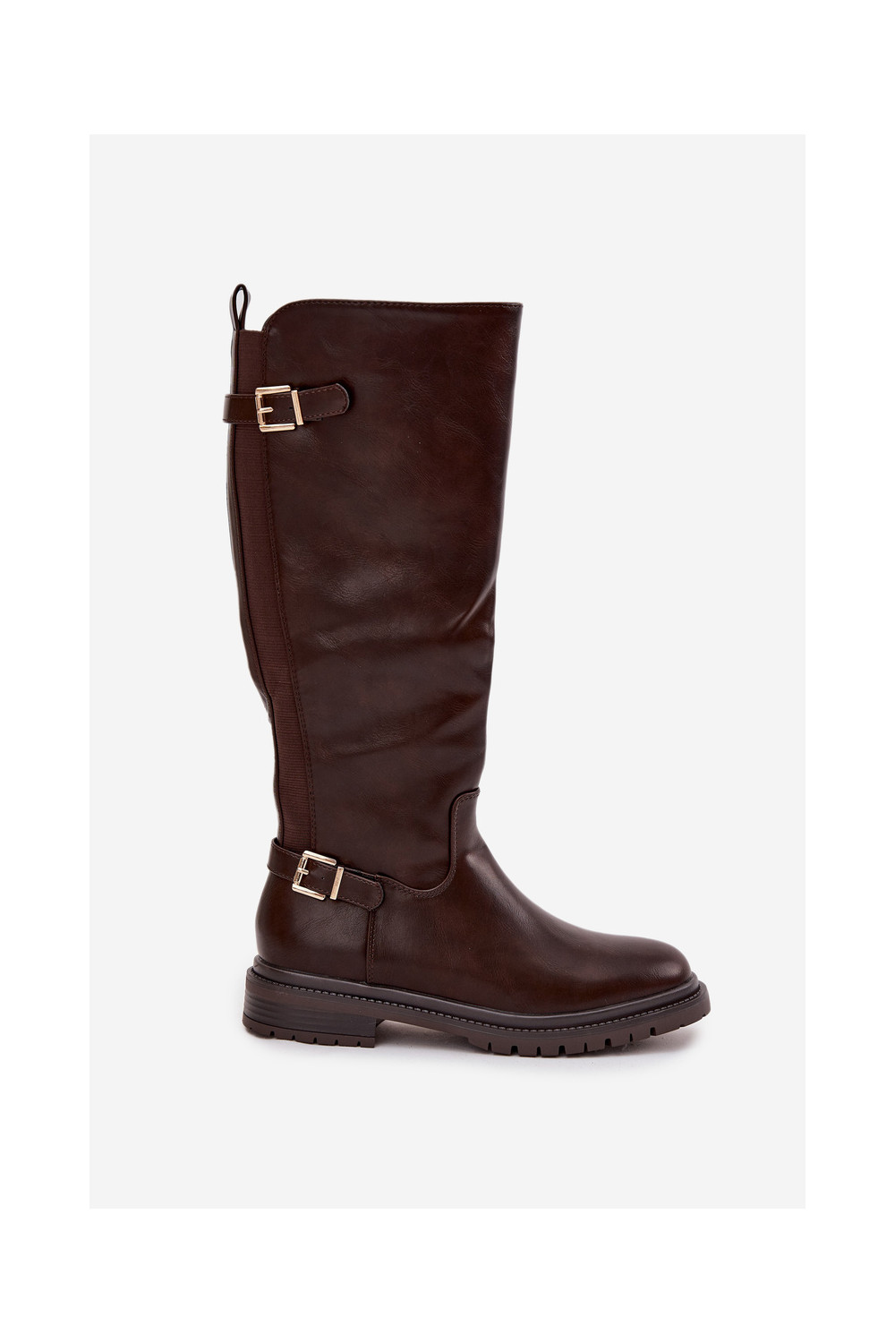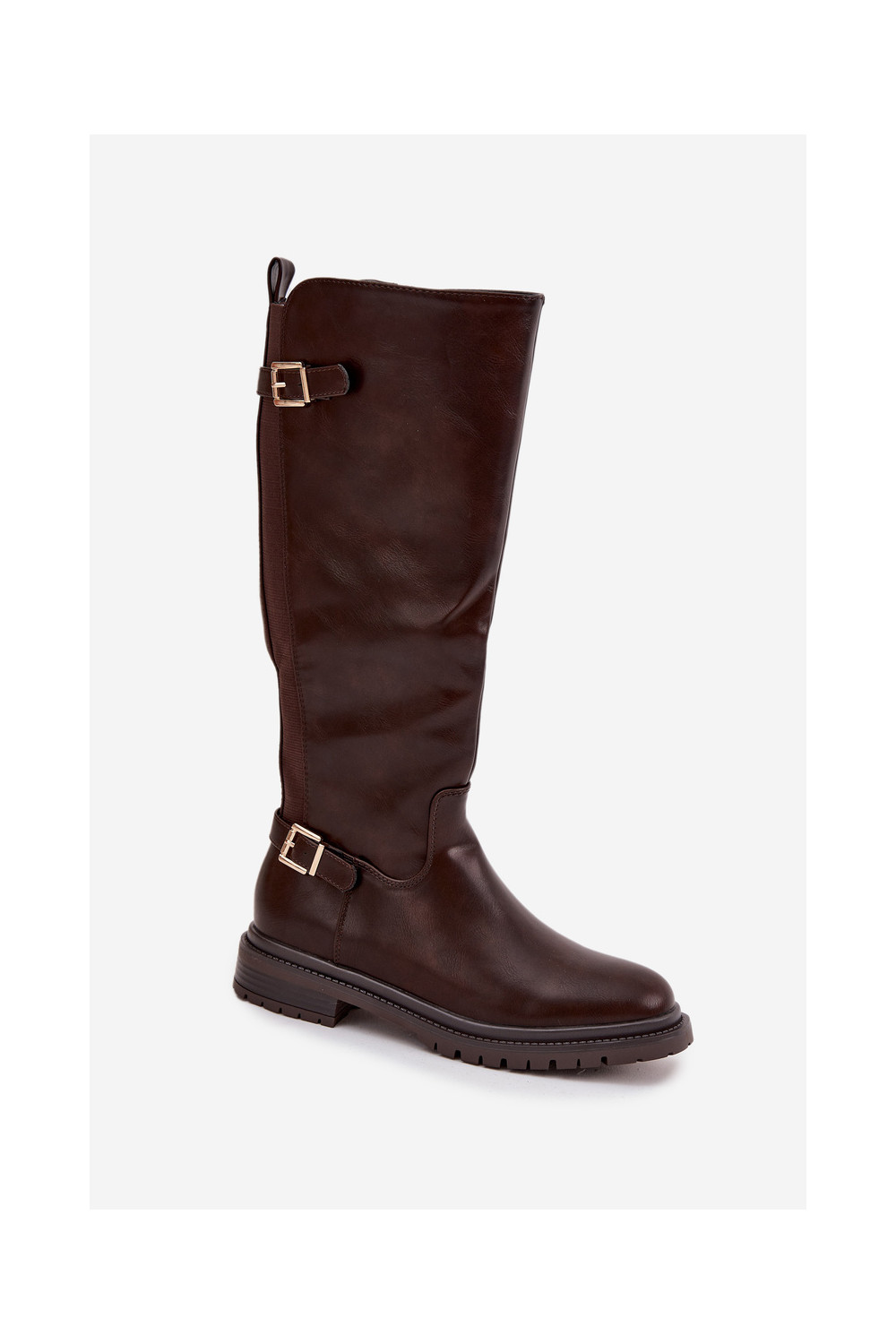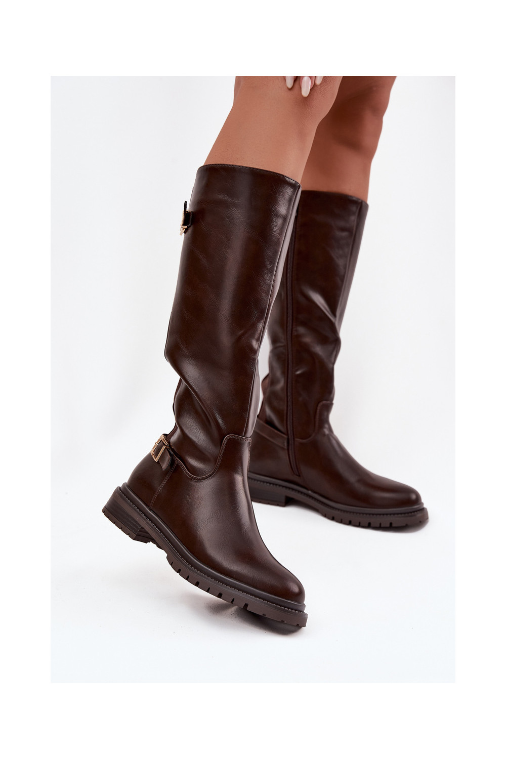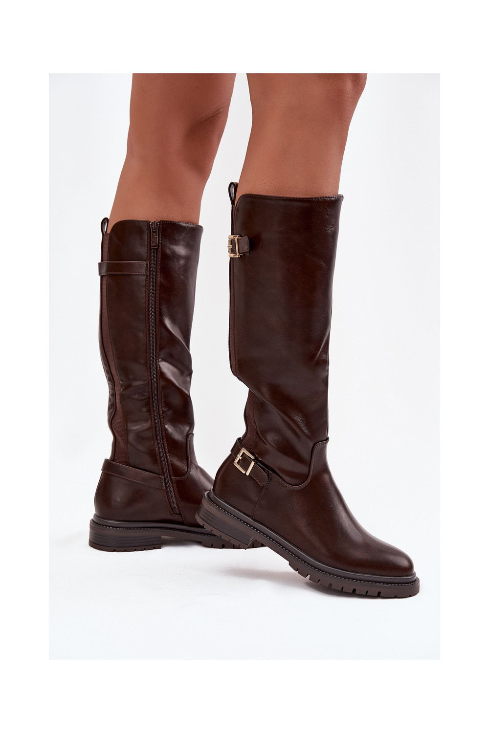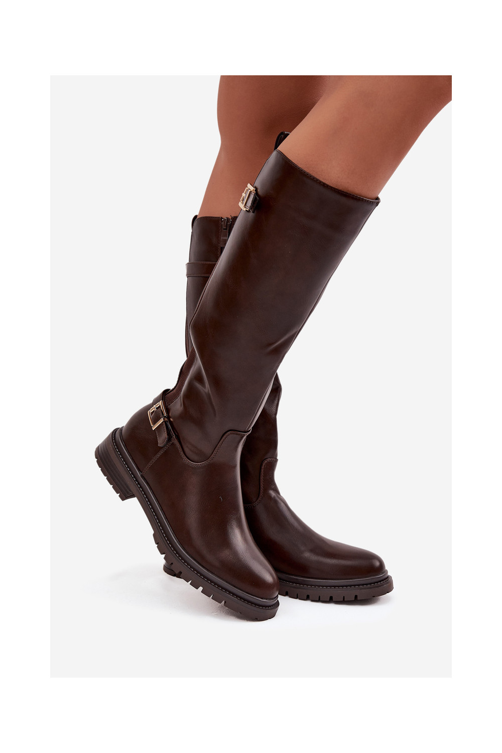 pašiltinti moteriški ilgaauliai batai su plačiais kulniukais su sagtimis CzekoladoĮe Sorelle
