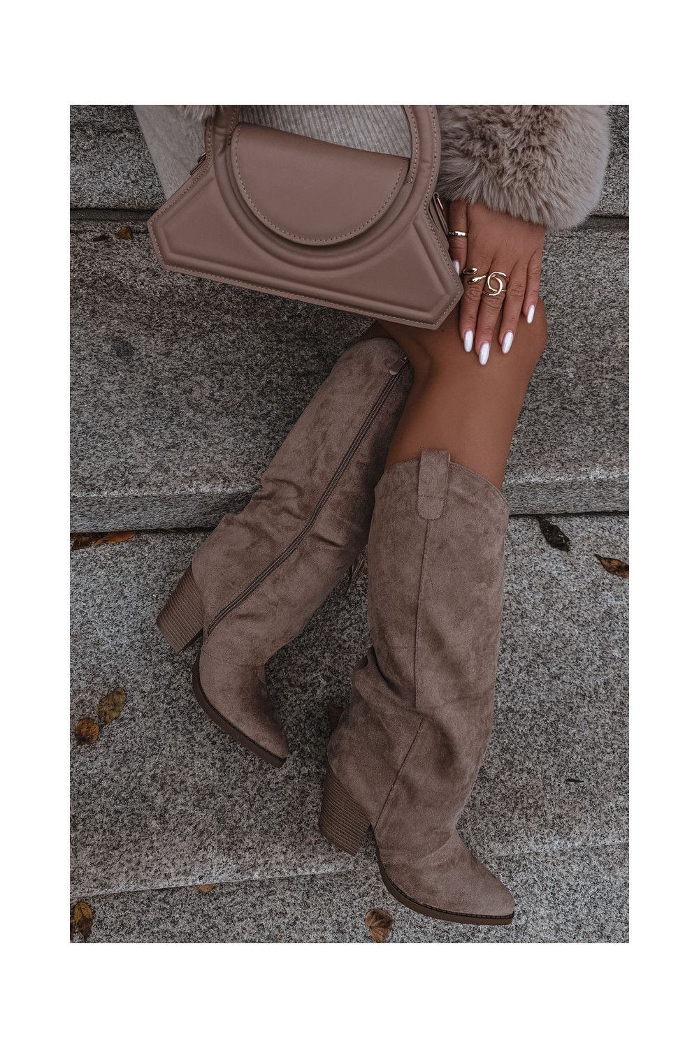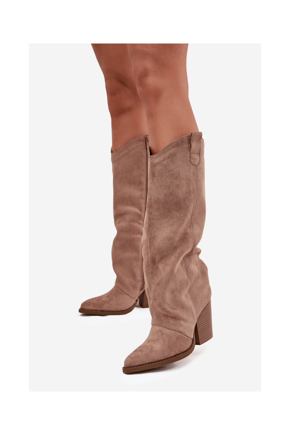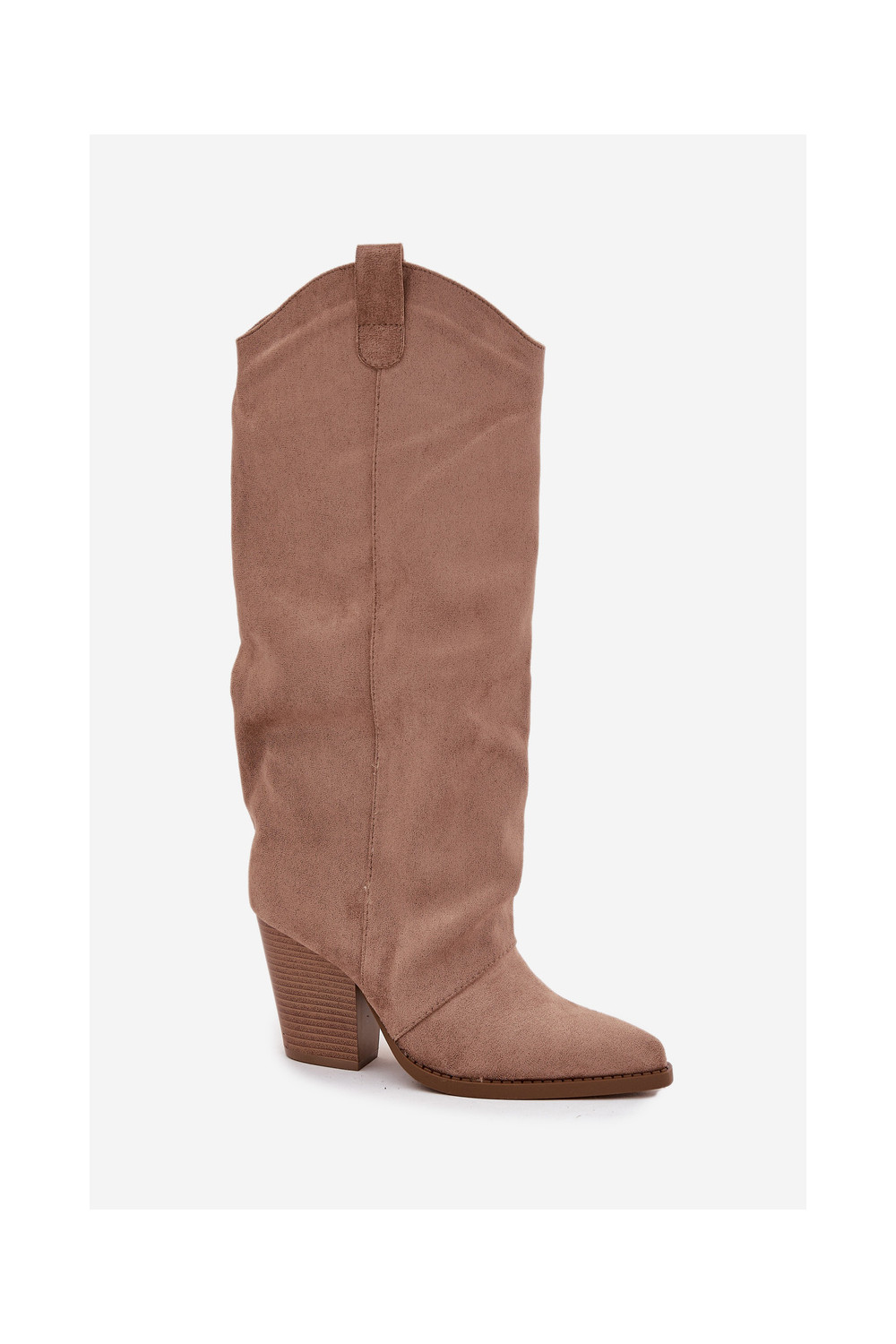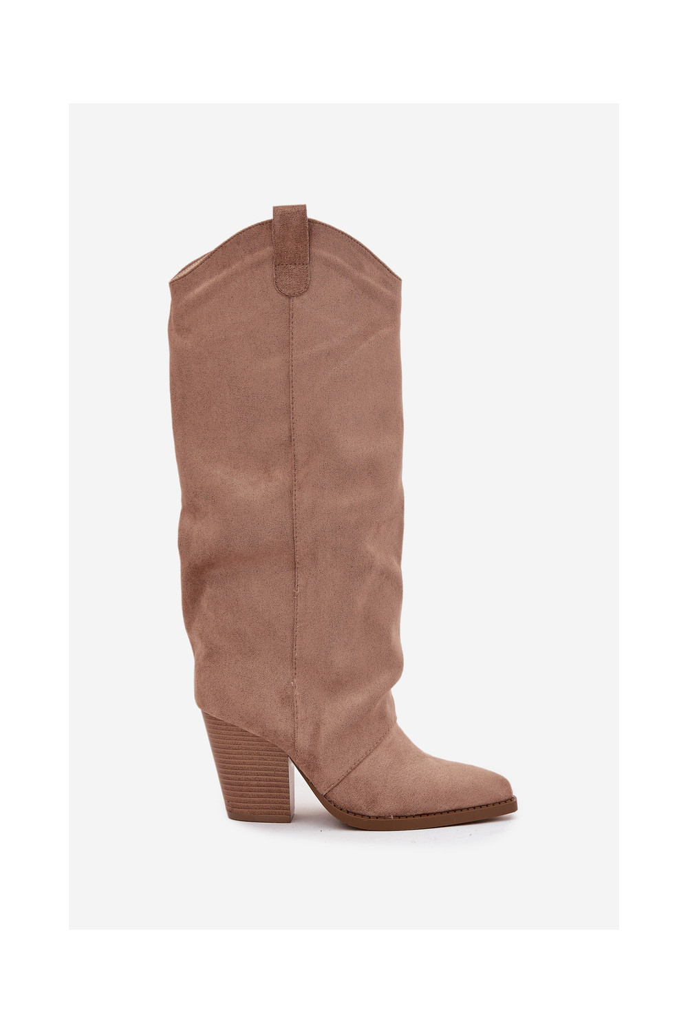 pašiltinti ilgaauliai batai kaubojiško stiliaus su kulniukaissuiš eko zomšosu smėlio spalvos Tai turivine