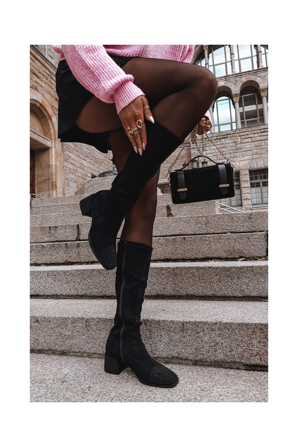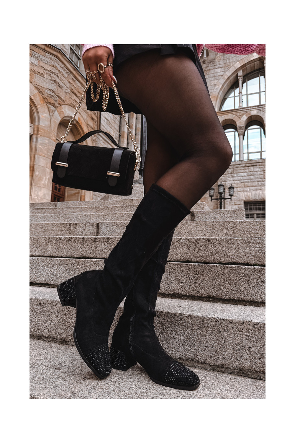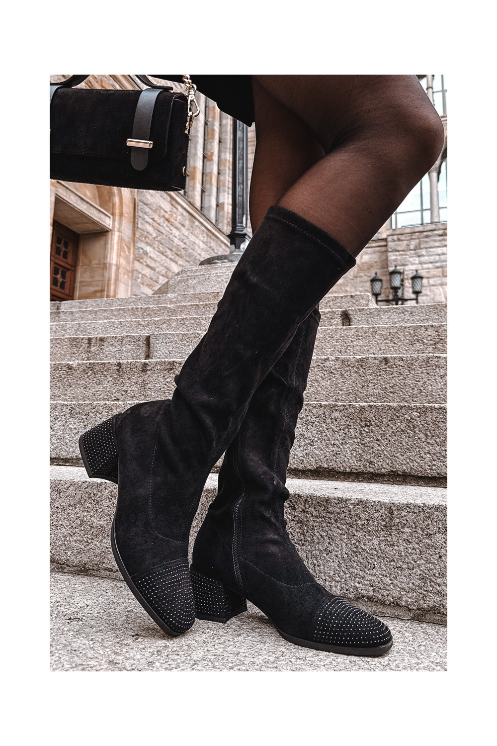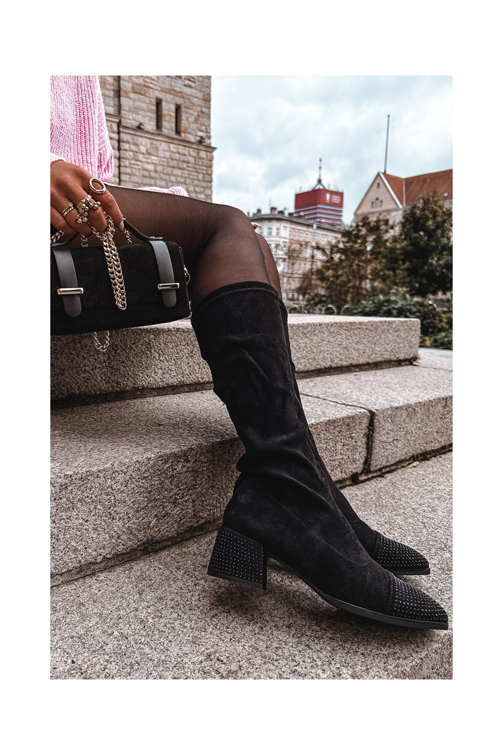 moteriški ilgaauliai batai Su dekoracija Klocke iš eko zomšosoĮe juodos spalvos Ivanna