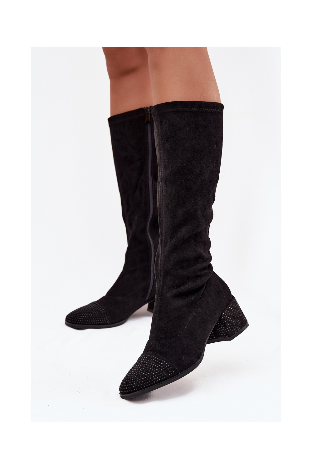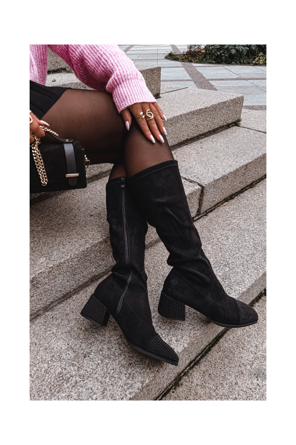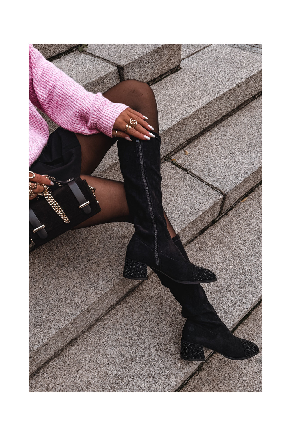 moteriški ilgaauliai batai Su dekoracija Klocke iš eko zomšosoĮe juodos spalvos Ivanna