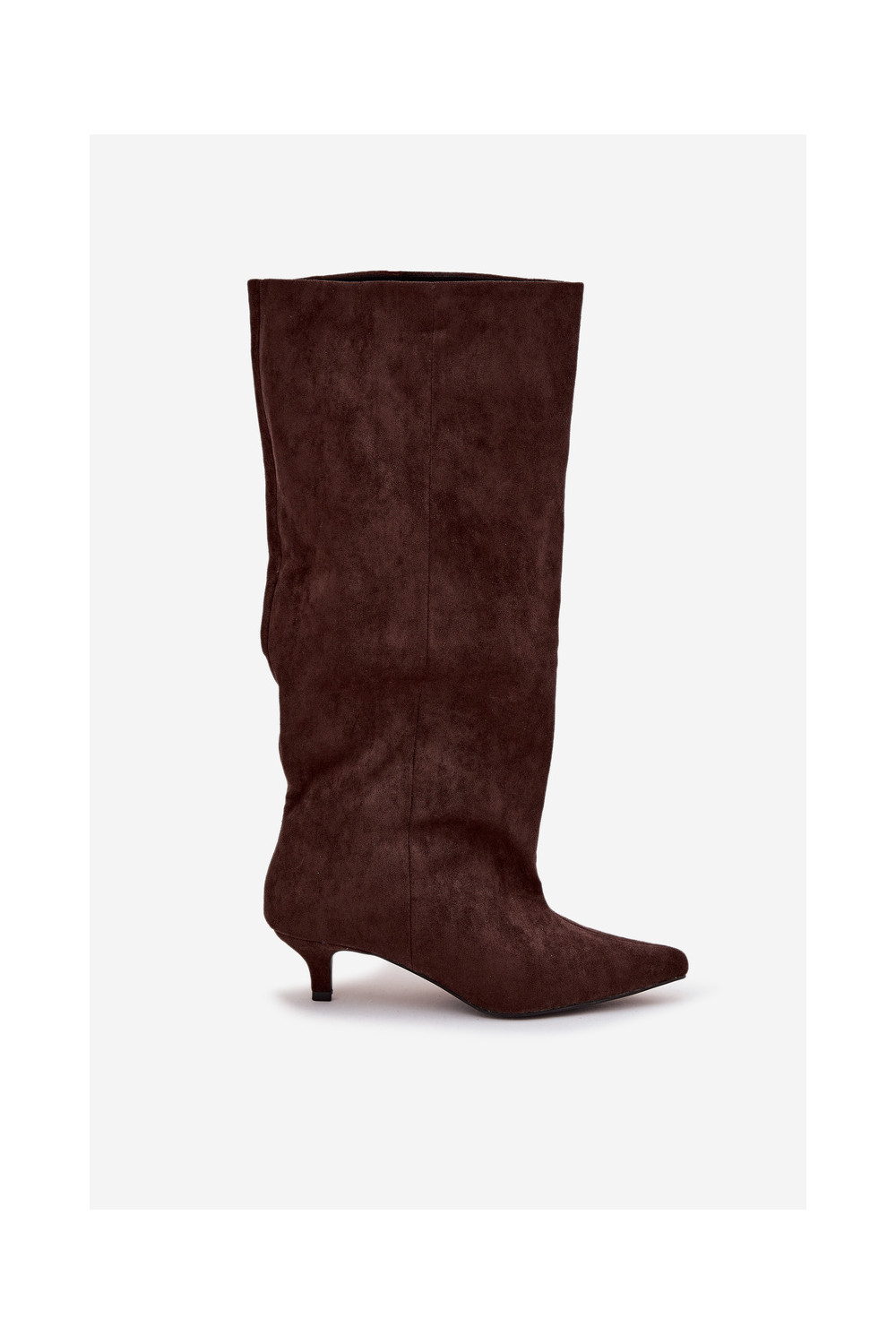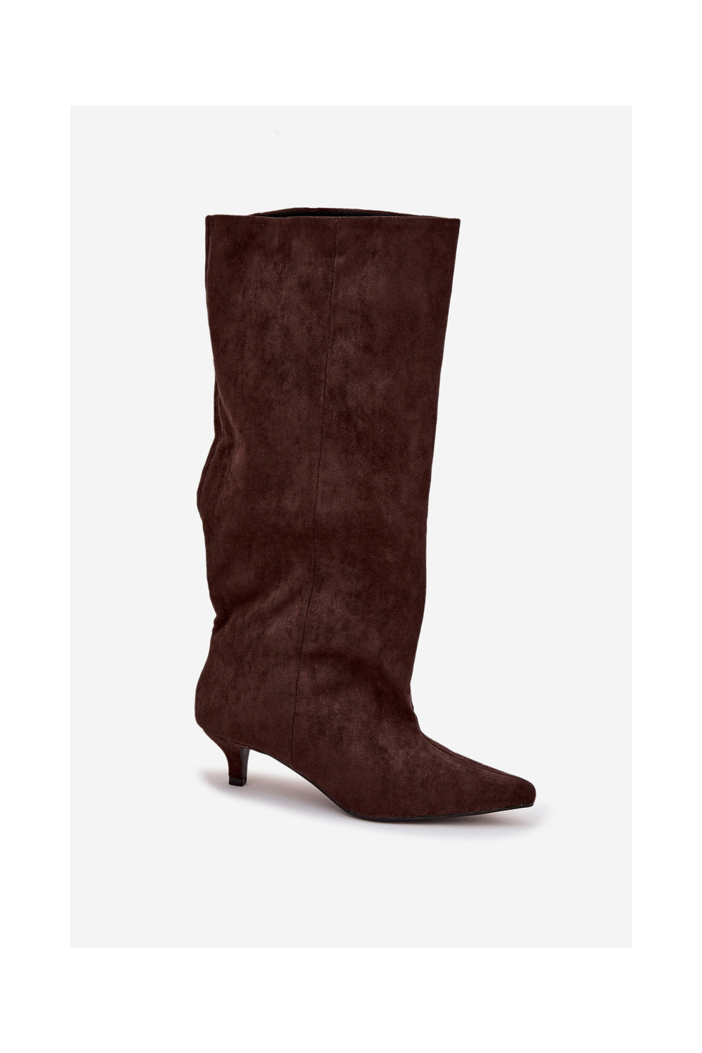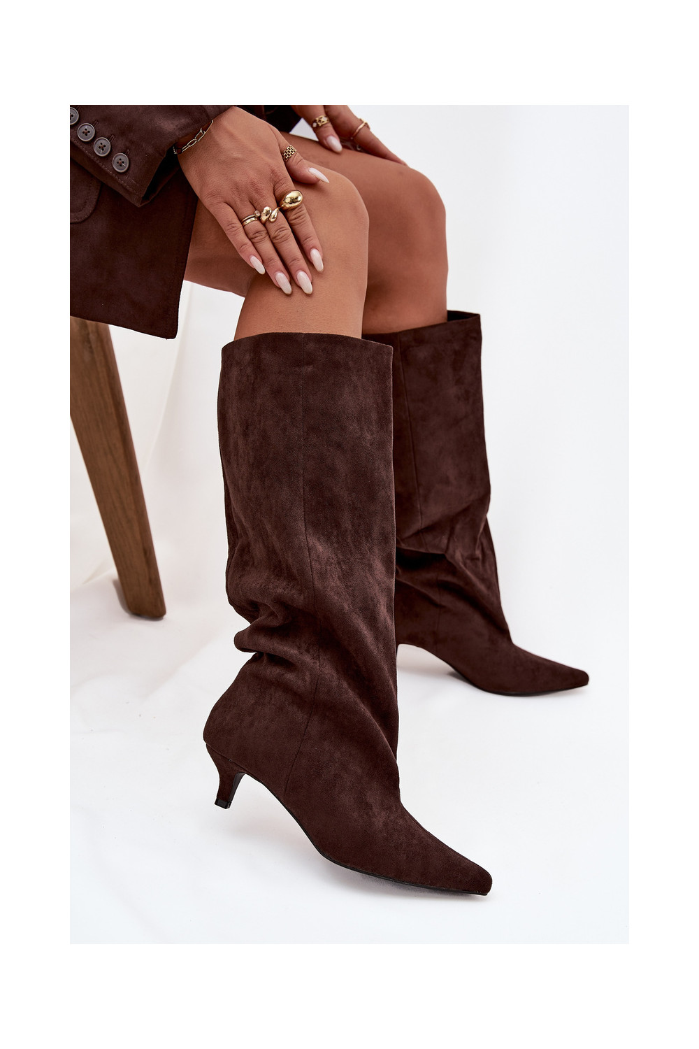 Moteriški ilgaauliai batai su kulniukais iš dirbtinės zomšos šokoladinės spalvos Pheona