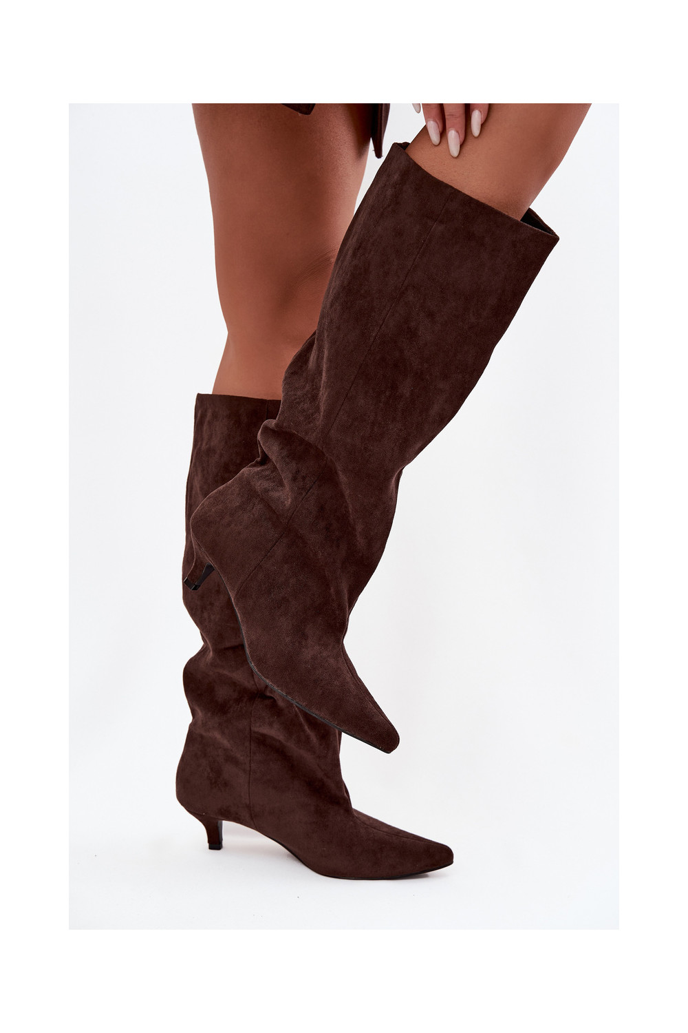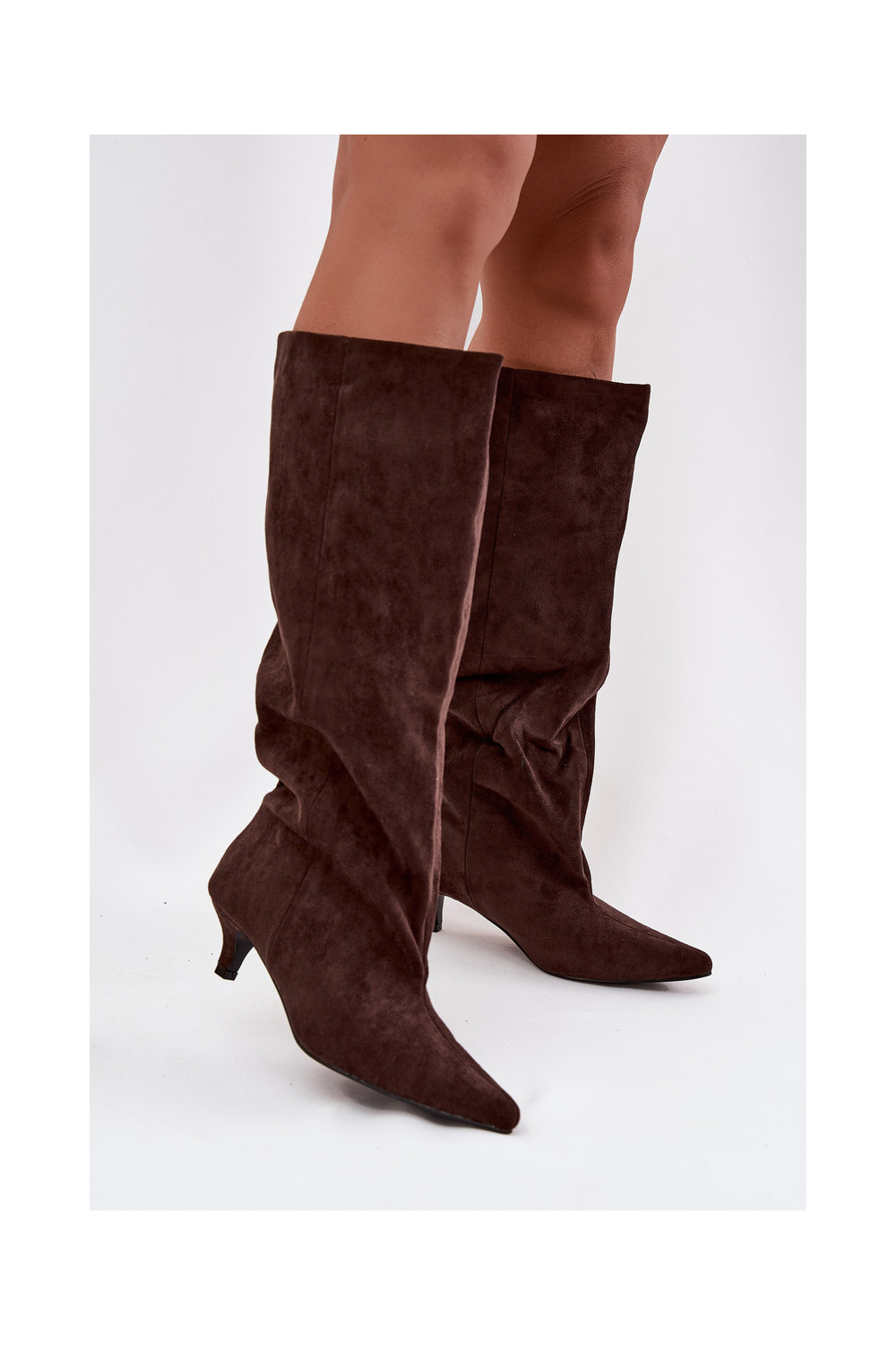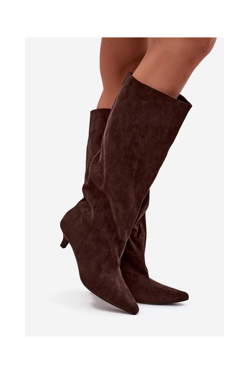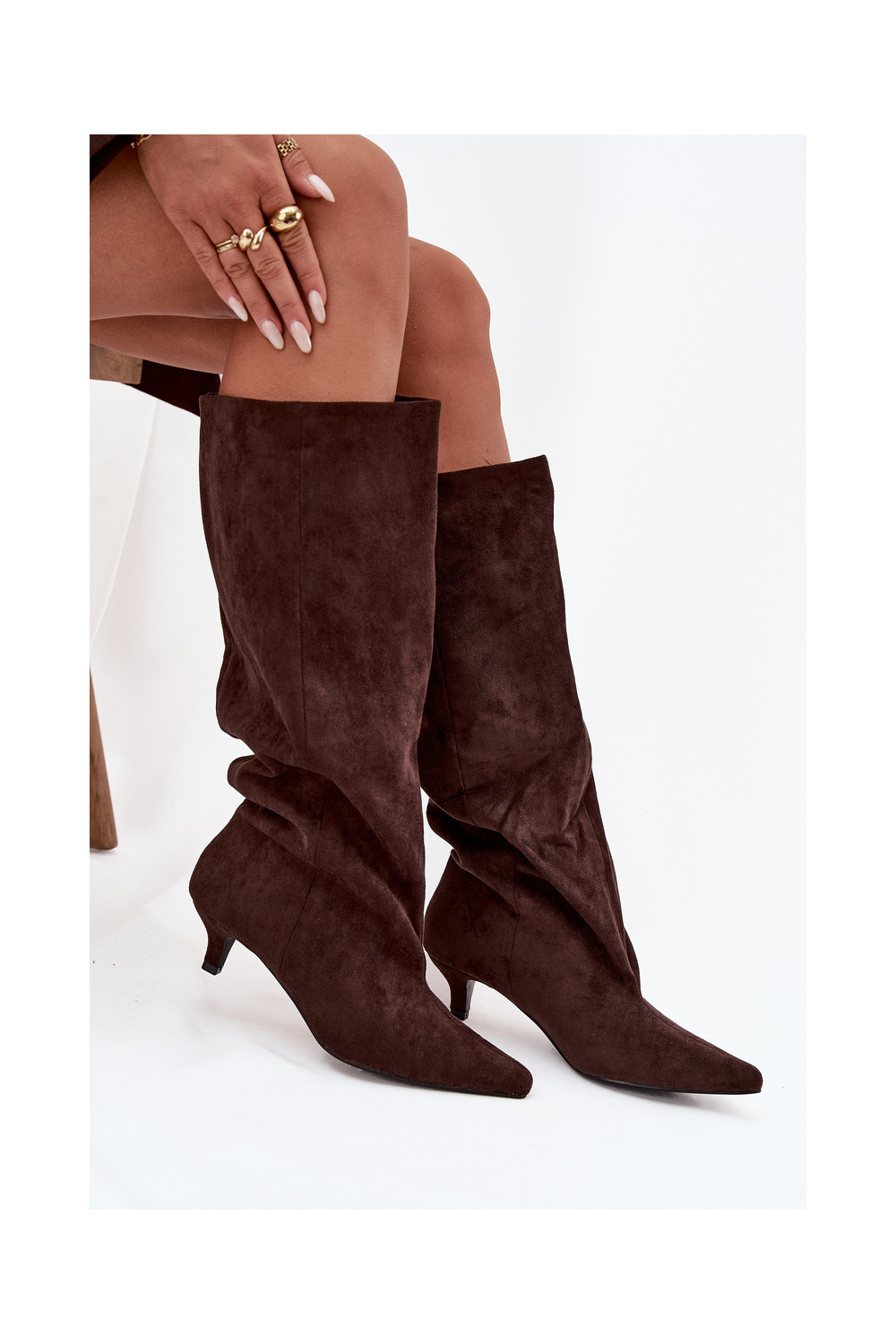 Moteriški ilgaauliai batai su kulniukais iš dirbtinės zomšos šokoladinės spalvos Pheona