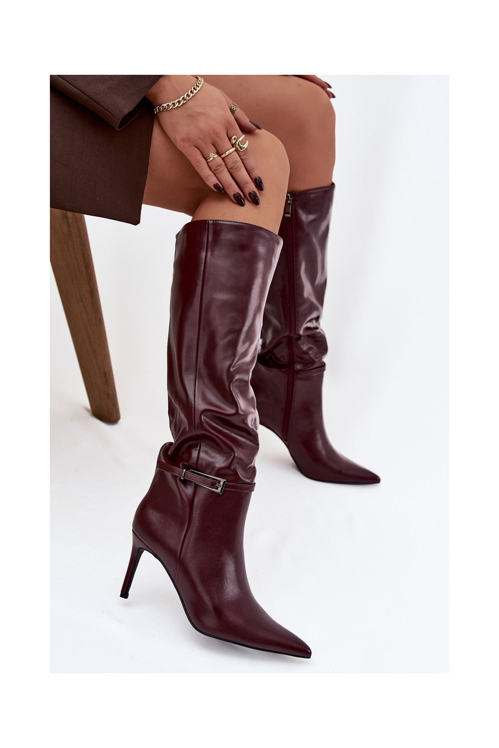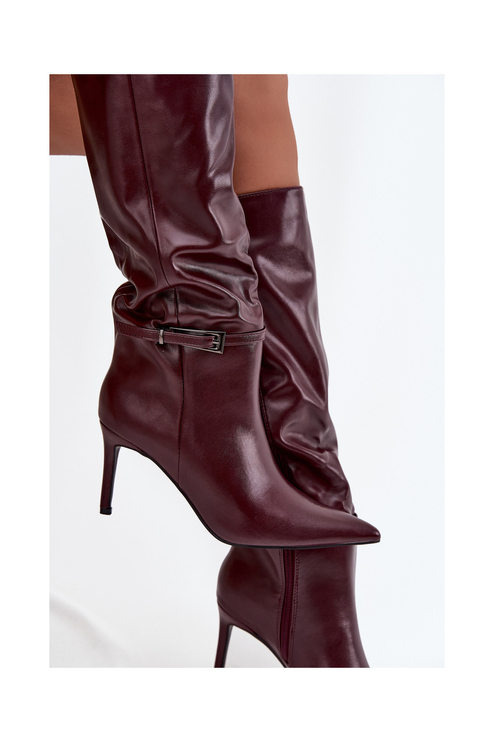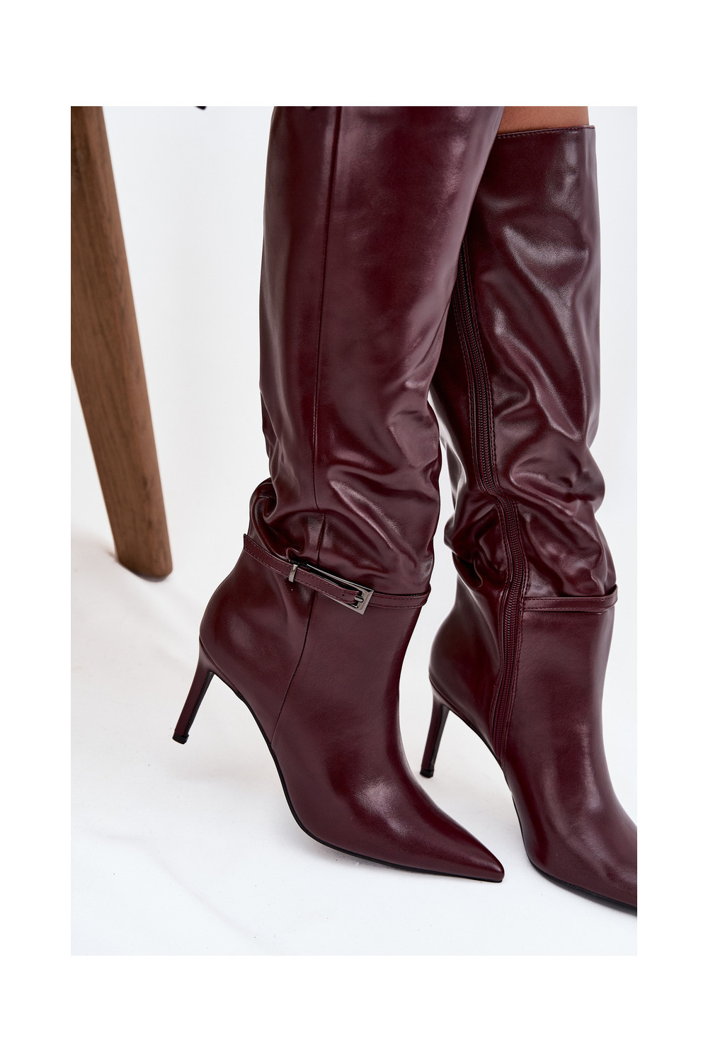 Moteriški ilgaauliai batai su plonais kulniukais ir dirželiais bordo spalvos Lisanne
