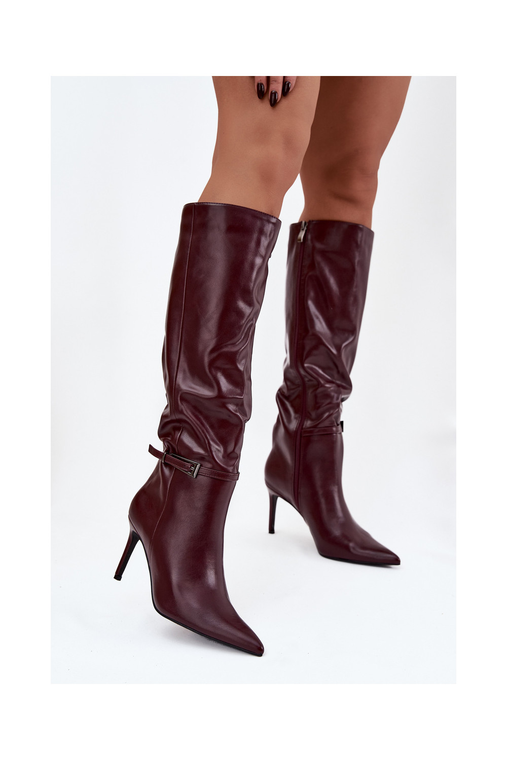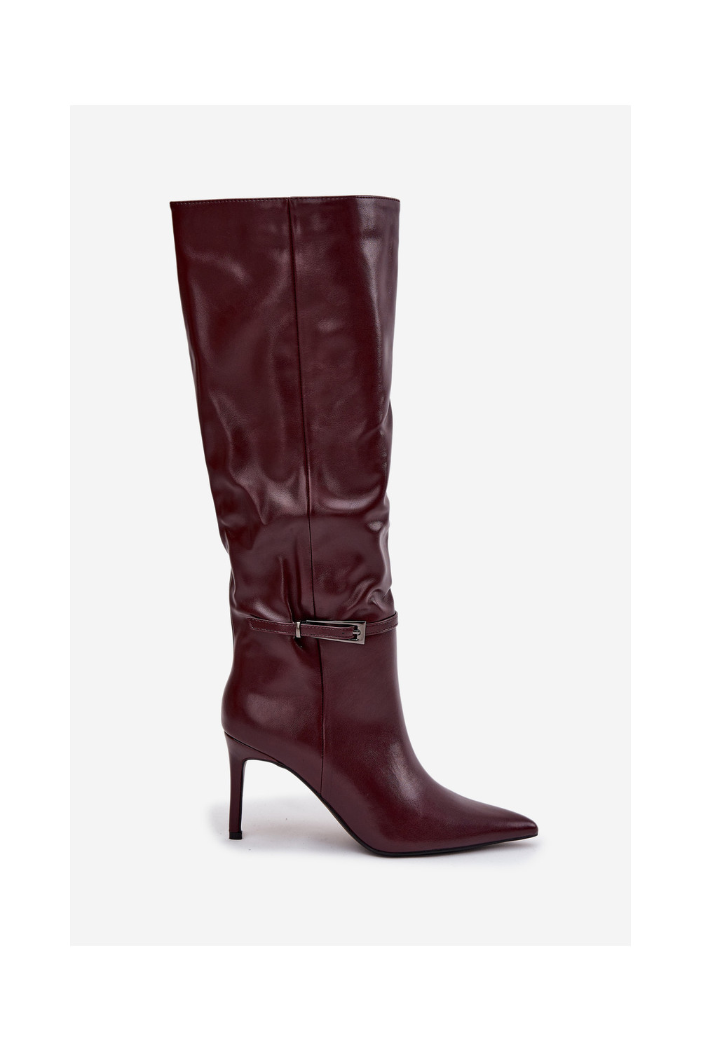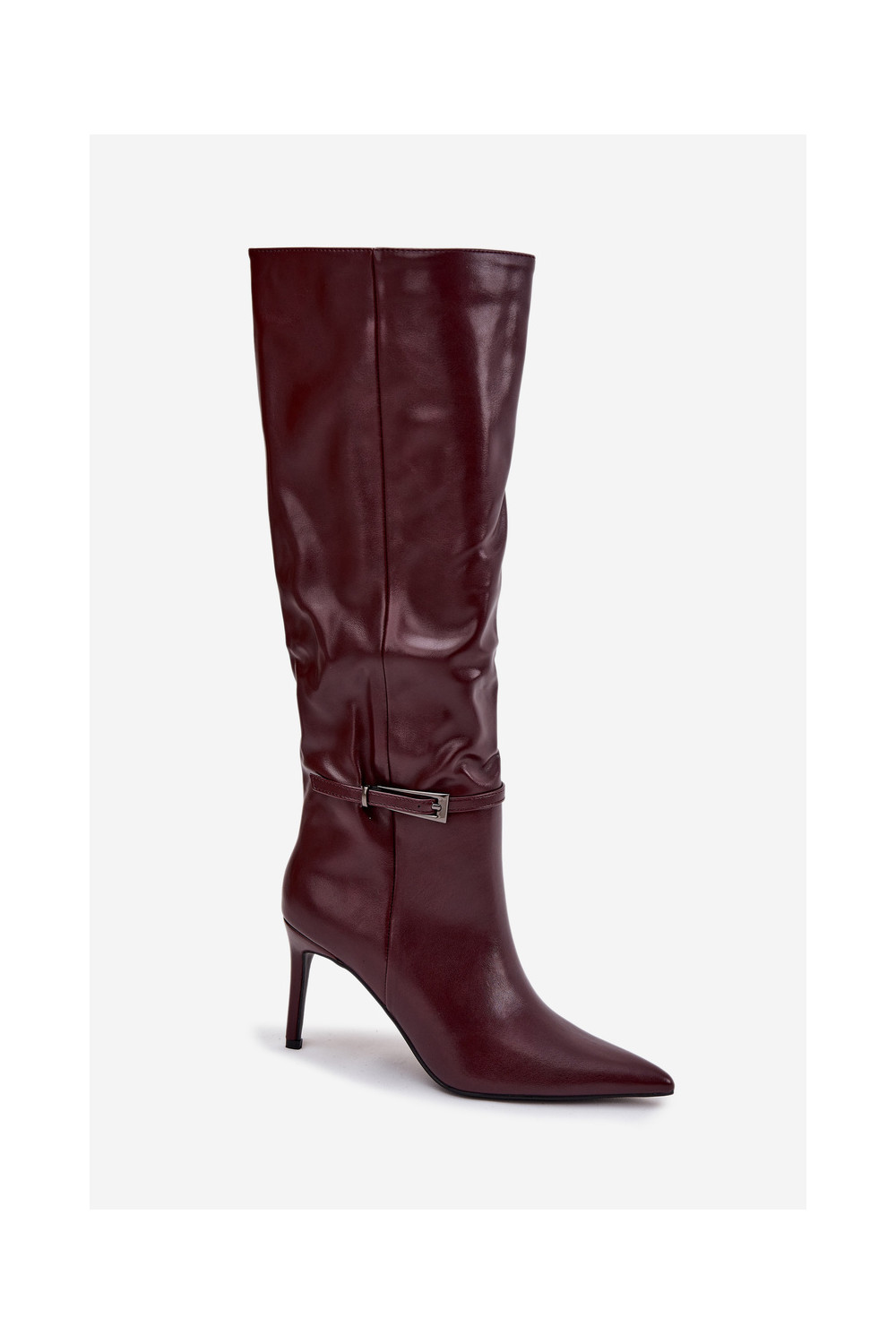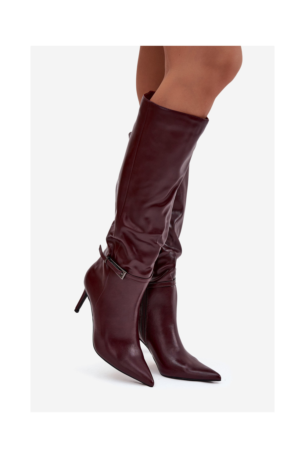Moteriški ilgaauliai batai su plonais kulniukais ir dirželiais bordo spalvos Lisanne