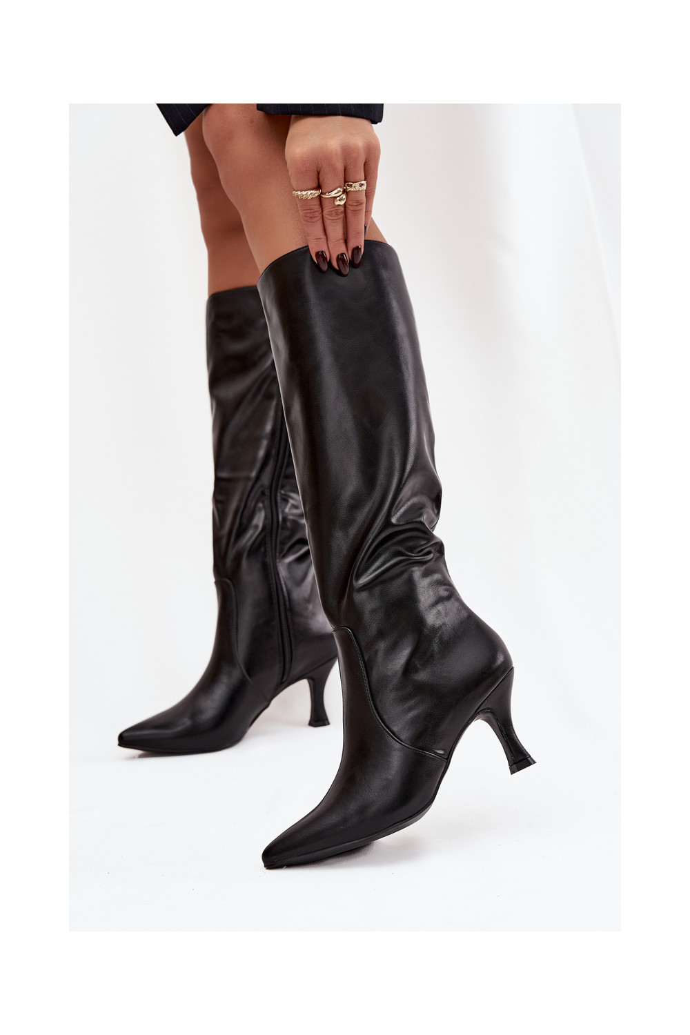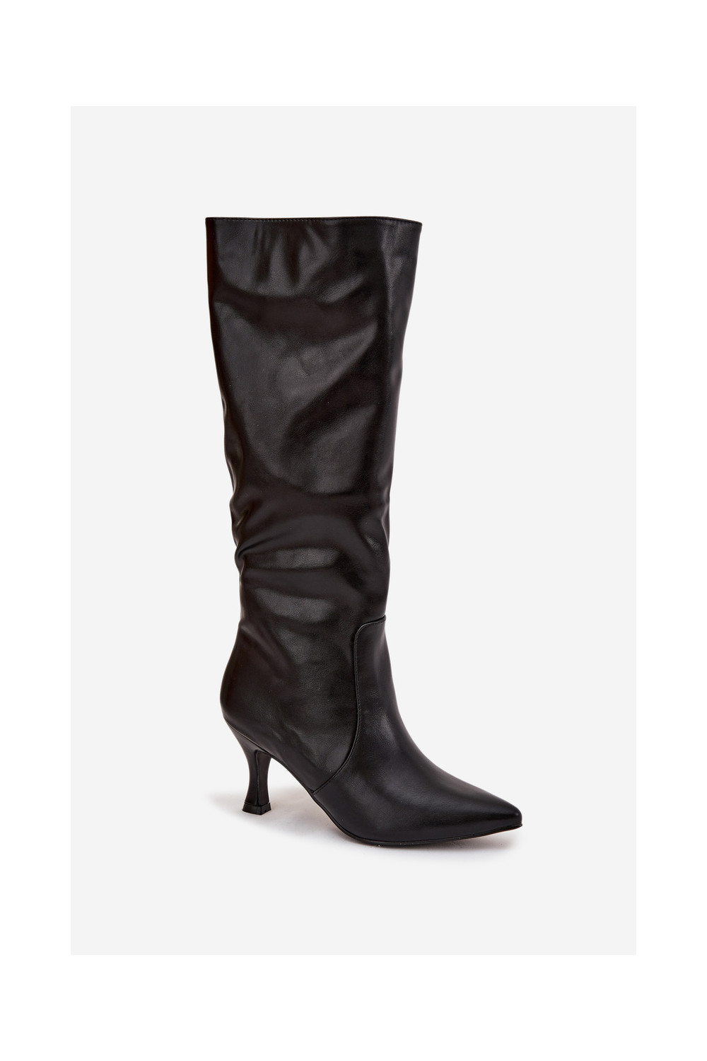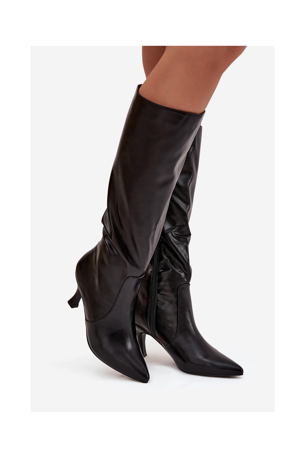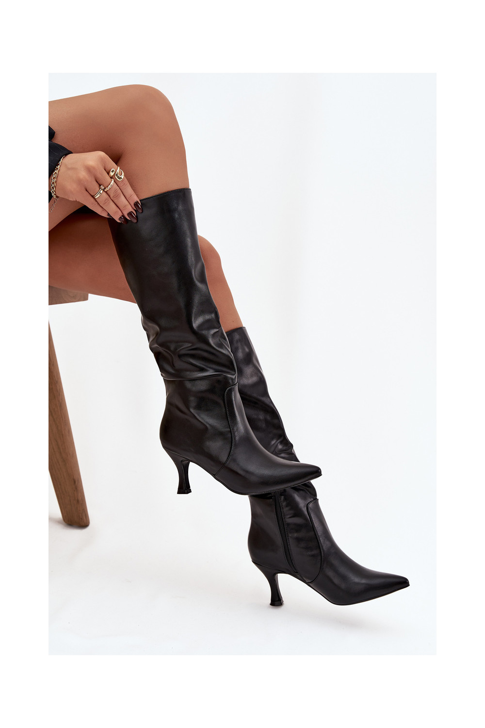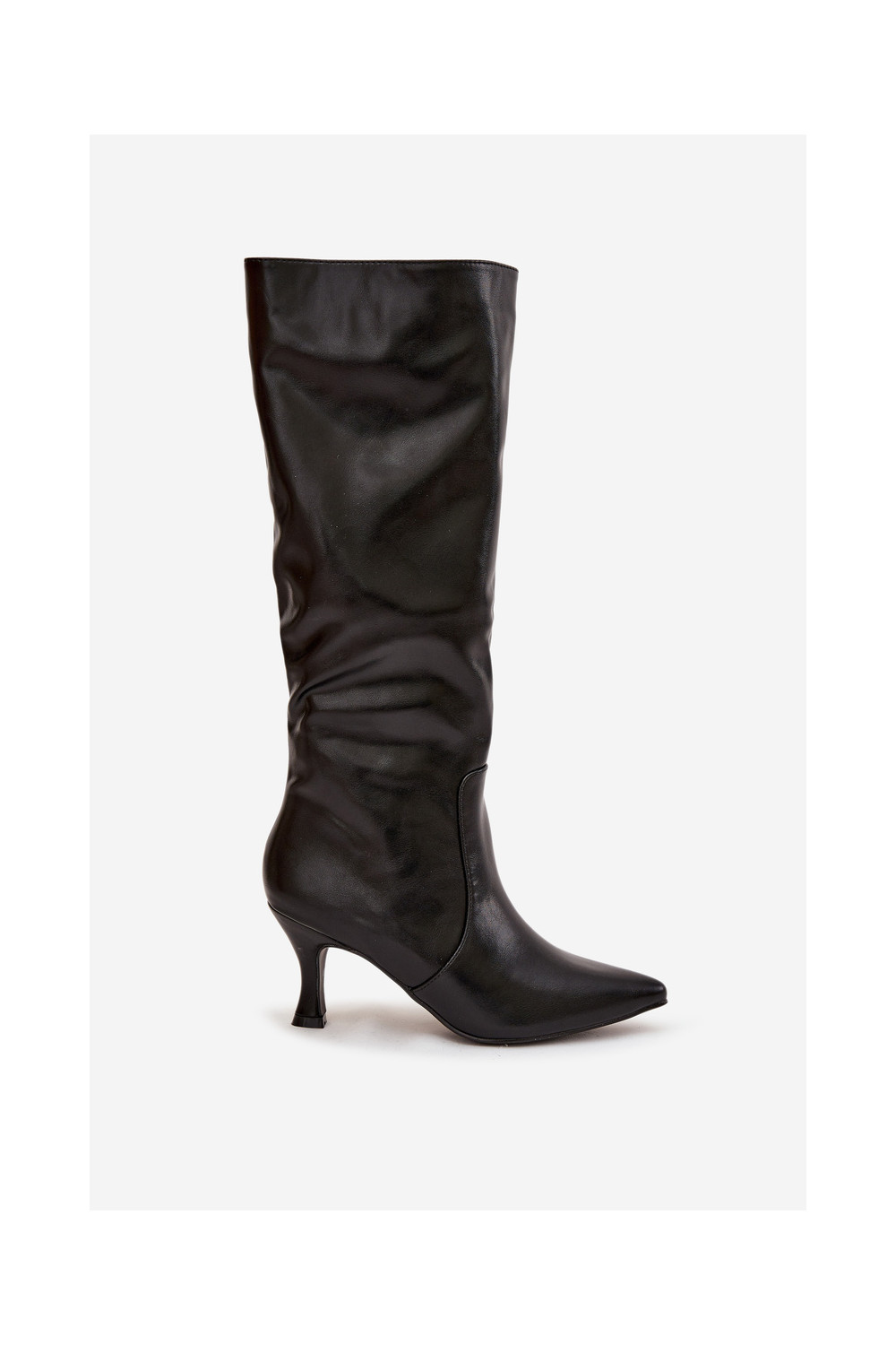 Moteriški ilgaauliai batai su plonais kulniukais iš dirbtinės odos juodos spalvos Karella