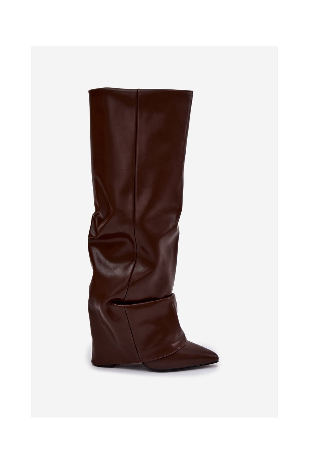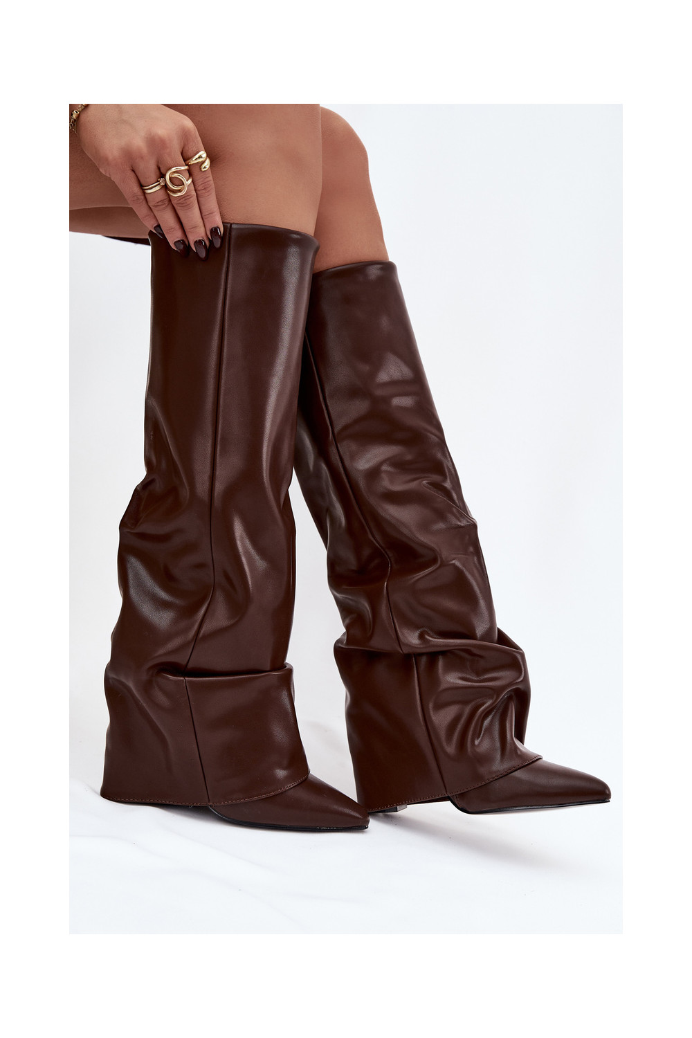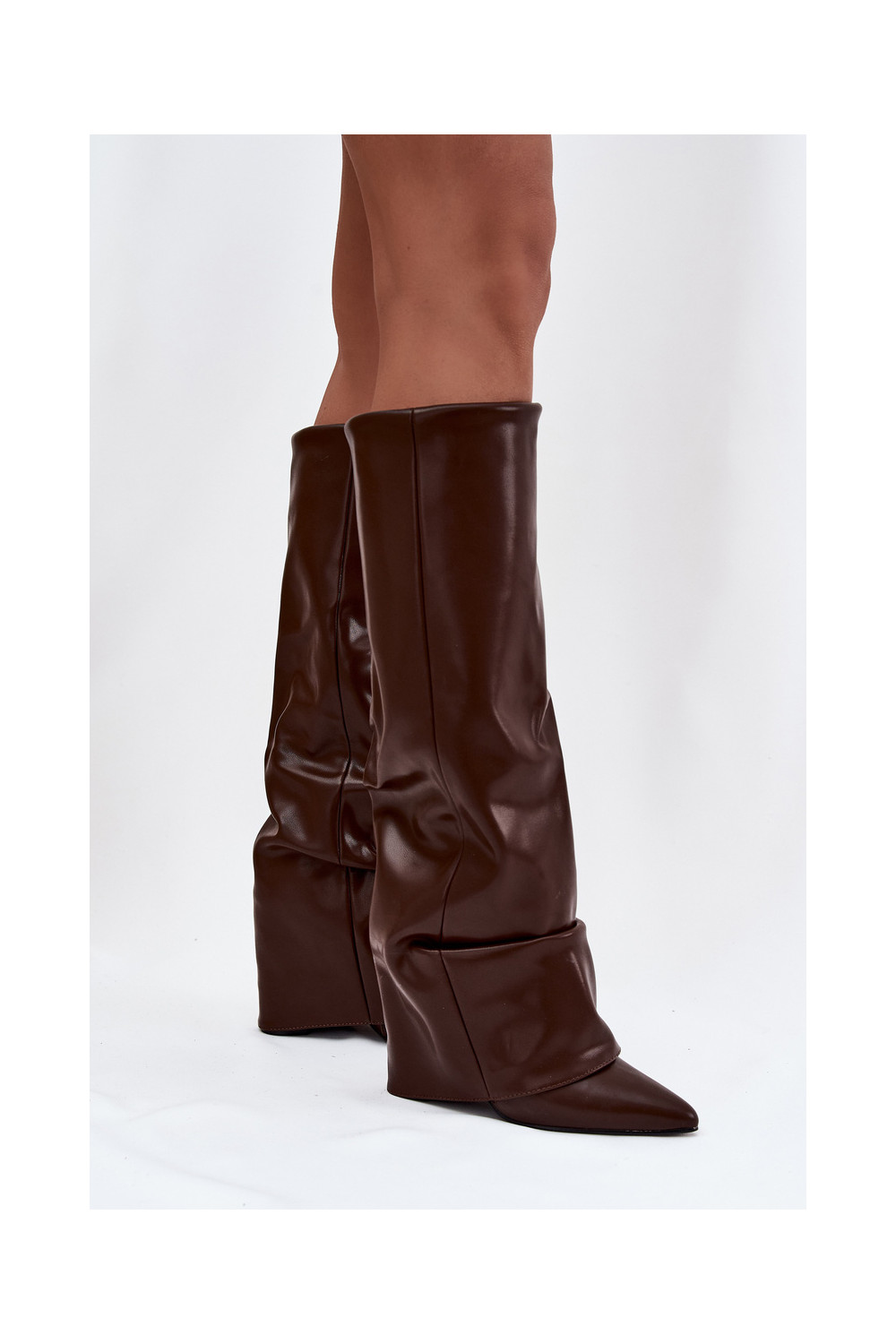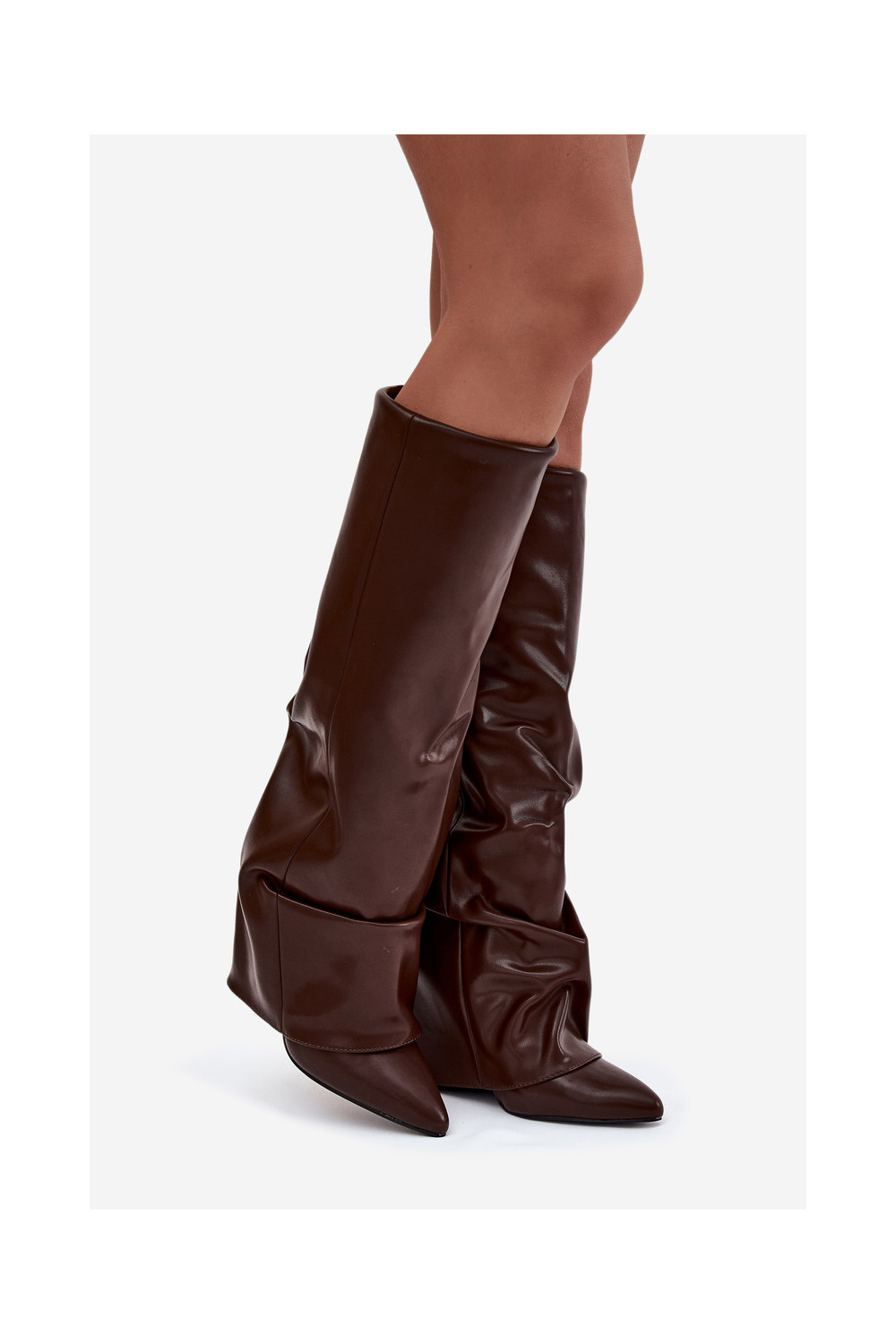 Šokoladinės spalvos šilti moteriški ilgaauliai batai su atvyniotais aulais ant kulniukų Elivira