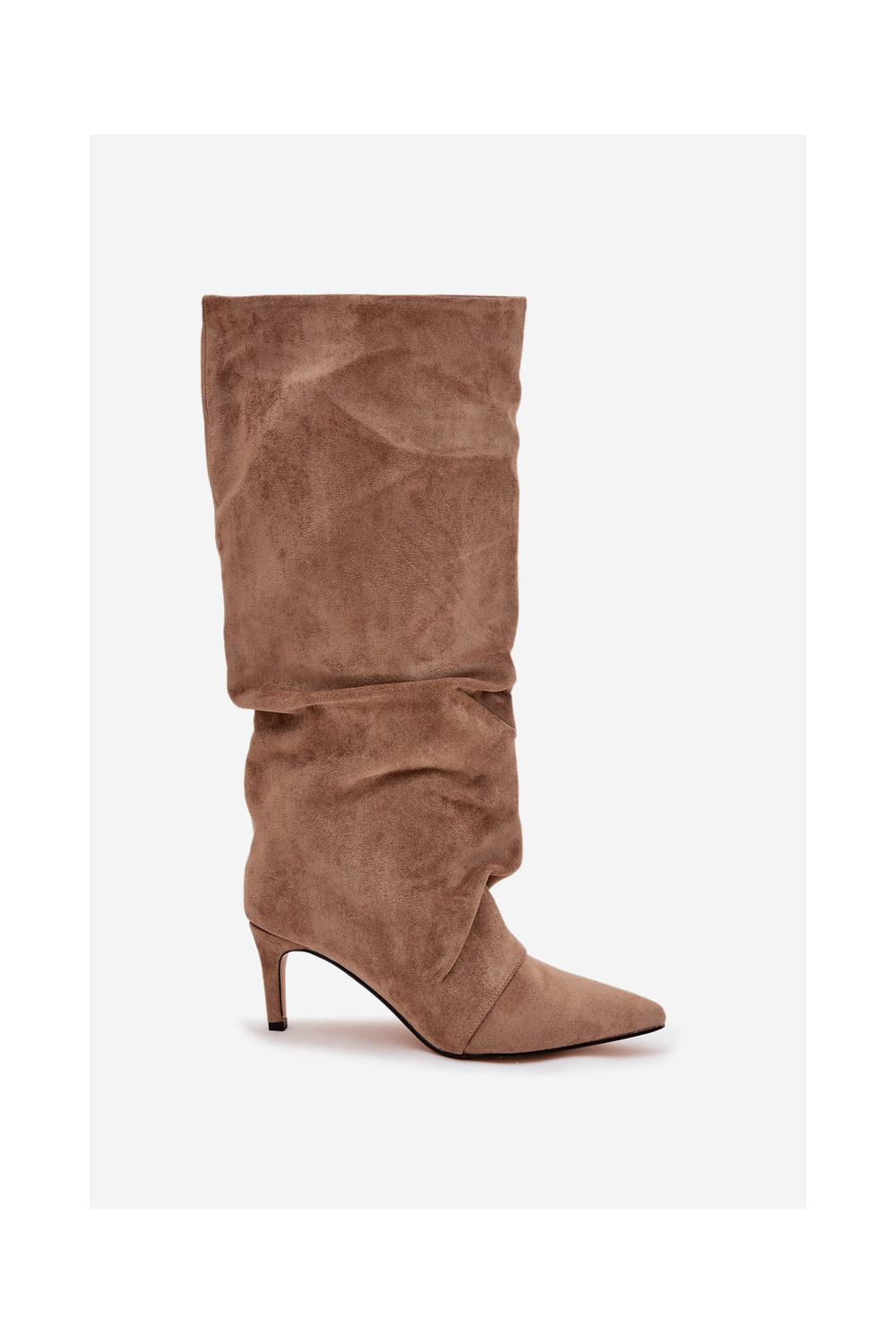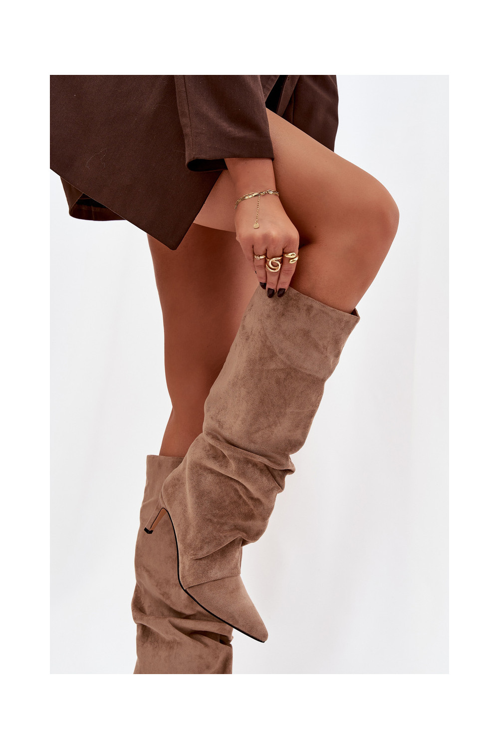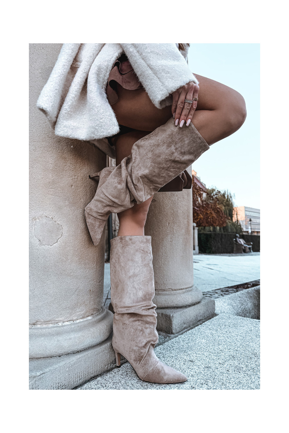 Smėlio spalvos susiraukšlėję pašiltinti ilgaauliai batai su plonais kulniukais iš dirbtinio zomšo Tai turivella