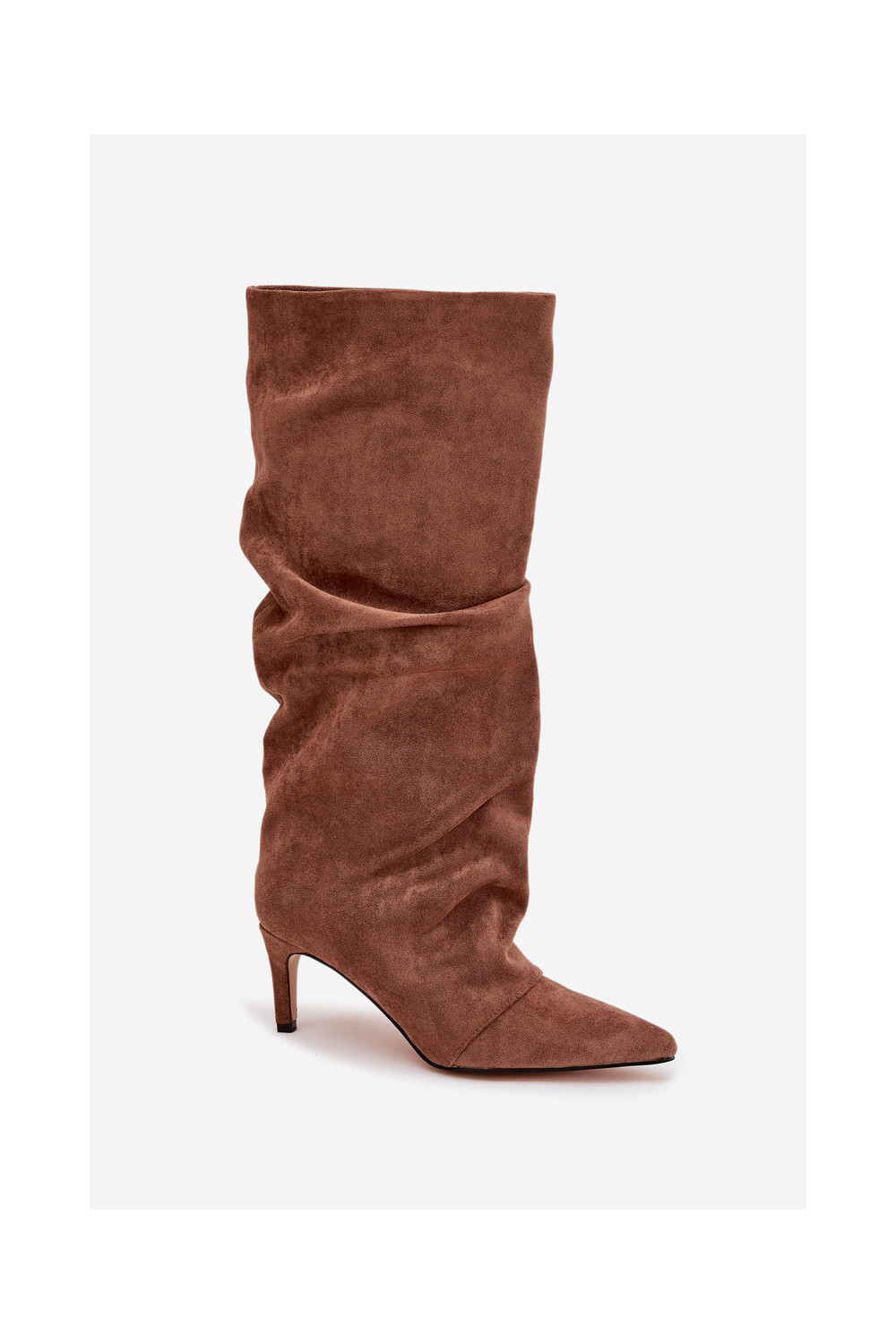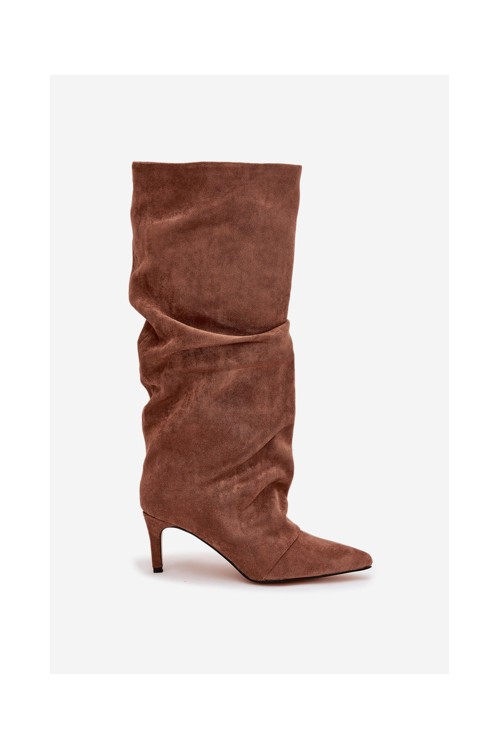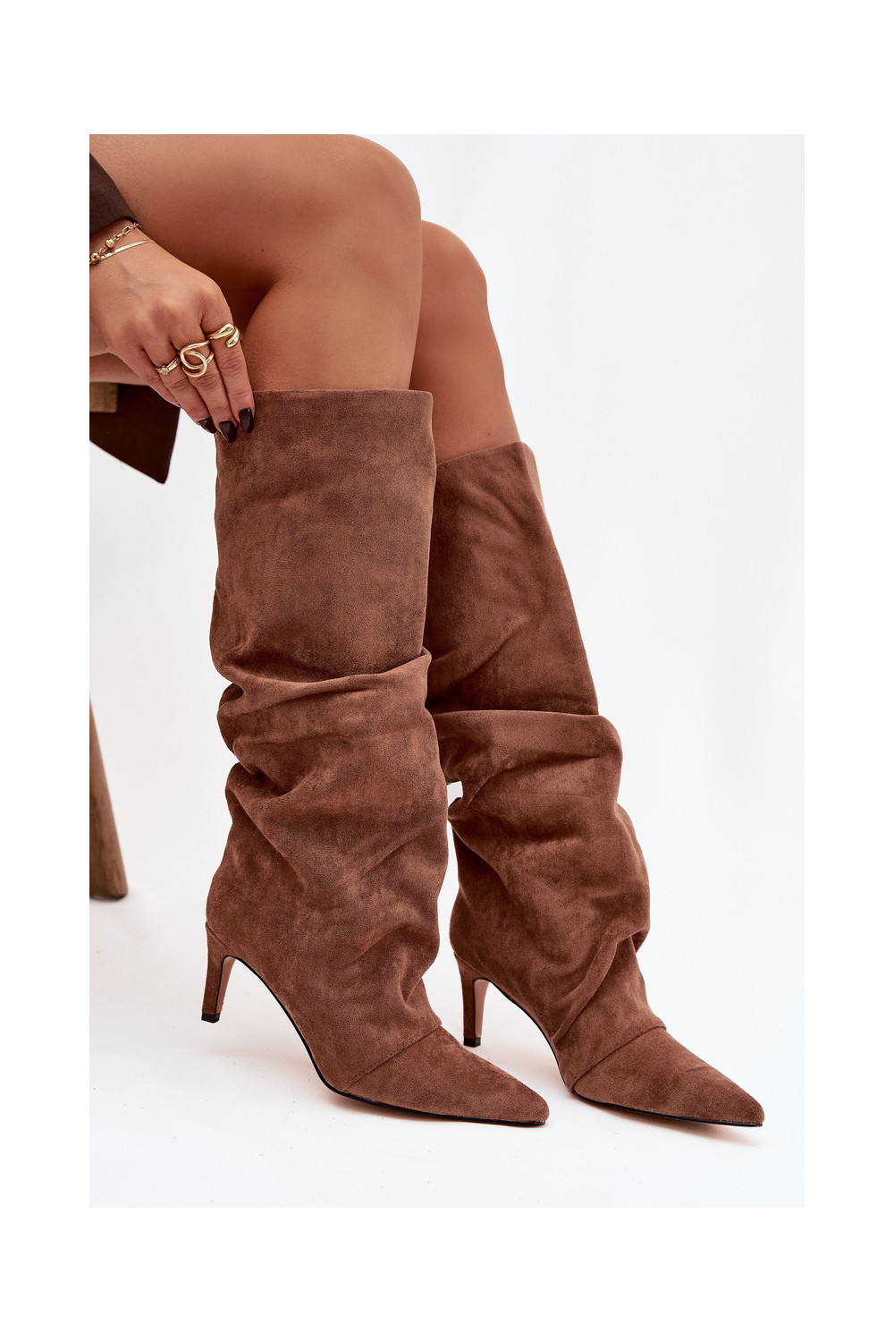 Smėlio spalvos susiraukšlėję pašiltinti ilgaauliai batai su plonais kulniukais iš dirbtinio zomšo Tai turivella