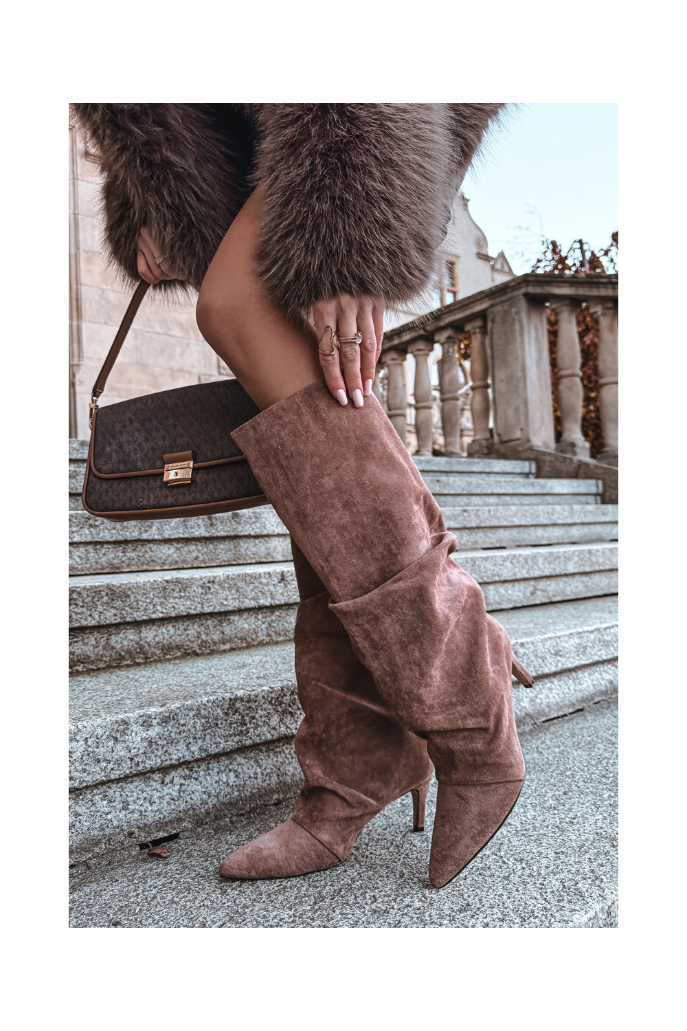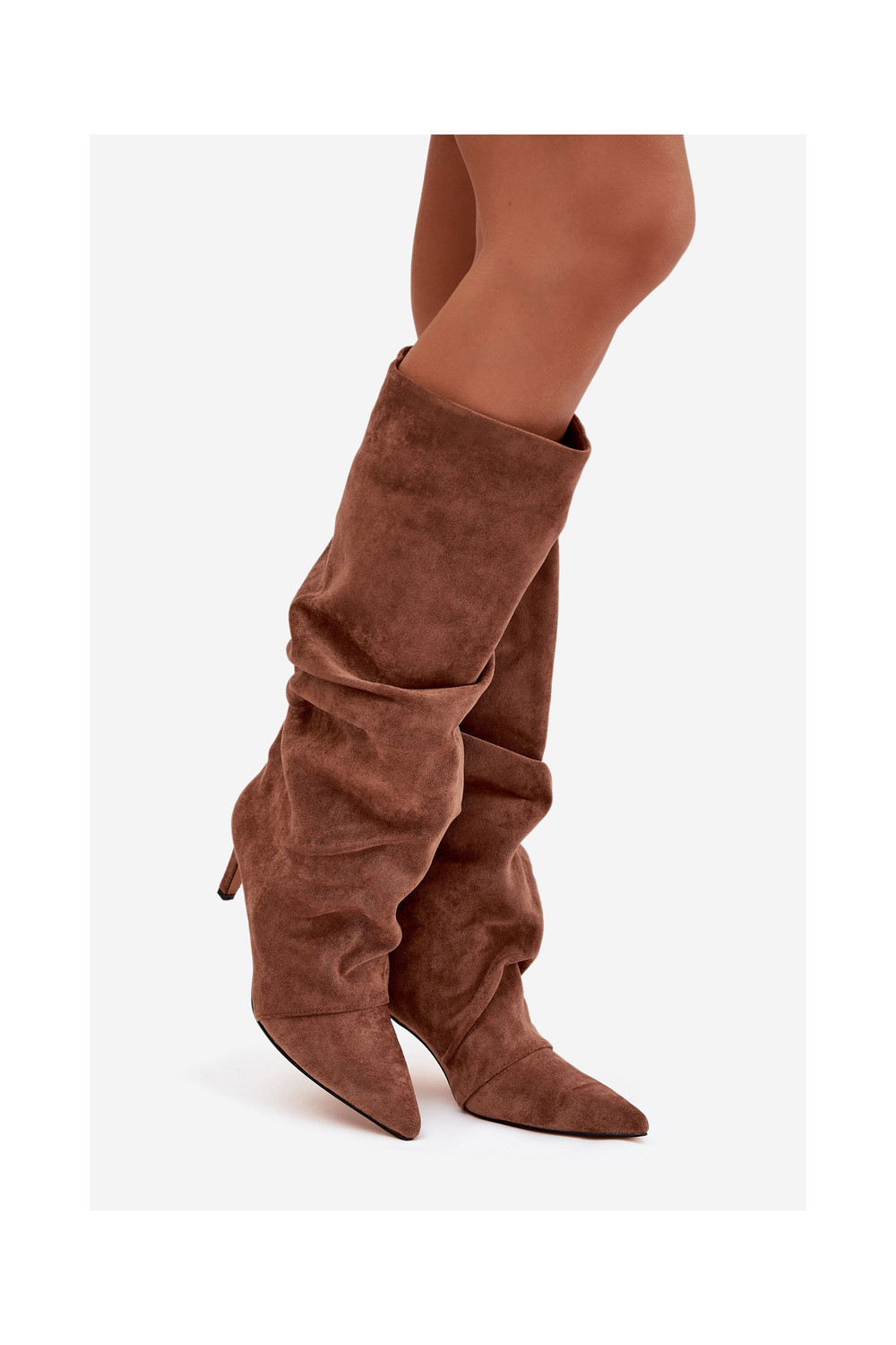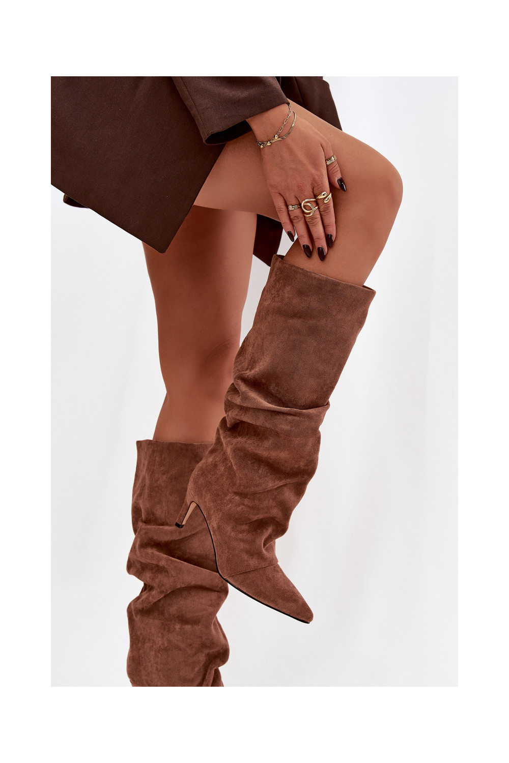 Smėlio spalvos susiraukšlėję pašiltinti ilgaauliai batai su plonais kulniukais iš dirbtinio zomšo Tai turivella