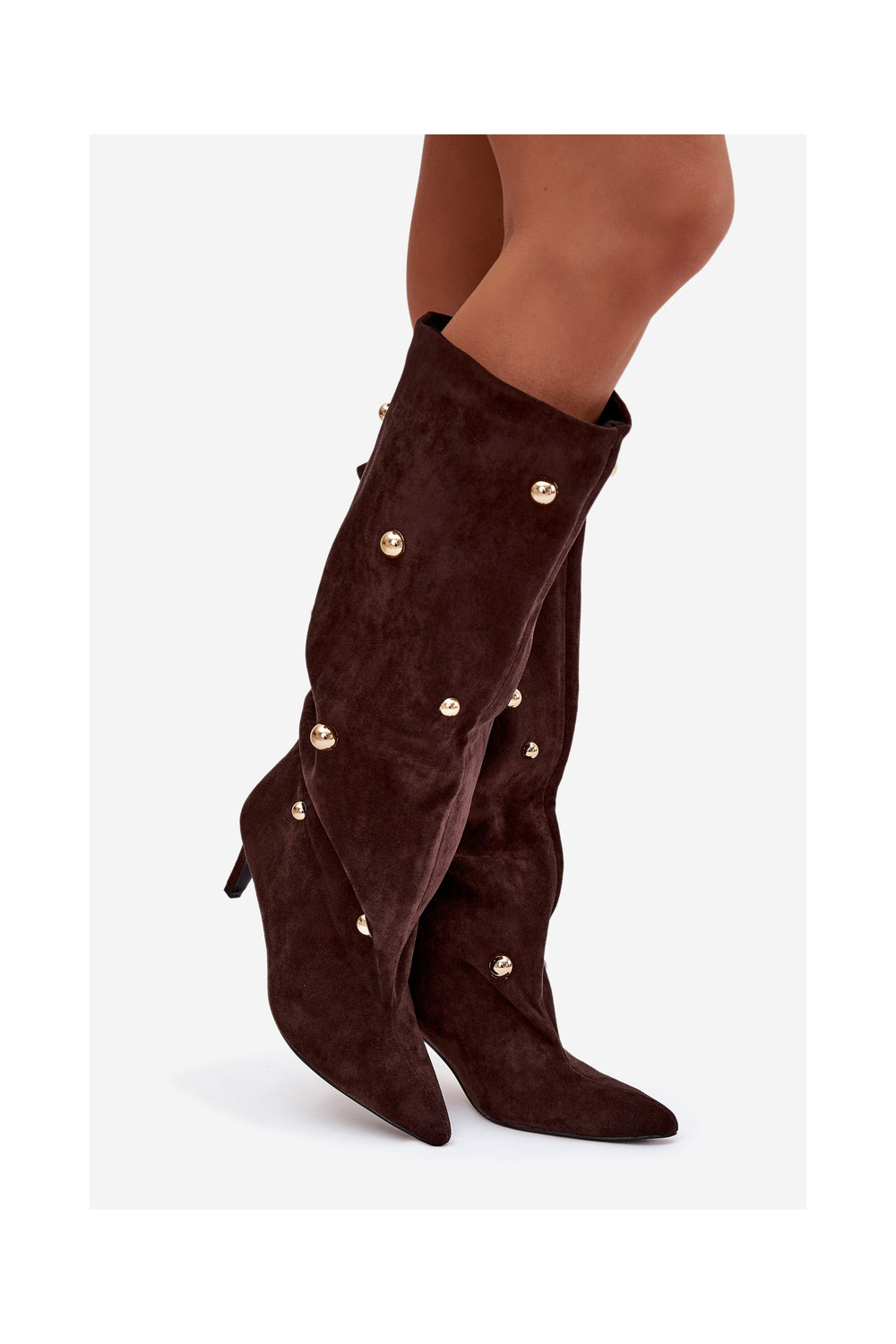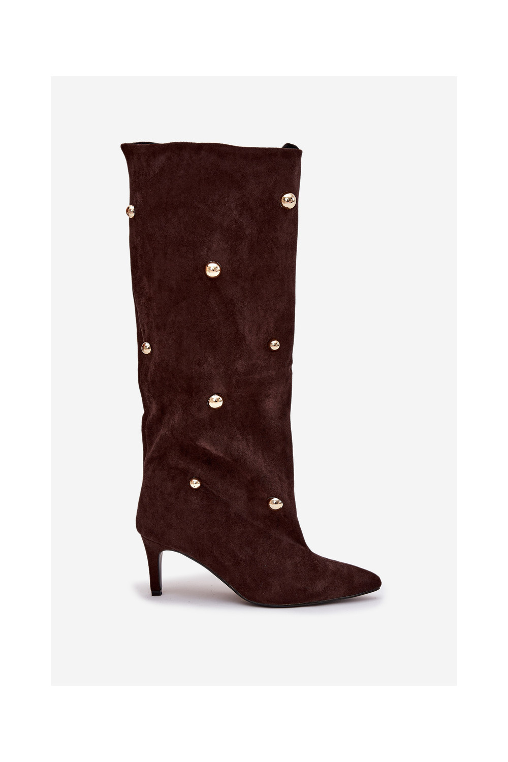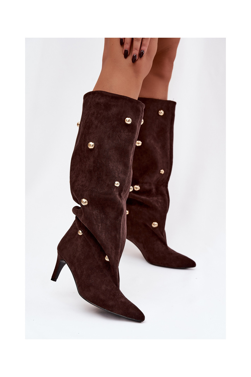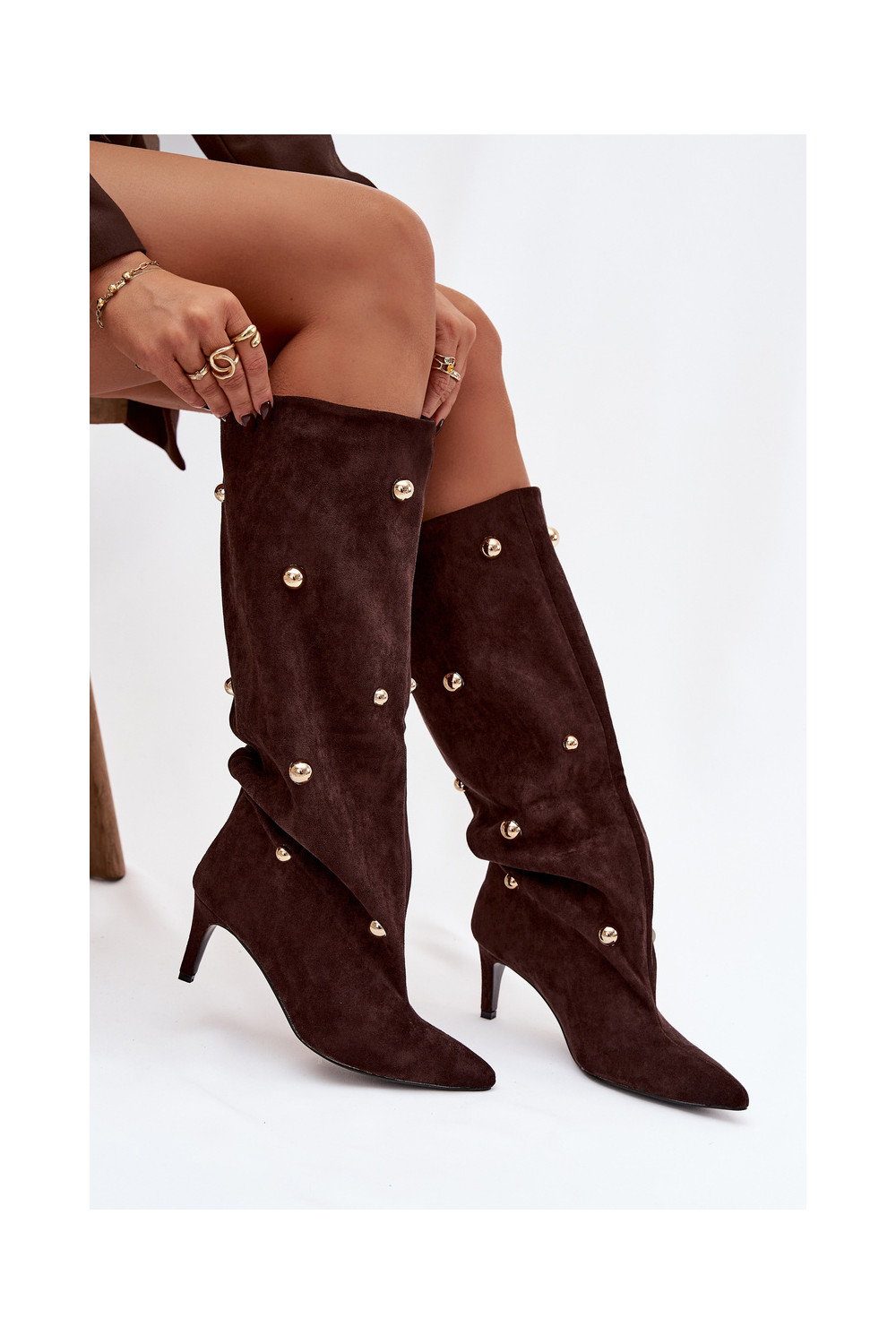 Įsispiriamo modelio moteriški ilgaauliai batai su plonais kulniukais Ze aukso spalvosmi Ozdobami CzekoladoĮe Thaliane