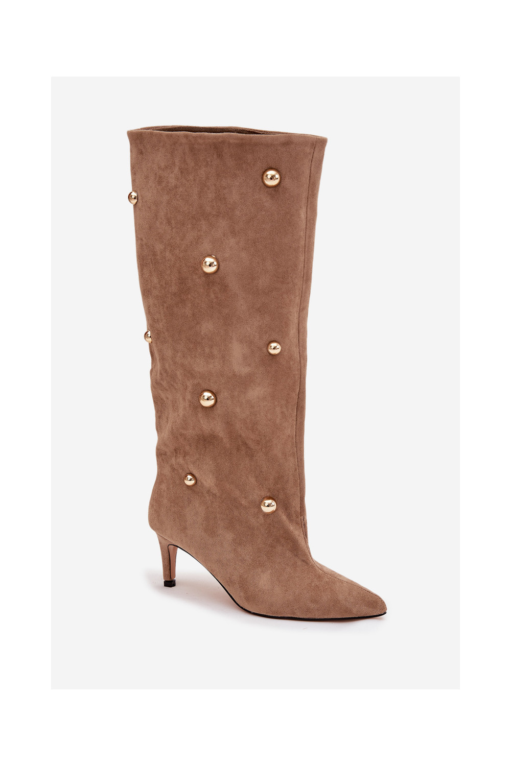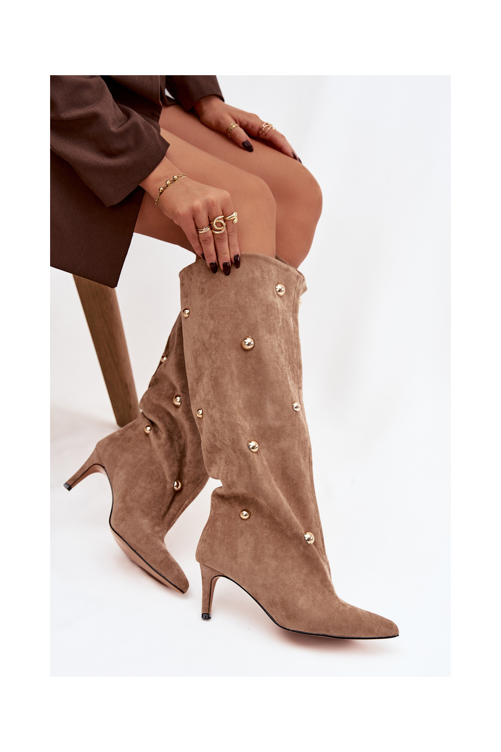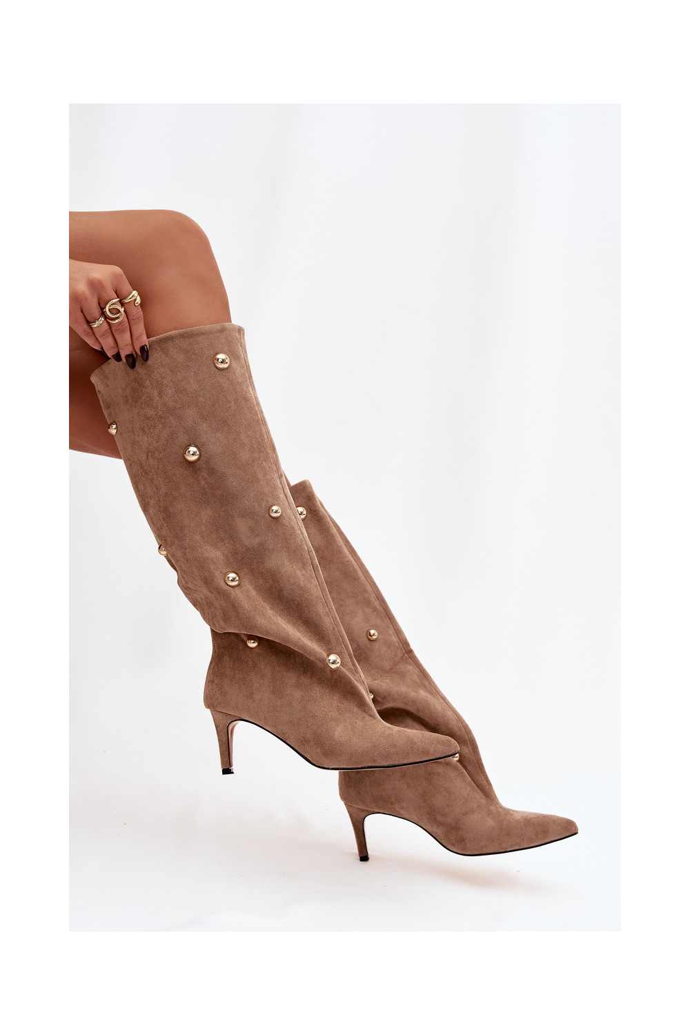 Smėlio spalvos įsispiriamo modelio moteriški ilgaauliai batai su plonais kulniukais ir aukso spalvos papuošimais Thaliane