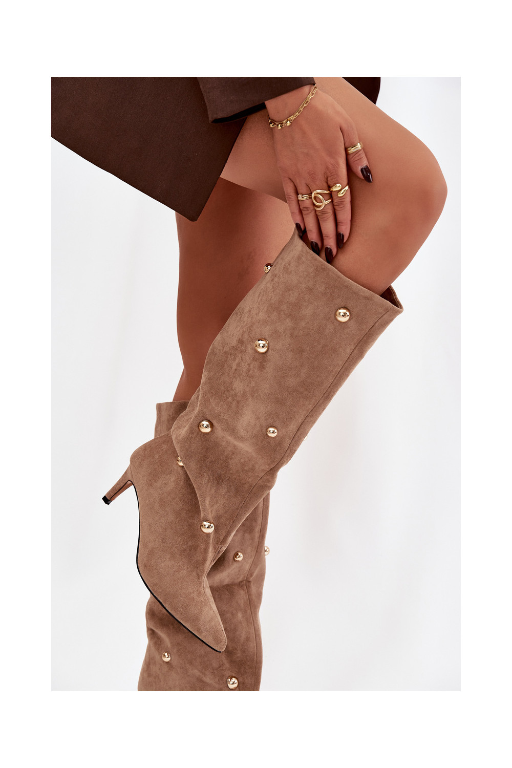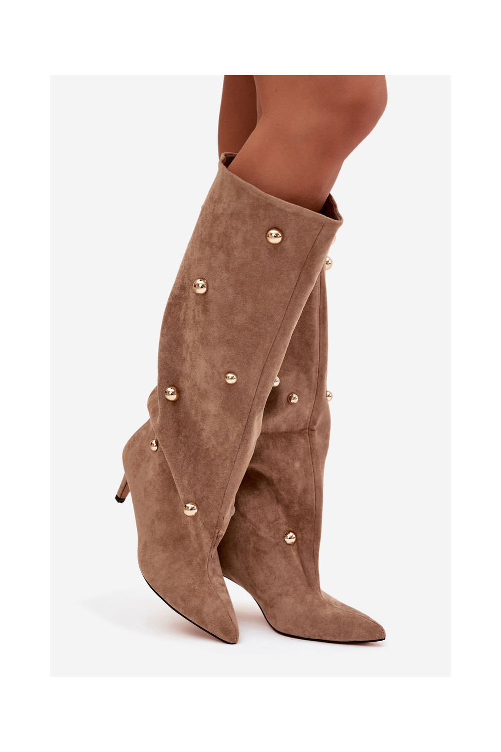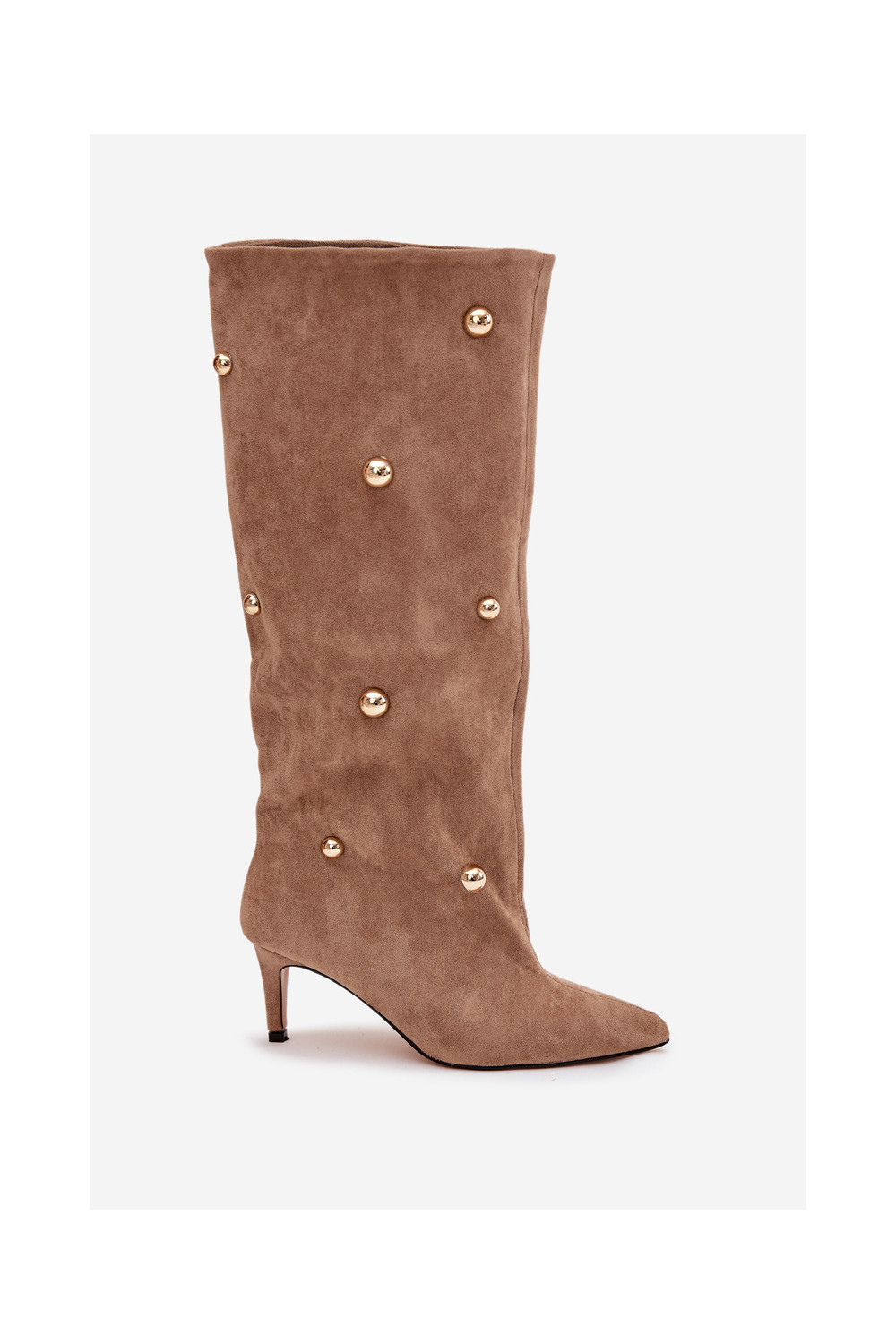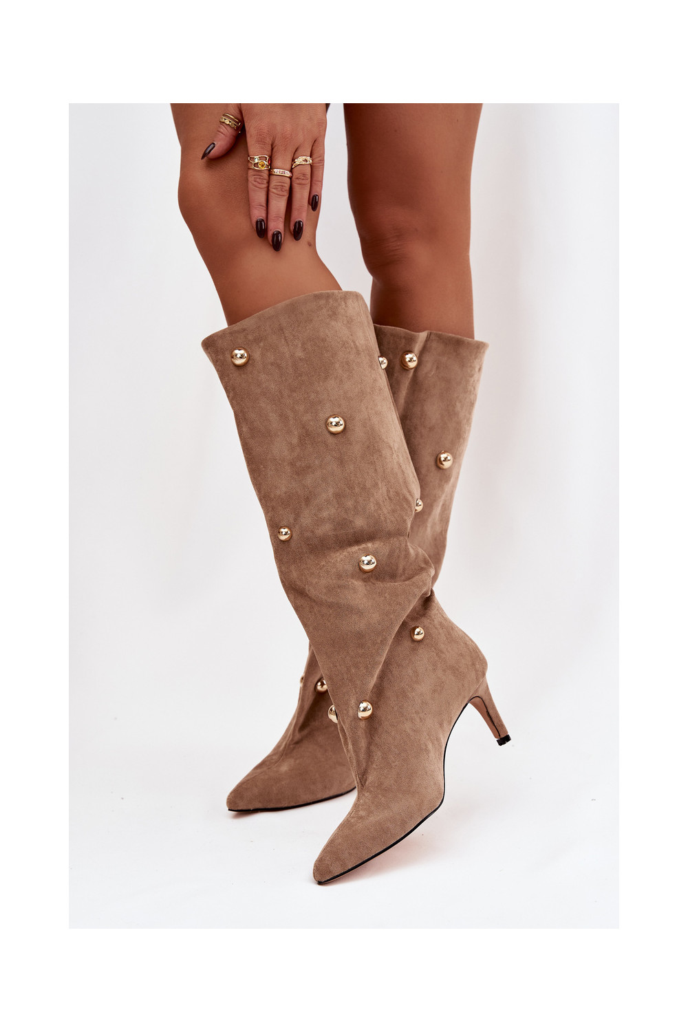Smėlio spalvos įsispiriamo modelio moteriški ilgaauliai batai su plonais kulniukais ir aukso spalvos papuošimais Thaliane