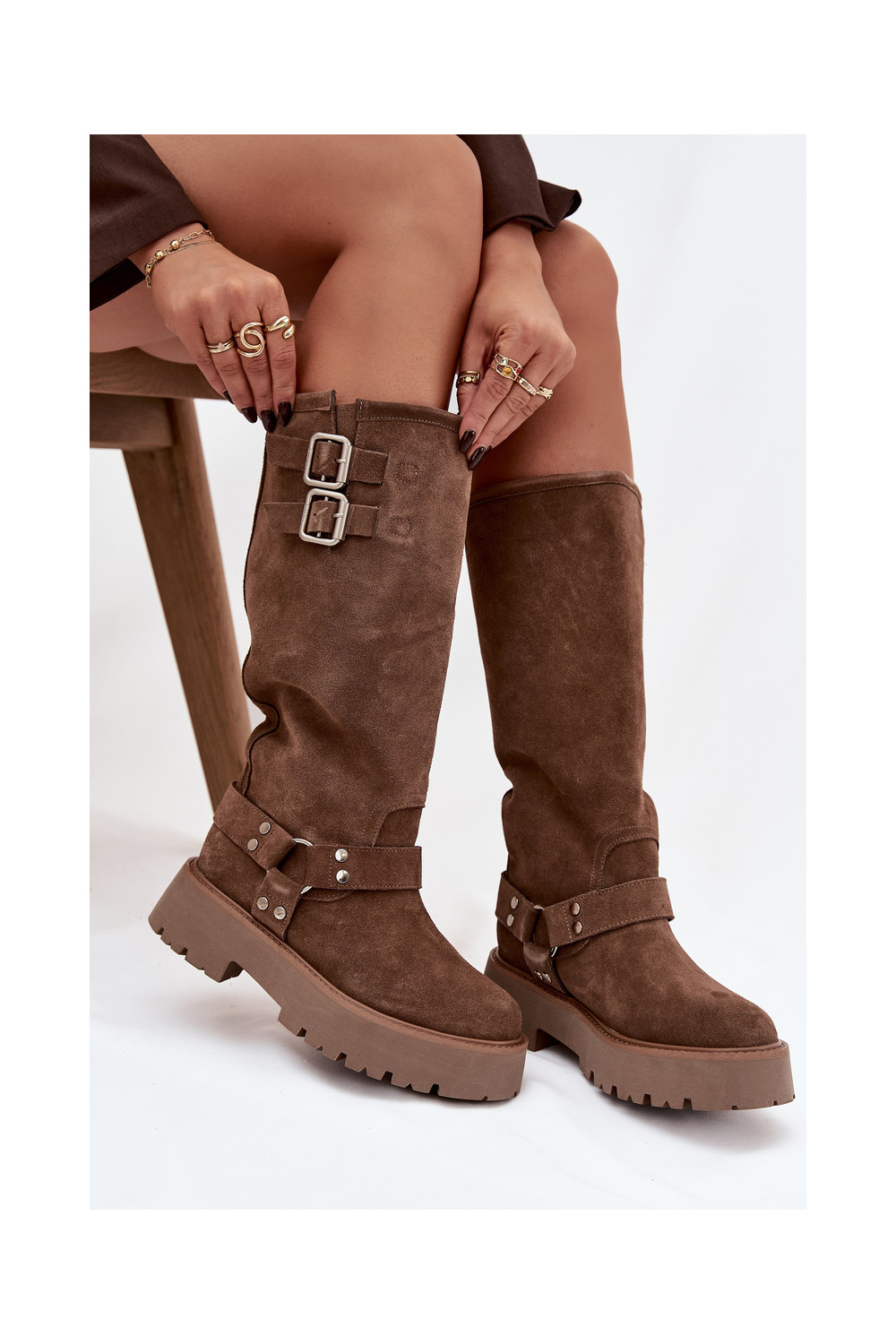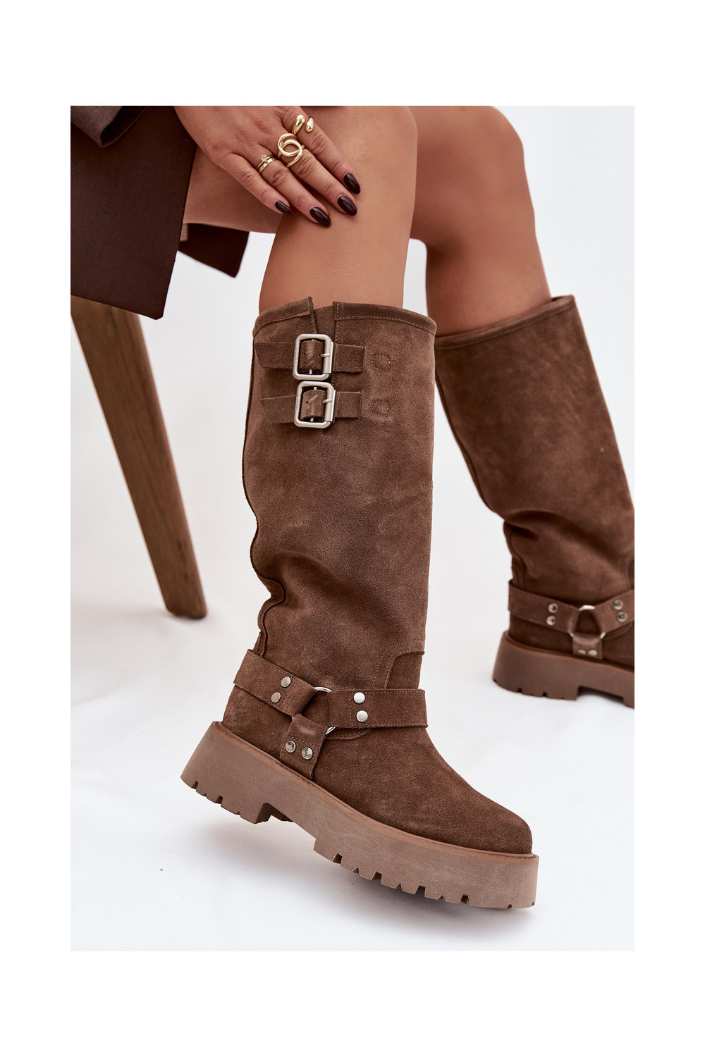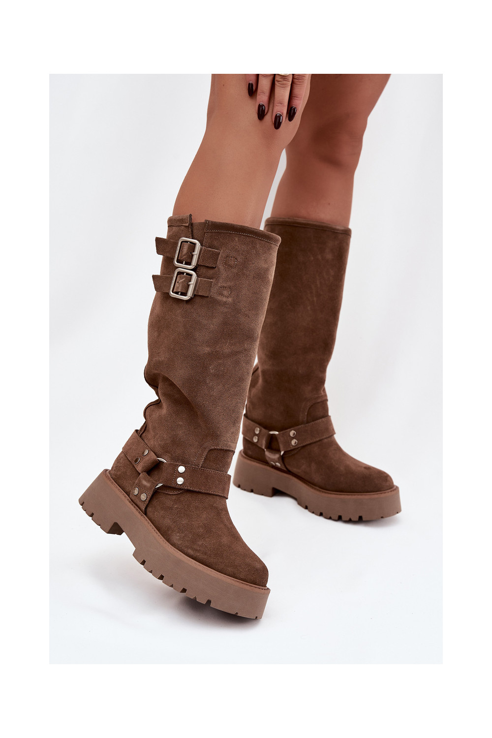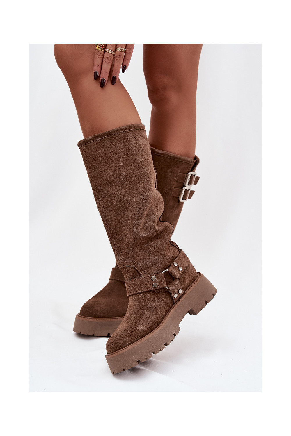 Smėlio spalvos Big Star OO274A182 pašiltinti moteriški ilgaauliai batai su sagtimis iš natūralios zomšos