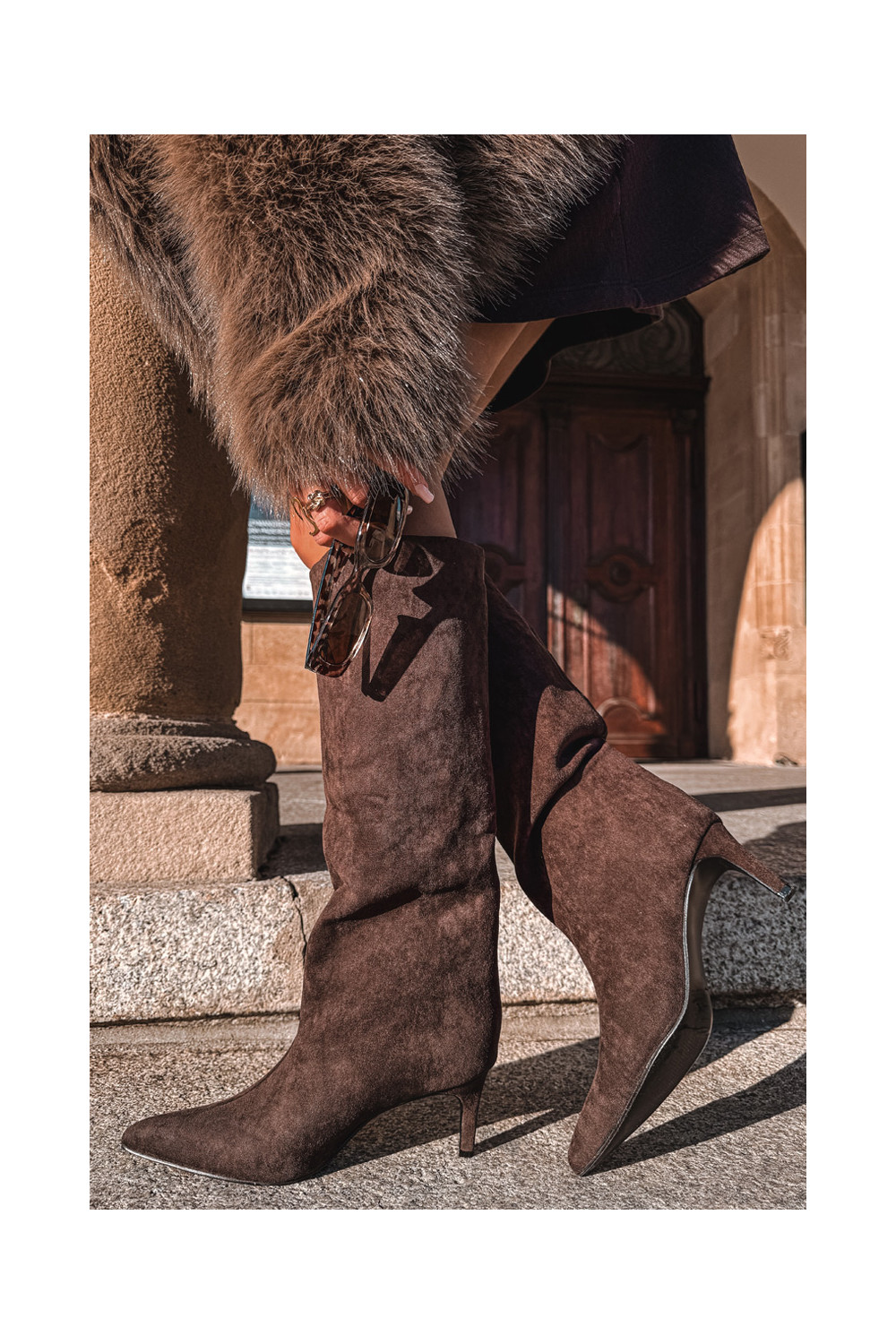 moteriški ilgaauliai batai Z iš eko zomšosu Įsispiriamo modelio su plonais kulniukais Czekoladowe Phelin