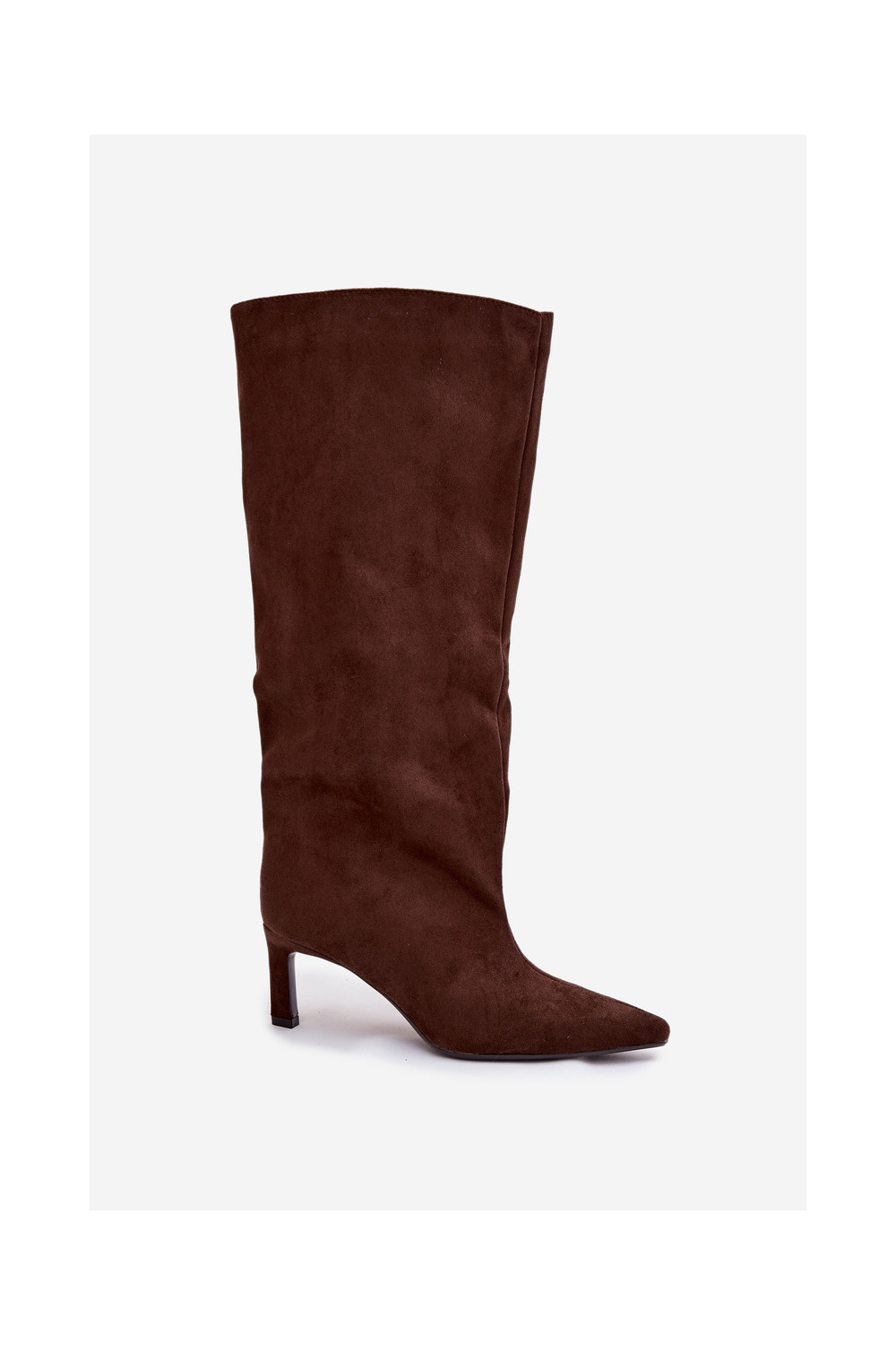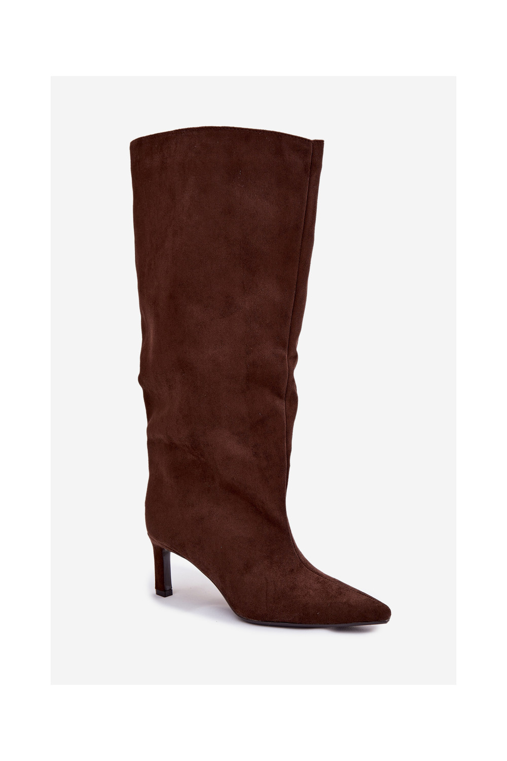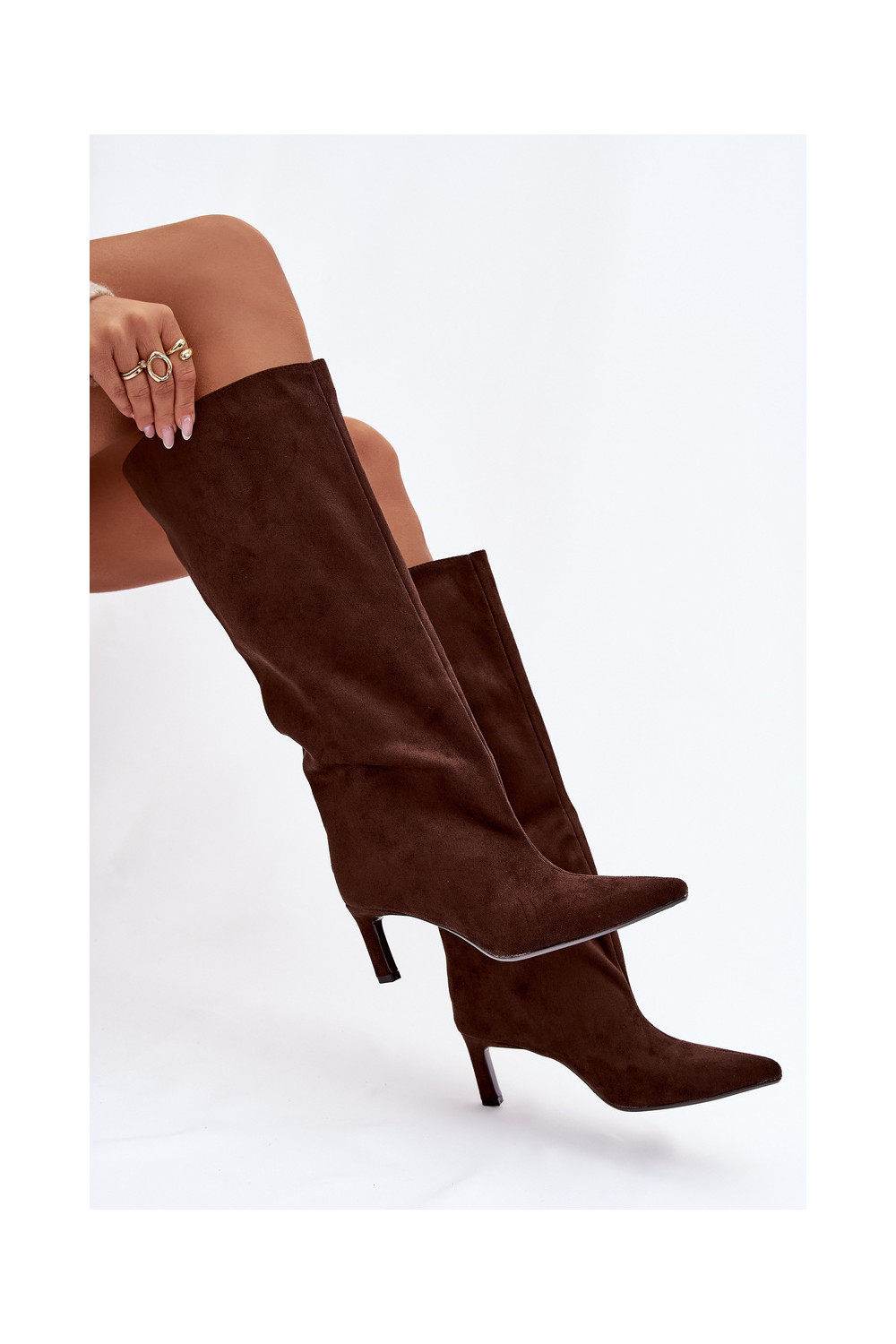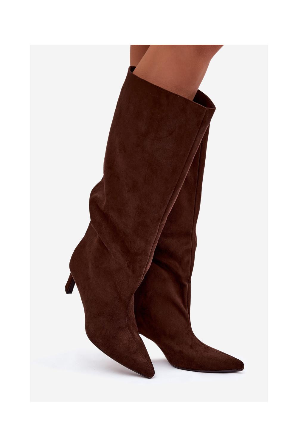 Moteriški ilgaauliai batai iš dirbtinio zomšo, įsispiriamo modelio su plonais kulniukais, šokoladinės spalvos Phelin