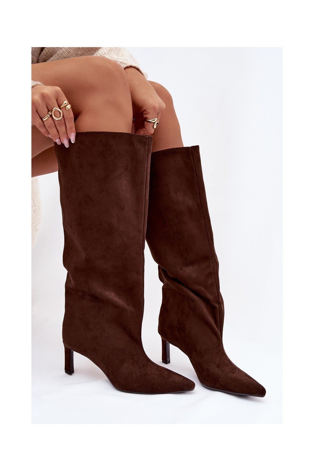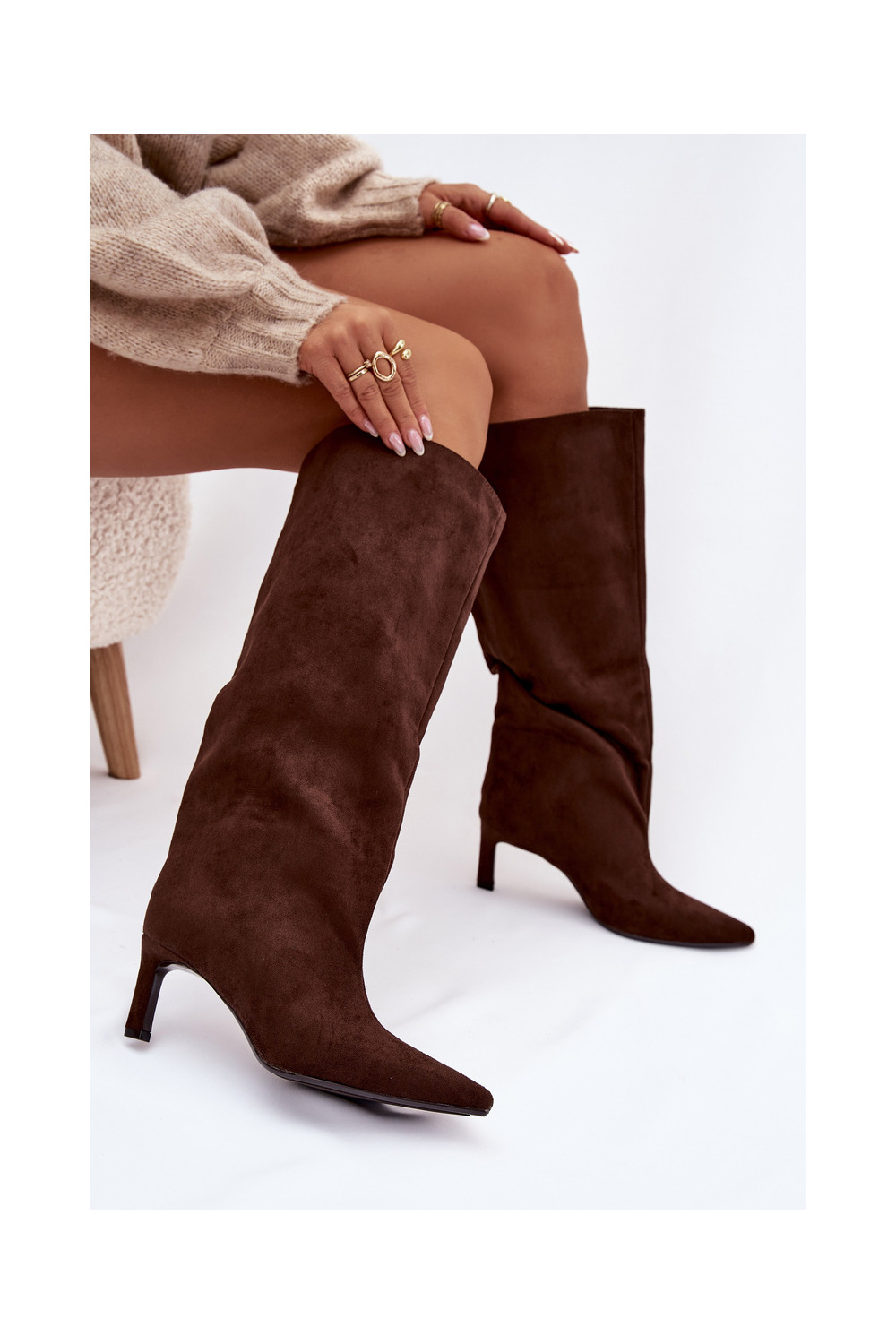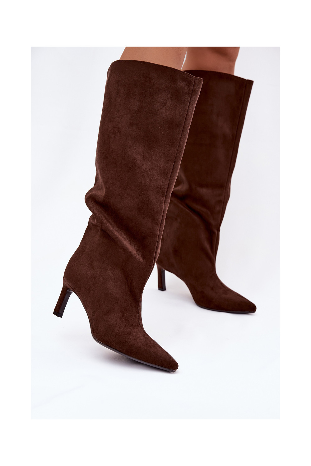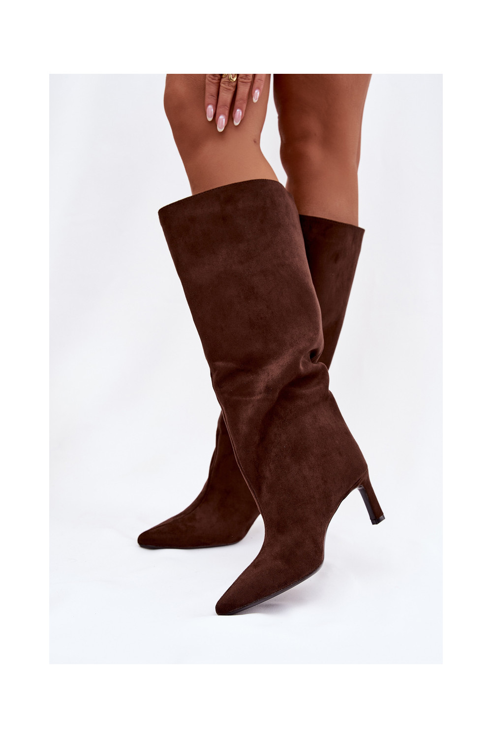 Moteriški ilgaauliai batai iš dirbtinio zomšo, įsispiriamo modelio su plonais kulniukais, šokoladinės spalvos Phelin