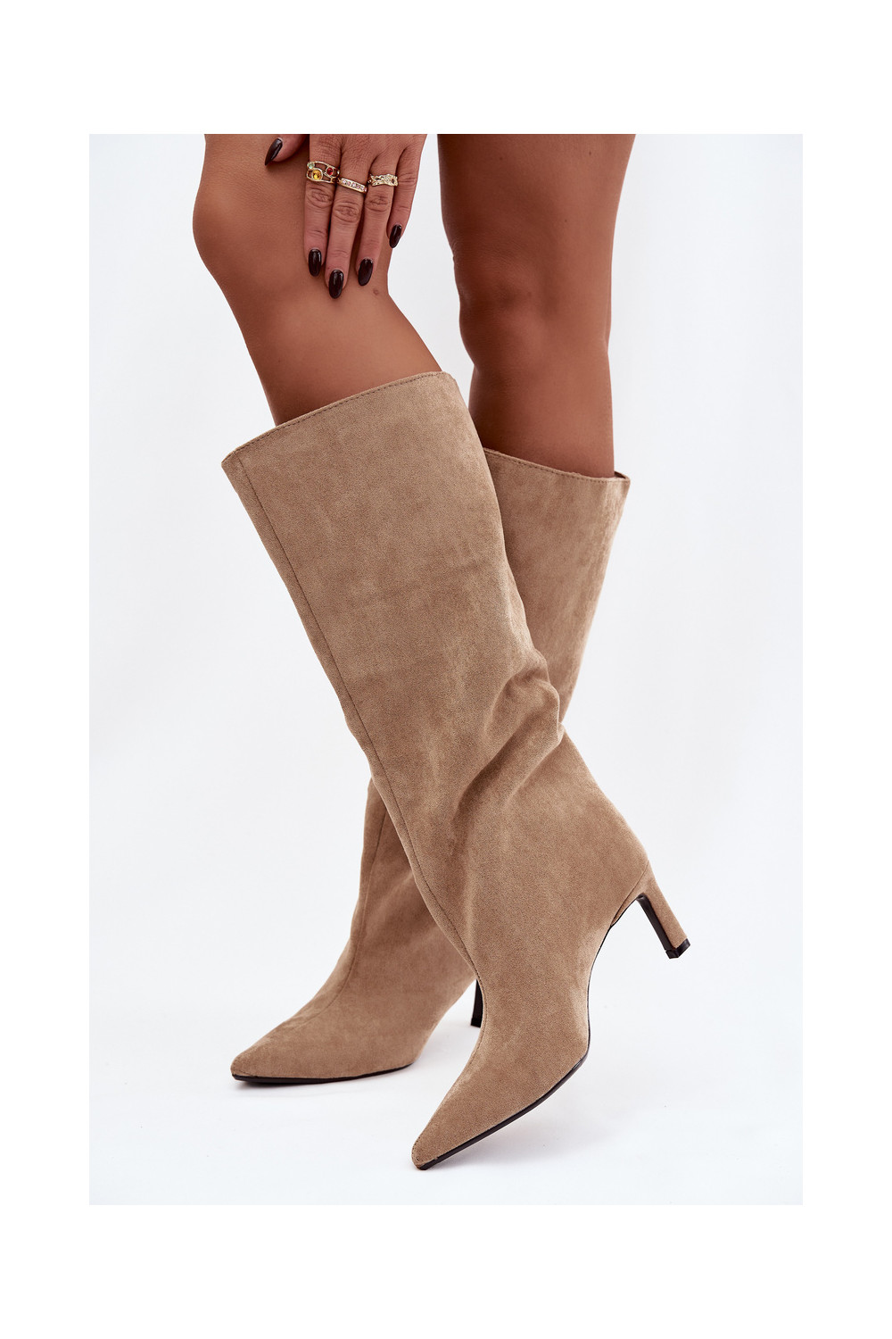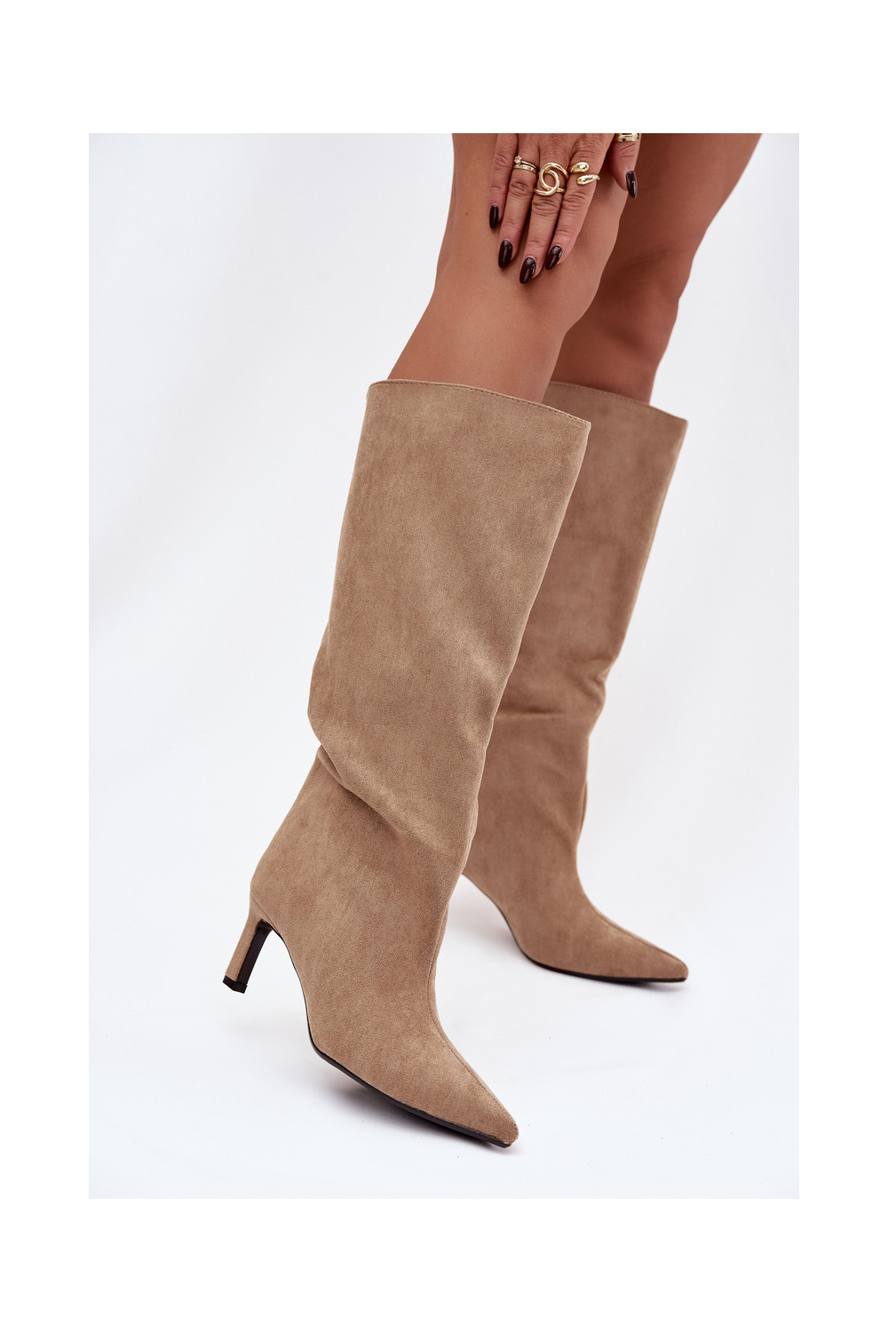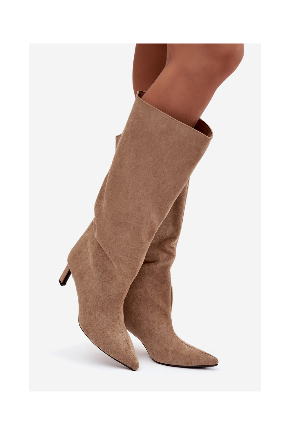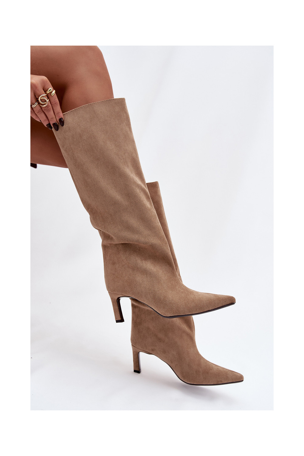 moteriški ilgaauliai batai Z iš eko zomšosu Įsispiriamo modelio su plonais kulniukais smėlio spalvos Phelin