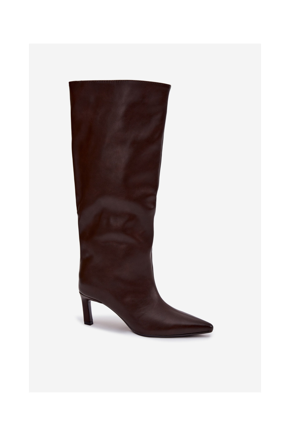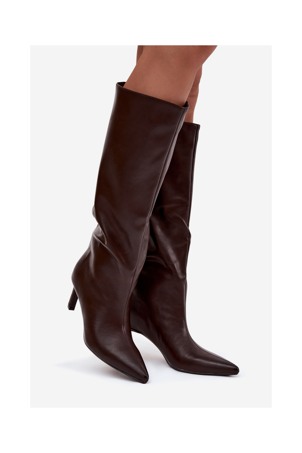 Moteriški ilgaauliai batai, įsispiriamo modelio su plonais kulniukais ir siūle, šokoladinės spalvos Olyvia