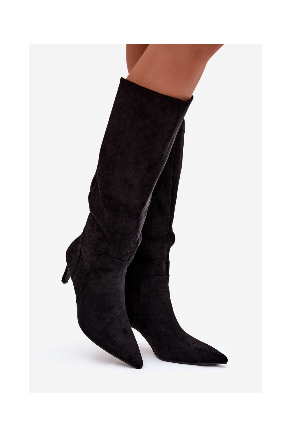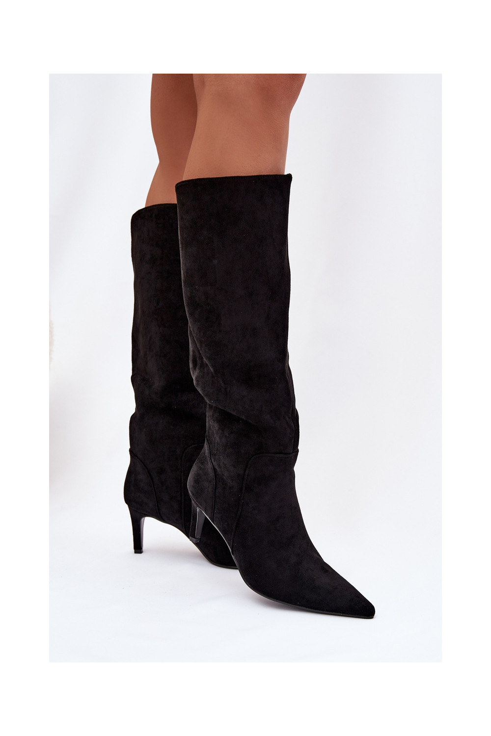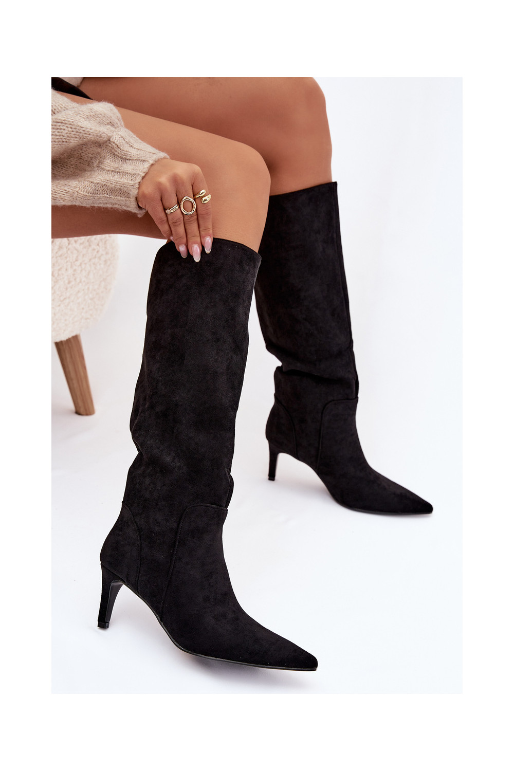 moteriški ilgaauliai batai su plonais kulniukais pašiltintisuiš eko zomšosu juodos spalvos Arelisse