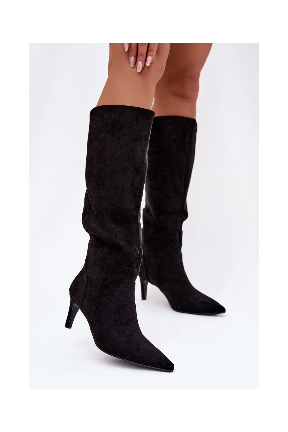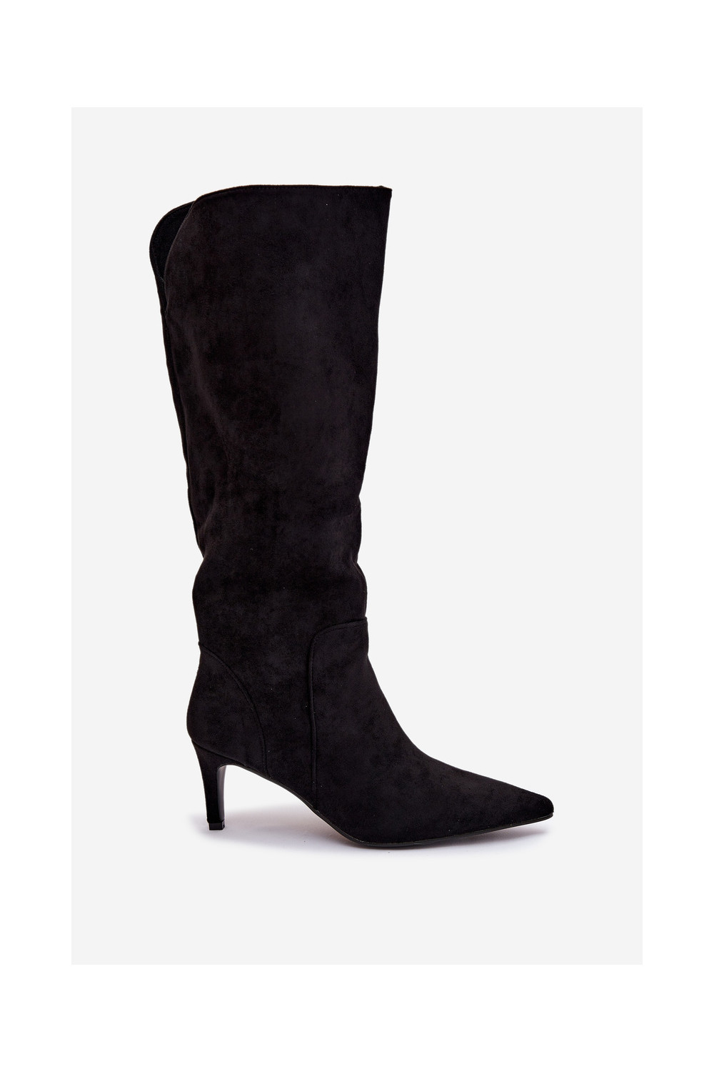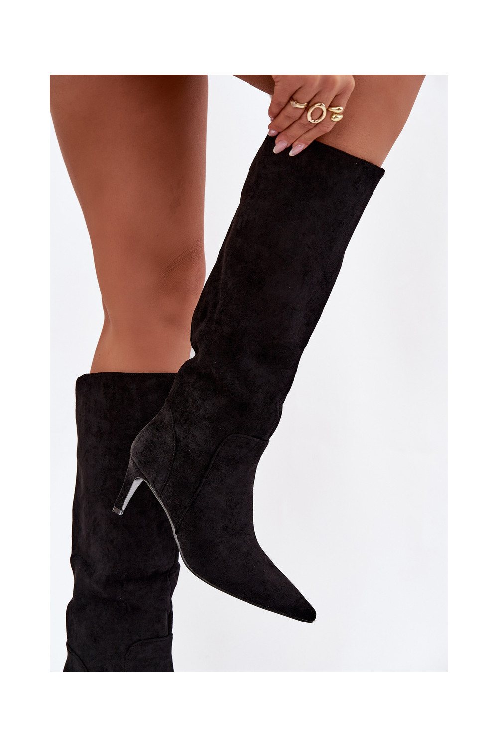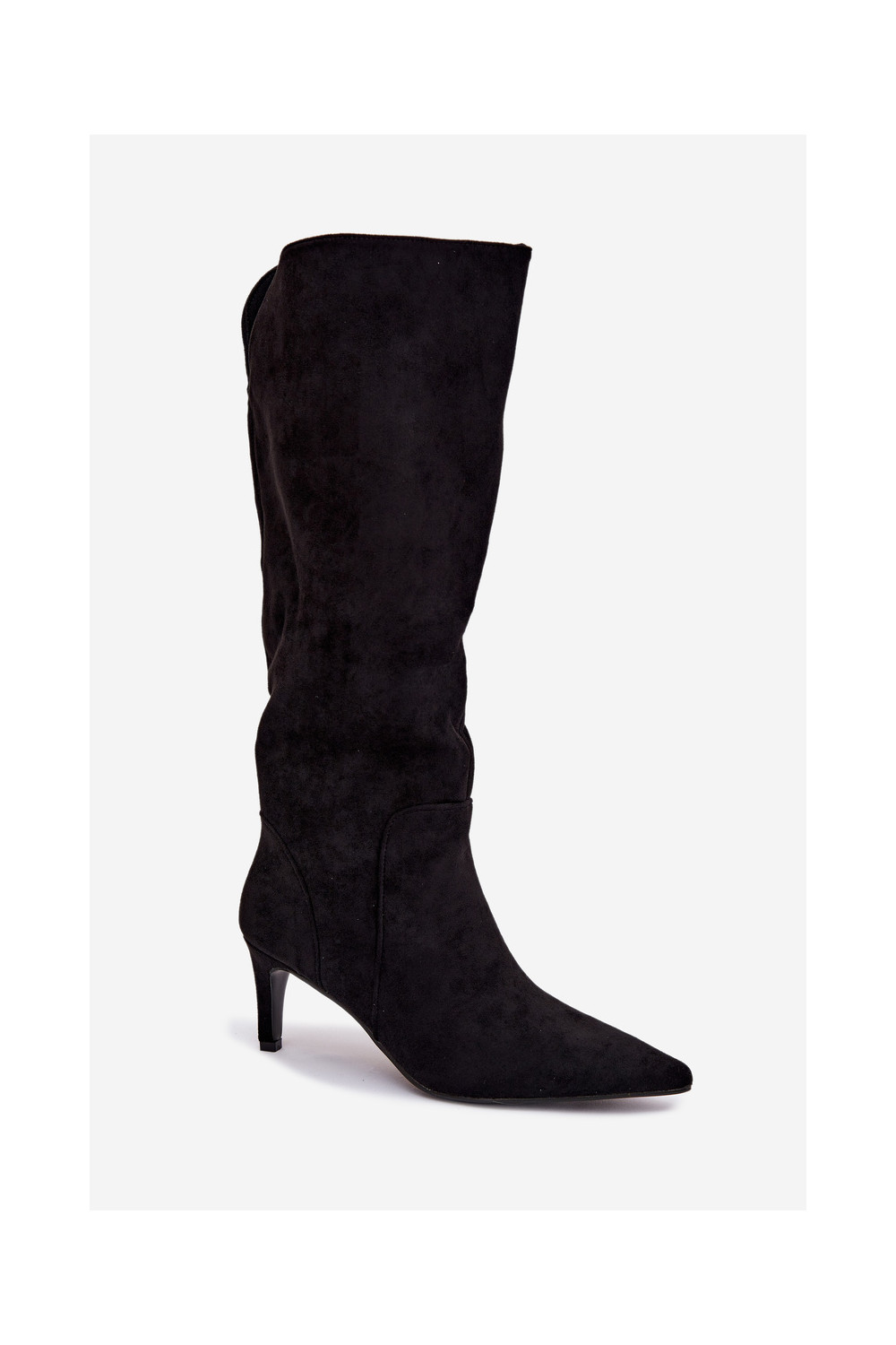 moteriški ilgaauliai batai su plonais kulniukais pašiltintisuiš eko zomšosu juodos spalvos Arelisse